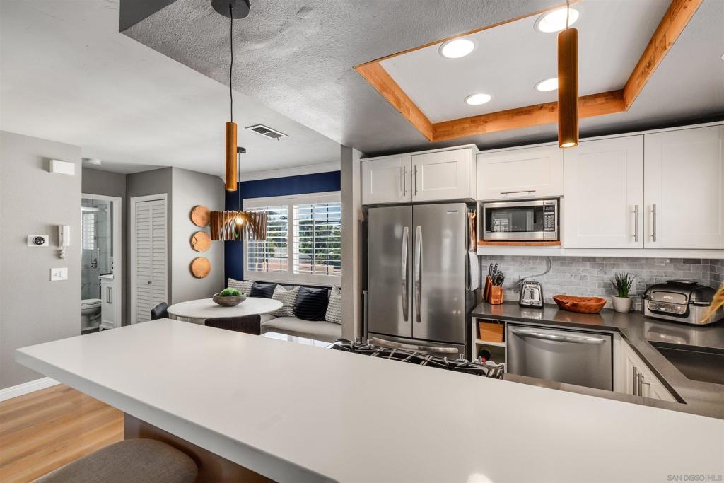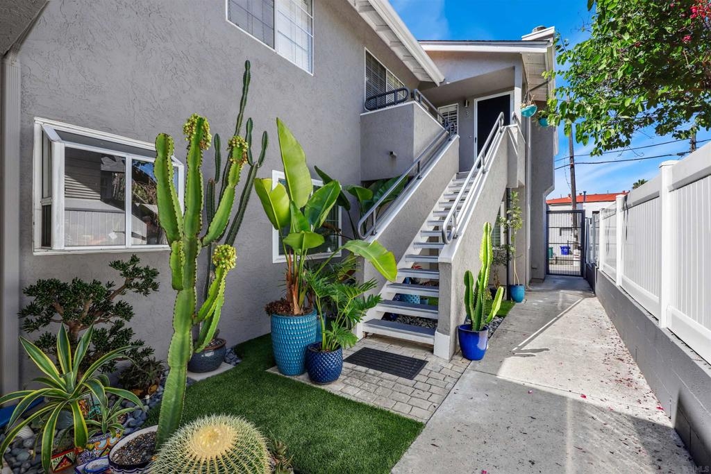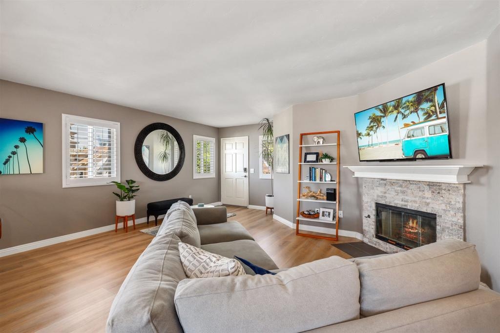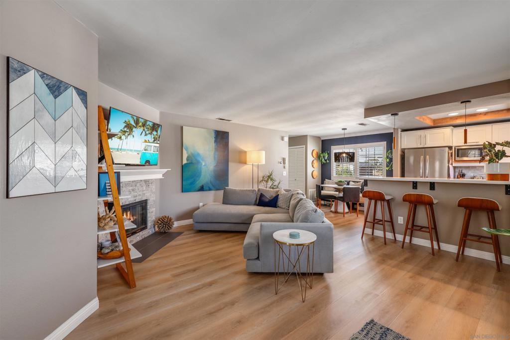 Unbelievable opportunity awaits! Enjoy this fully upgraded, top floor, corner unit that backs to a quiet alley and has LOW HOA dues. This quaint, gated complex is located on a small cul-de-sac, putting you mere blocks from all the Hillcrest amenities, while maintaining privacy. An open floor plan is illuminated with abundant natural light and provides seamless flow between the living room, dining area and kitchen. Gather in front of the cozy fireplace in the living area for added ambiance. Unbelievable opportunity awaits! Enjoy this fully upgraded, top floor, corner unit that backs to a quiet alley and has LOW HOA dues. This quaint, gated complex is located on a small cul-de-sac, putting you mere blocks from all the Hillcrest amenities, while maintaining privacy. An open floor plan is illuminated with abundant natural light and provides seamless flow between the living room, dining area and kitchen. Gather in front of the cozy fireplace in the living area for added ambiance. The kitchen has been upgraded to feature crisp, white shaker cabinetry, gorgeous countertops accented by a decorative subway tile backsplash, natural wood accents and an eat-at counter illuminated by stunning pendant lighting. Gorgeous laminate flooring and shutters throughout. In-unit laundry closet accommodates a full-size stackable washer and dryer. The bathroom has been upgraded with modern flair to feature a stunning step-in shower with tile surround and glass doors. Stay organized with your own HUGE walk in closet. Parking is a breeze with a dedicated, assigned parking space in the alley (4th space over). This turn key residence is a must see!