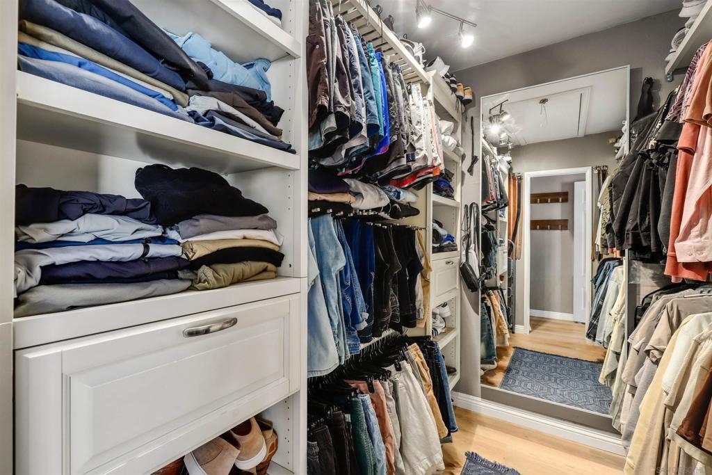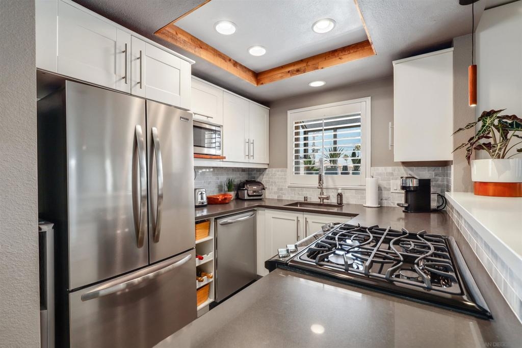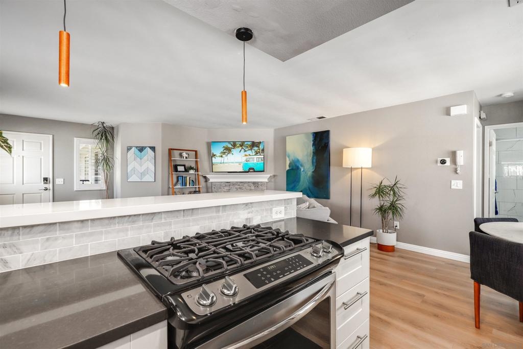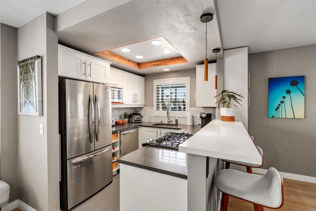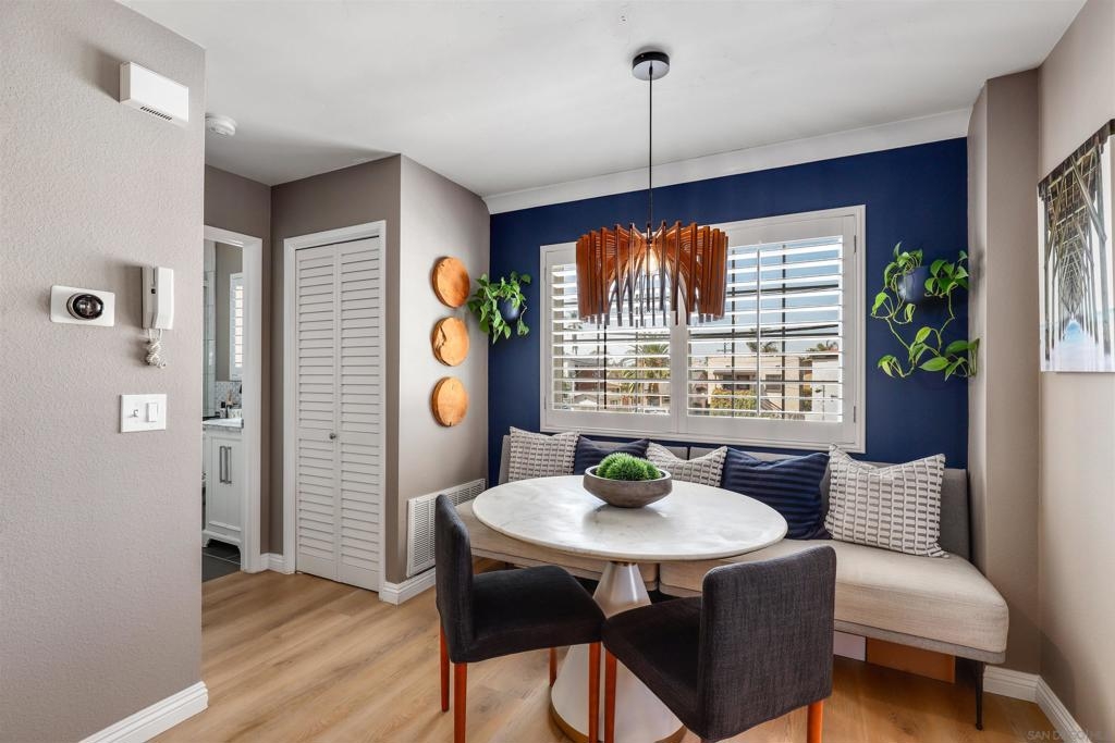 Unbelievable opportunity awaits! Enjoy this fully upgraded, top floor, corner unit that backs to a quiet alley and has LOW HOA dues. This quaint, gated complex is located on a small cul-de-sac, putting you mere blocks from all the Hillcrest amenities, while maintaining privacy. An open floor plan is illuminated with abundant natural light and provides seamless flow between the living room, dining area and kitchen. Gather in front of the cozy fireplace in the living area for added ambiance. Unbelievable opportunity awaits! Enjoy this fully upgraded, top floor, corner unit that backs to a quiet alley and has LOW HOA dues. This quaint, gated complex is located on a small cul-de-sac, putting you mere blocks from all the Hillcrest amenities, while maintaining privacy. An open floor plan is illuminated with abundant natural light and provides seamless flow between the living room, dining area and kitchen. Gather in front of the cozy fireplace in the living area for added ambiance. The kitchen has been upgraded to feature crisp, white shaker cabinetry, gorgeous countertops accented by a decorative subway tile backsplash, natural wood accents and an eat-at counter illuminated by stunning pendant lighting. Gorgeous laminate flooring and shutters throughout. In-unit laundry closet accommodates a full-size stackable washer and dryer. The bathroom has been upgraded with modern flair to feature a stunning step-in shower with tile surround and glass doors. Stay organized with your own HUGE walk in closet. Parking is a breeze with a dedicated, assigned parking space in the alley (4th space over). This turn key residence is a must see!