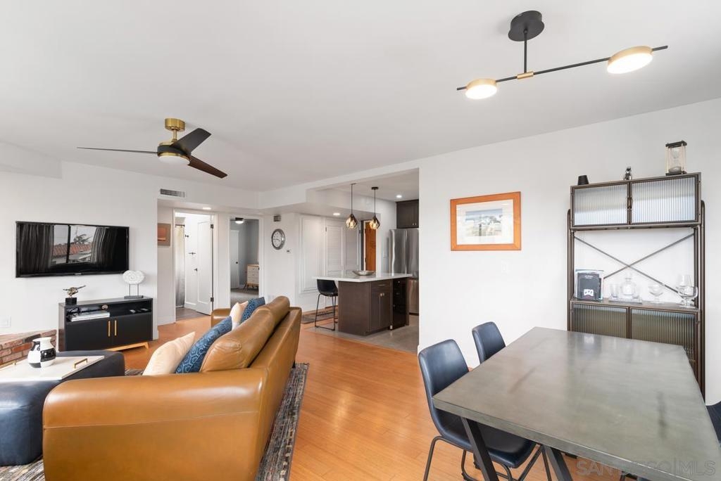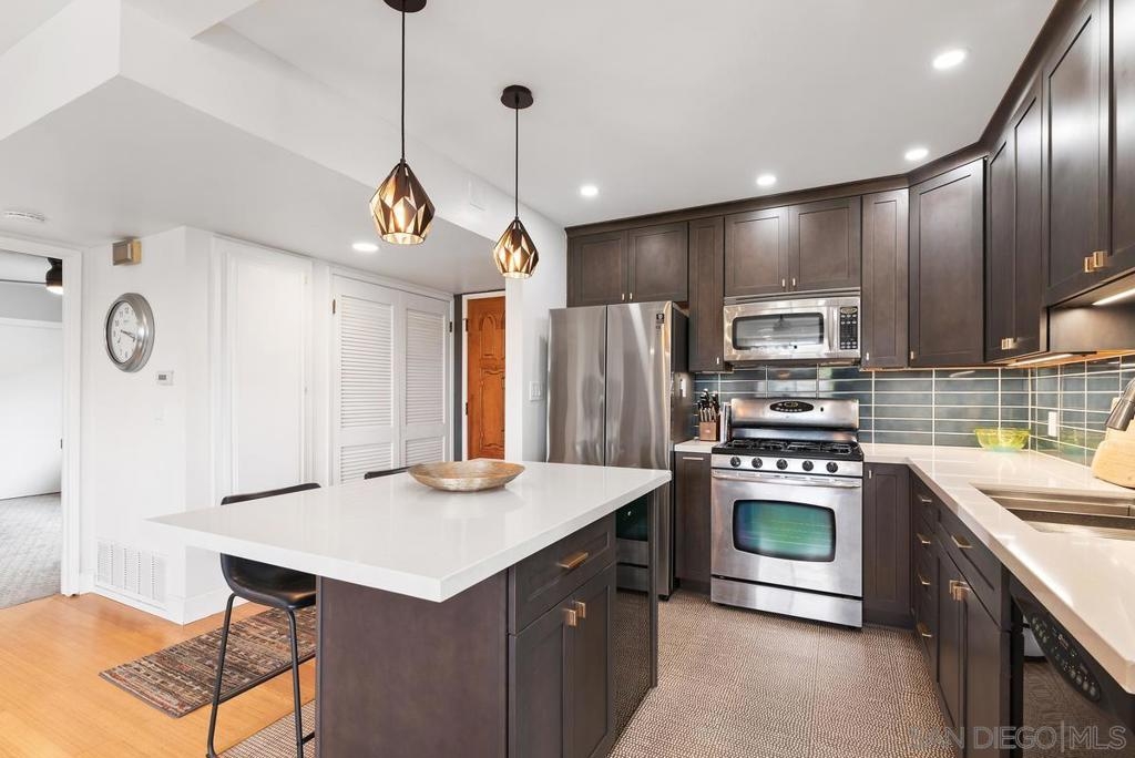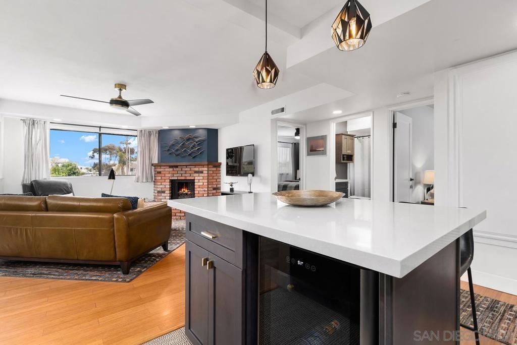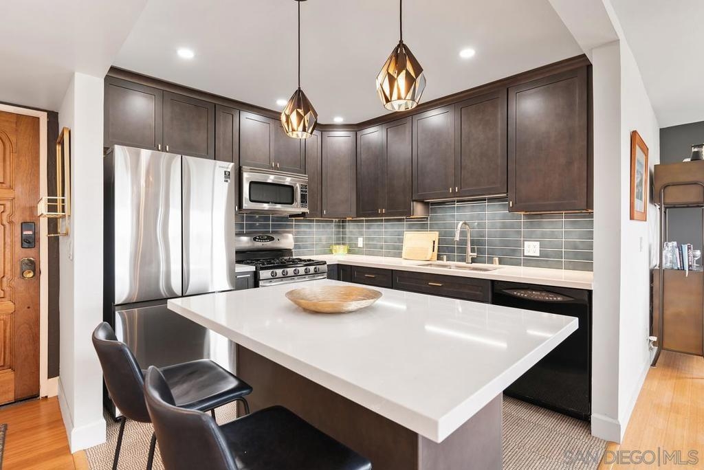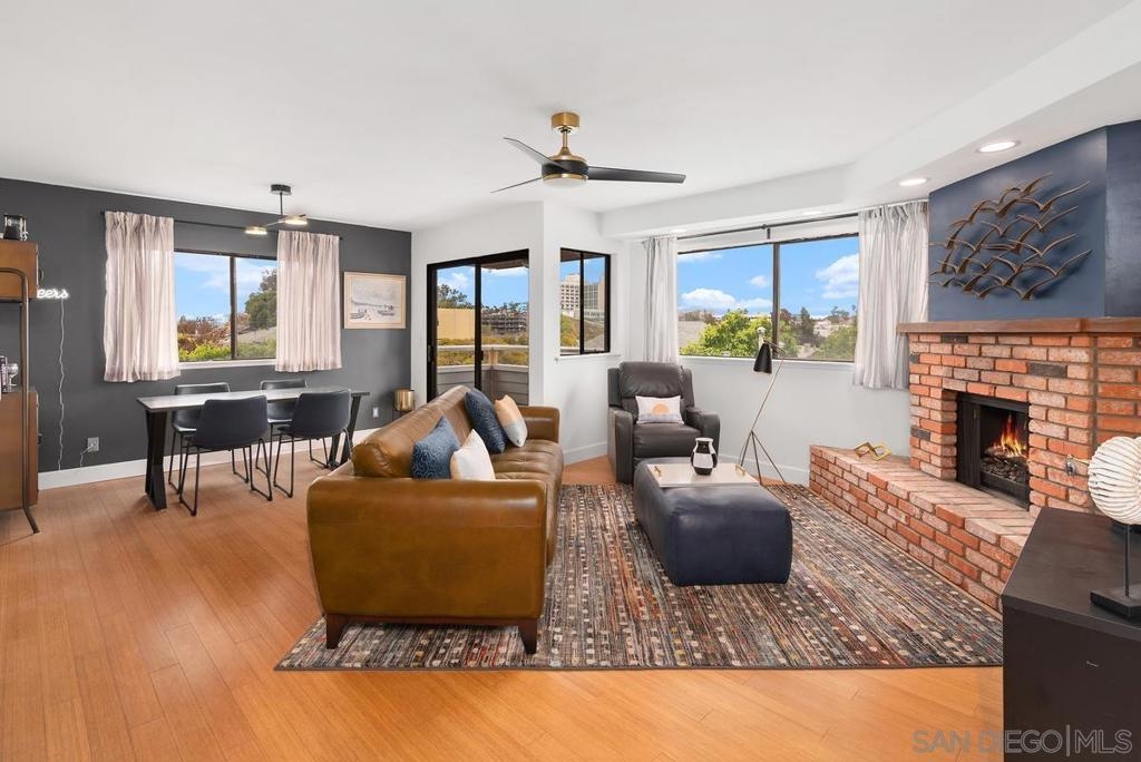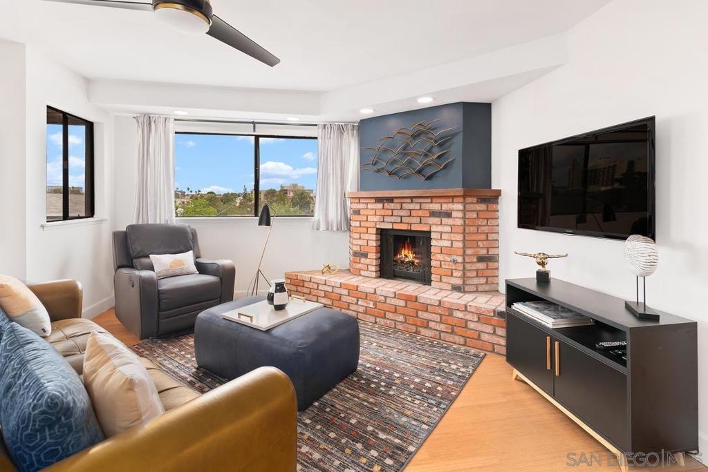 Located on the top floor, this turnkey corner unit is arguably one of THE BEST locations in the complex. Stylish and sophisticated 2 bedroom 2 bath home with 2 gated garage parking spaces in the heart of Mission Hills. Positioned at the rear of the building, and opposite the street, your new home offers a quiet lifestyle, city and tree-top views and yet, it is just steps away from many of San Diego’s best restaurants, cafés, bars, grocery stores (Lazy Acres & Vons), yoga and so much more. This special home has been completely remodeled featuring a newer kitchen, newer bathrooms, fixtures, lighting, flooring, and smooth-finished ceilings. You will enjoy entertaining in your open-concept kitchen with stainless steel appliances, gorgeous cabinets, a wine refrig. and an island that opens to the living and dining room. The cozy gas fireplace and your new private patio will add elegance and comfort to your next dinner party. The primary bedroom is spacious and features a beautifully remodeled bathroom with a walk-in shower. The second bedroom is perfect for a home office or guest suite. Both bathrooms have a large skylight for additional light and fresh air. In-unit washer and dryer & all appliances convey. Underground gated garage parking with two parking spots (NOT tandem) and storage. The homeowner's fee includes water and trash. The complex is gated as is the parking. Mission Hills is an extremely desirable neighborhood known for its walkability and sophisticated urban vibe. Don't miss this opportunity to own in one of San Diego’s most sought-after neighborhoods.