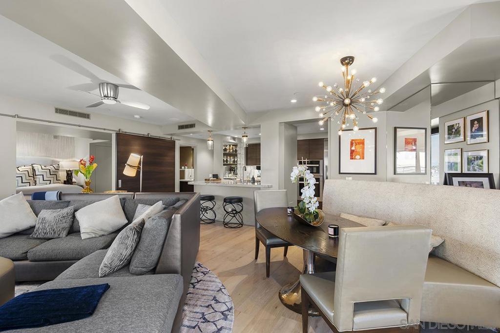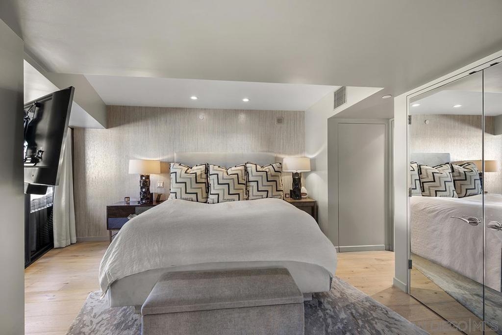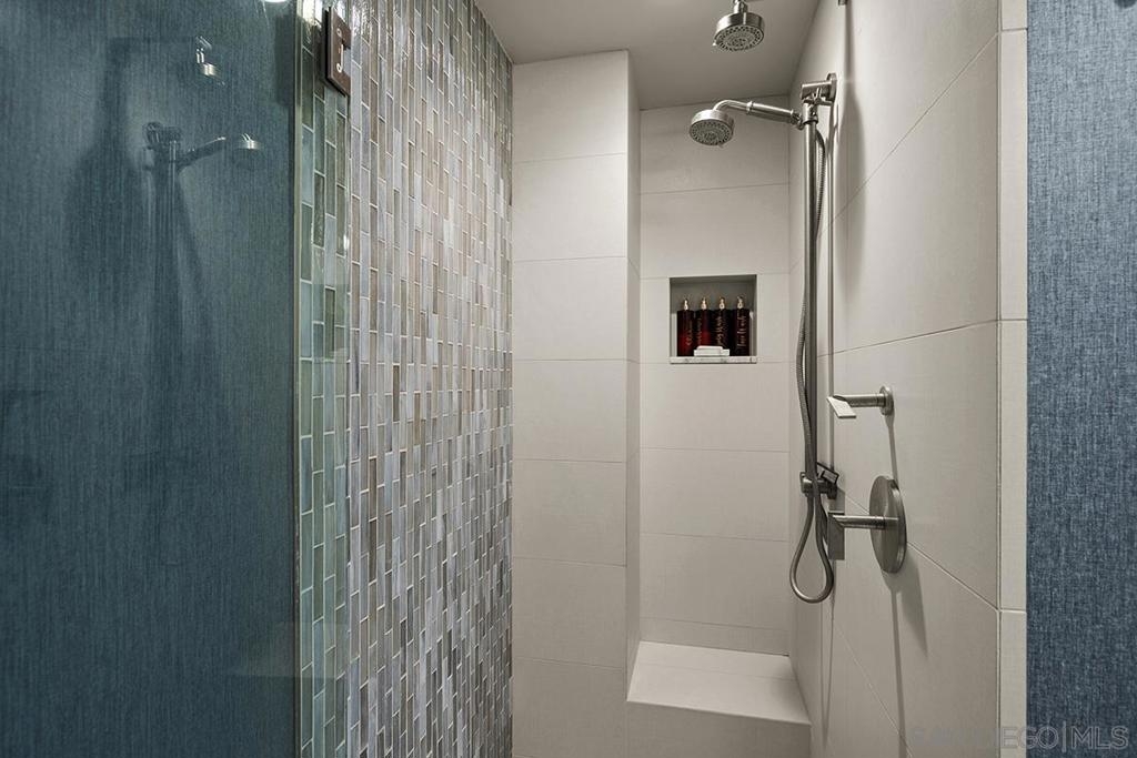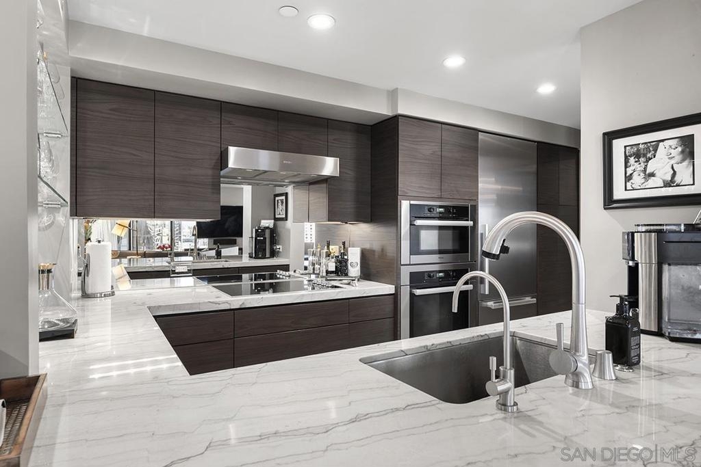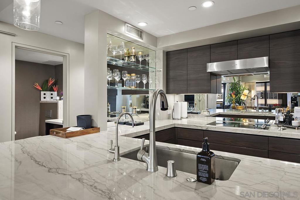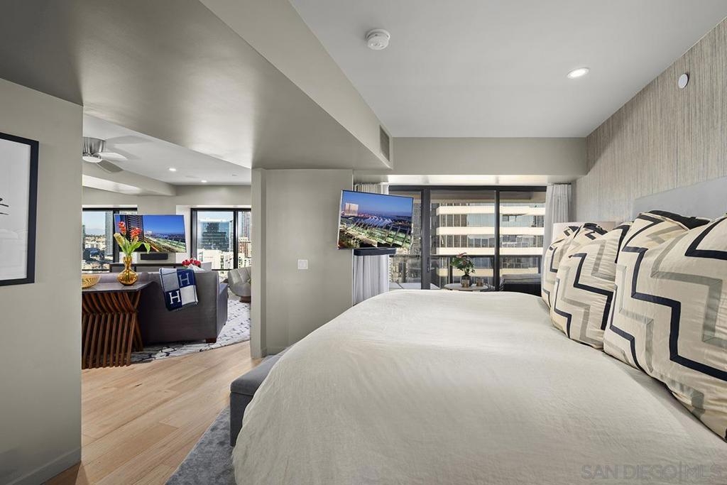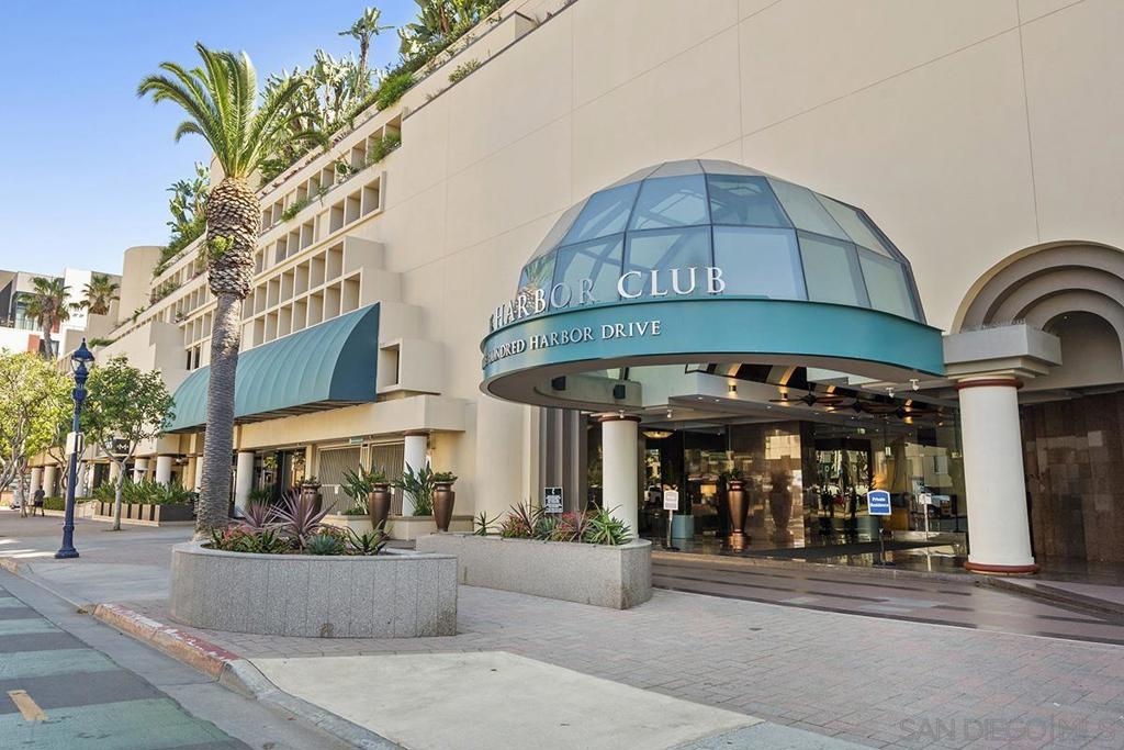 This is the finest 1-bedroom "re-imagined" condo ever seen in the Harbor Club; fully remodeled practically down to the studs! This beautifully curated residence offers a rare blend of luxury, privacy, and prime Marina District living plus one of the few with 1.5 bathrooms to boot. Positioned high enough to rise above neighboring buildings, the home captures sweeping views of the San Diego Bay and the iconic Coronado Bridge through walls of windows flooding the residence with natural light. The professionally decorated interior shows a sleek, modern kitchen appointed with high-end appliances, European-style cabinetry, mirrored backsplash, slab porcelain island, beverage chiller, and an eat-at bar accented by elegant drop lighting making it perfect for both everyday living and entertaining. The primary suite is a serene retreat featuring balcony access, a custom wall treatment, a new built-in closet, and a spa-inspired ensuite bathroom with dual vanity and a step-in rain shower with an additional handheld shower head. Rare for a one-bedroom residence, this home also offers a separate powder room, adding both convenience and sophistication for guests. Additional highlights include a French Oak hardwood flooring, Smart-controlled lighting, built-in sound system throughout, and a secure parking space with EV charger. This is truly a standout opportunity in the heart of the Marina District and luxury urban living at its finest. Residents of the Harbor Club are treated to an array of lavish, resort-inspired amenities that encompass a round-the-clock front desk service, a state-of-the-art gymnasium, an exquisite pool deck, a sociable club room, and a versatile library/business center, among numerous other perks. Nestled in the much-coveted Marina District, the Harbor Club boasts unparalleled ease in traversing the neighborhood on foot, granting effortless access to an array of transportation options, delectable dining establishments, retail therapy, the iconic ballpark, the pulsating Gaslamp Quarter, the artsy East Village, and the scenic Embarcadero – an idyllic setting for serene walks alongside the bay