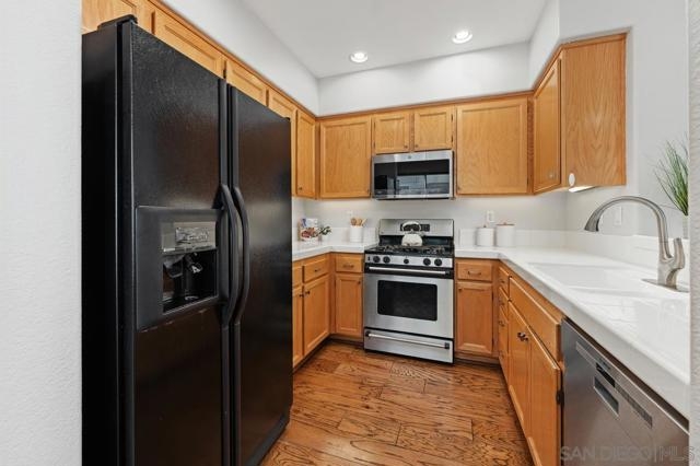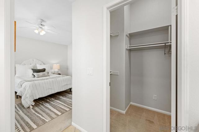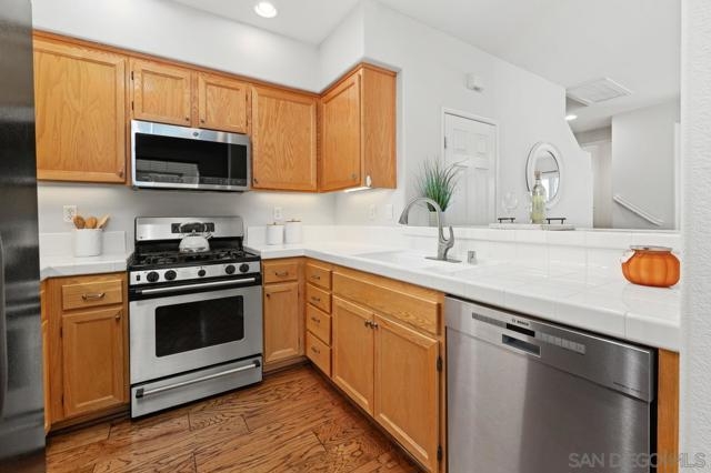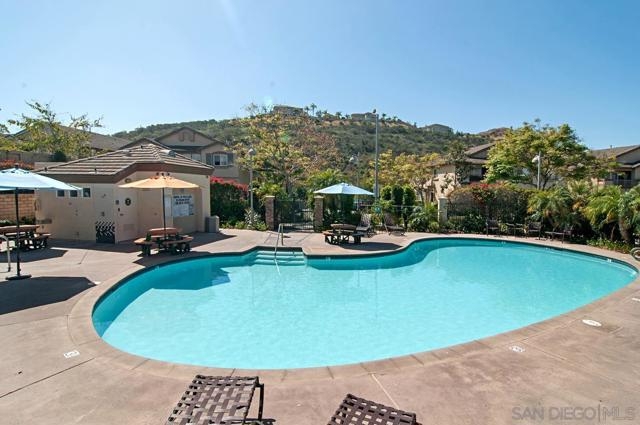 Don’t miss this opportunity to own a beautiful and immaculate 3-bedroom, 2.5-bath townhome, ideally situated in a desirable location at the back of the complex. Enjoy peaceful views from your private backyard, complete with a charming stone patio—perfect for relaxing or entertaining. The home features a spacious living area, separate dining room, and a pristine kitchen with abundant storage and a refrigerator included. Upstairs, the primary suite offers a walk-in closet, accompanied by two generous secondary bedrooms. Notable upgrades include wide plank hardwood flooring, ceiling fans, wood blinds, and central air. The attached 2-car garage includes a washer and dryer. The well-maintained community offers a pool, spa, and small playground for residents to enjoy. Conveniently located near restaurants, grocery stores, community parks, and Lake Miramar is just a short distance away.