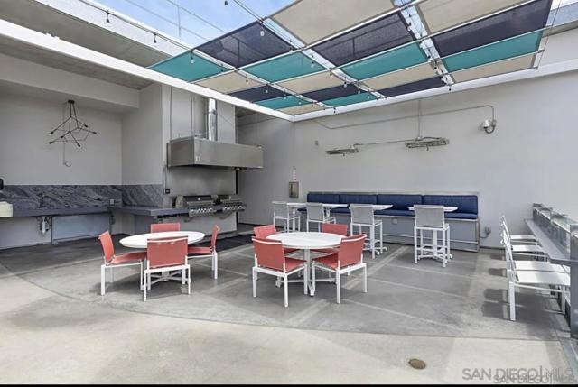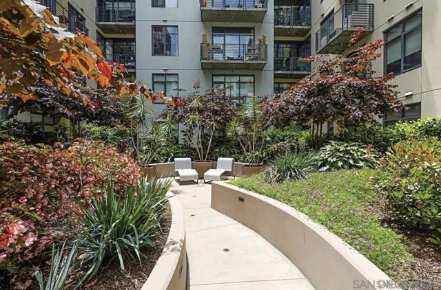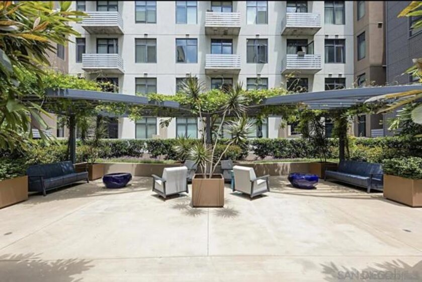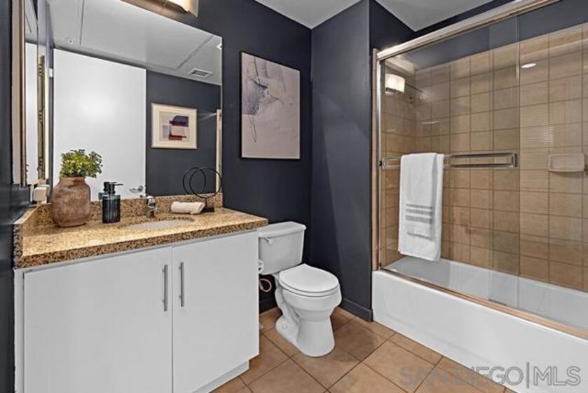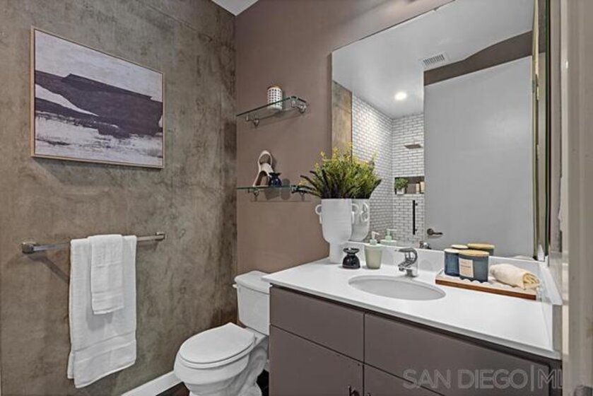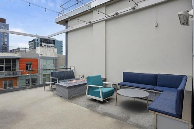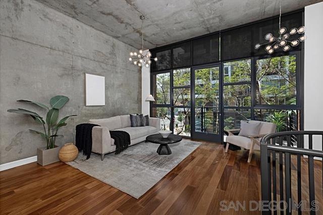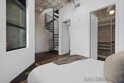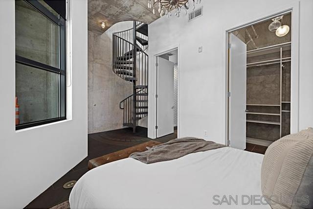 Rare Two Story Walk-Up Unit in the Highly Desirable M2i Building. This modern, reverse floor plan offers a unique living experience with high-end finishes throughout. The spacious primary bedroom features an oversized, fully custom walk-in shower, California Closets build-outs, and wide-plank tile flooring. A stunning spiral staircase leads to the second floor, where 12-foot ceilings and an open concept layout create an inviting atmosphere. Floor to ceiling windows provide abundant natural light, highlighting custom built-in shelving and exposed concrete accents. The kitchen is equipped with a premium LG fridge, complete with a custom ice maker, gas stainless steel cooking and modern fixtures. The private balcony offers city views and overlooks Jacaranda trees. One of the standout features of this unit is the direct access from the downstairs bedroom to the heart of East Village. Step outside your door and immerse yourself in one of San Diego’s most vibrant and desirable neighborhoods, just steps away from trendy restaurants, shops, and the lively energy of the area. The building also boasts a rooftop deck with built-in grills and a fireplace, a newly remodeled fitness center, and a lush interior courtyard. With Petco Park, Michelin-starred restaurant Callie, and the Gaslamp Quarter just blocks away, this unit offers an exceptional blend of modern luxury and unbeatable location.