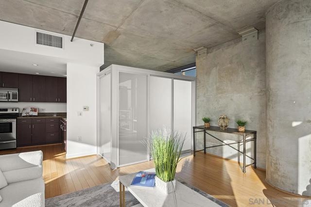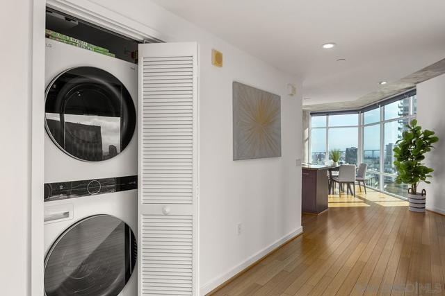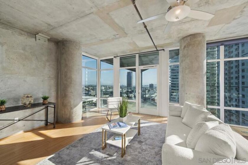 Welcome to the prime locale in Smart Corner, “The Point” floorplan, where walls of glass showcase panoramic views spanning Point Loma, the Pacific Ocean, San Diego Bay, and the Coronado Bridge from this premier south-facing residence. This spacious 1-bedroom open-concept layout is a blank slate for your vision, readily accommodating a 2nd bedroom or private den—a simple customization of adding drywall and a door unlocks the full potential of this exceptional urban home. You’ll love the modern style with loft-inspired character, complete with original bamboo flooring, exposed concrete accents, all opening to a huge balcony, a true standout feature ideal for entertaining, dining al fresco, or simply relaxing while soaking in the sweeping skyline and coastal vistas. The kitchen features stainless appliances, recessed lighting, and an eat-at bar for casual dining. Additional highlights include an upgraded washer and dryer, two excellent, separate parking spaces (rare P1 and a P3). Whether you’re seeking a stylish city residence, a smart investment, or a flexible live/workspace, this home offers unmatched views with a central Downtown location! VA approved. Smart Corner is an all-encompassing hub of work, play, shop, and live! It is conveniently located near the 163 freeway, I-5, Highway 94, Petco Park, the Gaslamp Quarter, San Diego City College, and Balboa Park. A trolley station located below the development ensures Smart Corner has all an urban dweller could want. Amenities include 20th floor roof-top sun deck with forever views of the city skyline, 10-person hot tub, barbecue area, wet bar, 2nd floor Fitness Center, PLUS on-site management, and security.