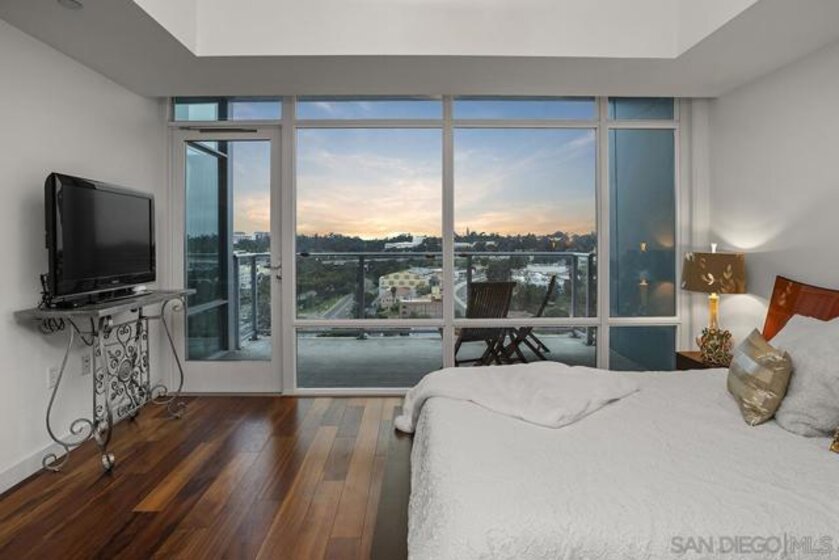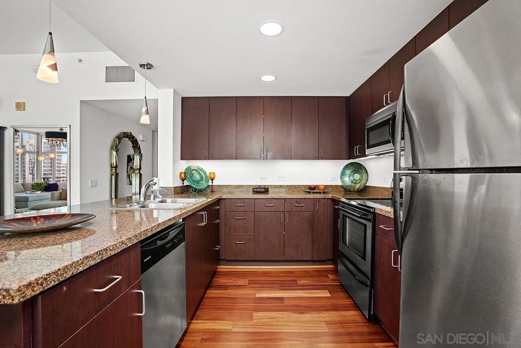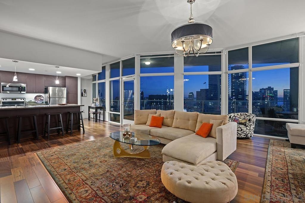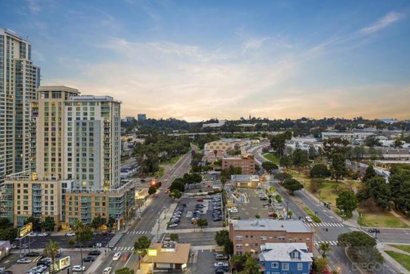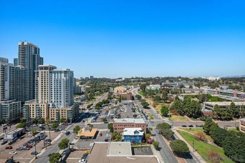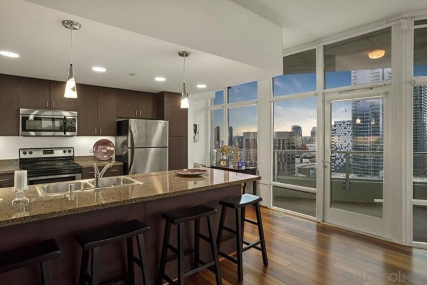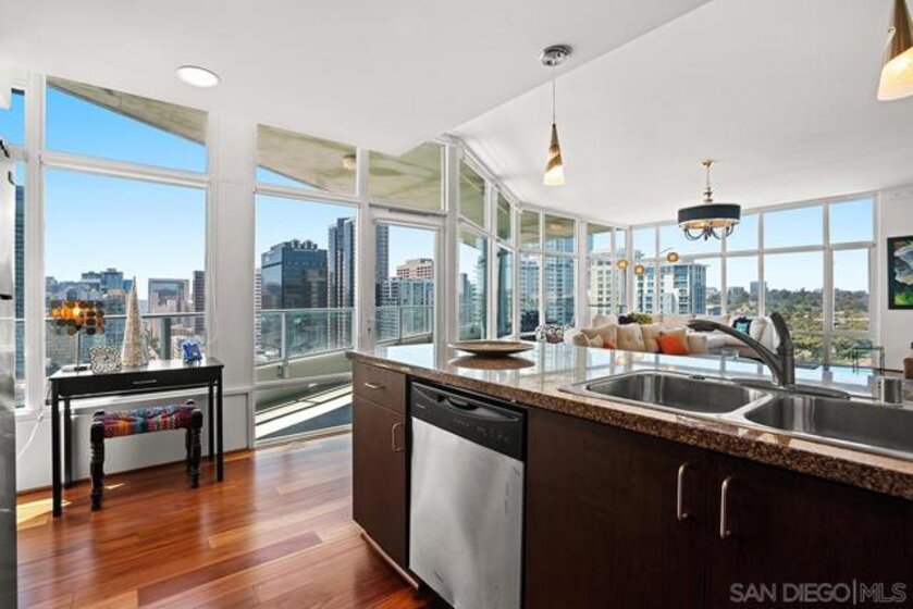 Step into one of only two exclusive penthouses at Smart Corner, where sophistication meets unparalleled city living. This spacious northwest corner residence vaunts panoramic views of the Downtown skyline, San Diego Bay, and the Pacific Ocean—framed by floor-to-ceiling windows and two private balconies. A true unicorn in the market, this meticulously maintained home blends elegance with modern comfort. The open-concept layout features split dual bedroom suites, each with its own ensuite bathroom. The gourmet kitchen is a chef’s delight, equipped with stainless steel appliances, granite countertops, and a stylish eat-at bar adorned with elegant pendant lighting. Rich Tiger Wood flooring flows seamlessly throughout, adding warmth to the bright, airy space, while a convenient powder room ensures effortless entertaining. The primary suite is a private oasis, complete with a walk-in closet and a balcony that opens to serene views of Balboa Park and distant mountain peaks. A second ensuite bedroom provides comfort for guests or a home office with a view. Plus, enjoy the convenience of side-by-side parking spaces—a coveted perk in urban living. Smart Corner is an all-encompassing hub of work, play, shop, and live! It is conveniently located near the 163 freeway, I-5, Highway 94, Petco Park, the Gaslamp Quarter, and Balboa Park. A trolley station located directly below the building ensures Smart Corner has all an urban dweller could want. Amenities include a roof-top sun deck with spa, a barbecue area, gym, and wet bar on the 20th floor, and fully equipped exercise room. Welcome home!