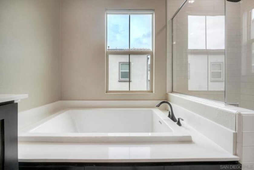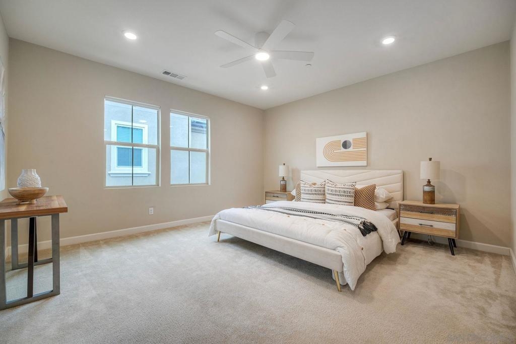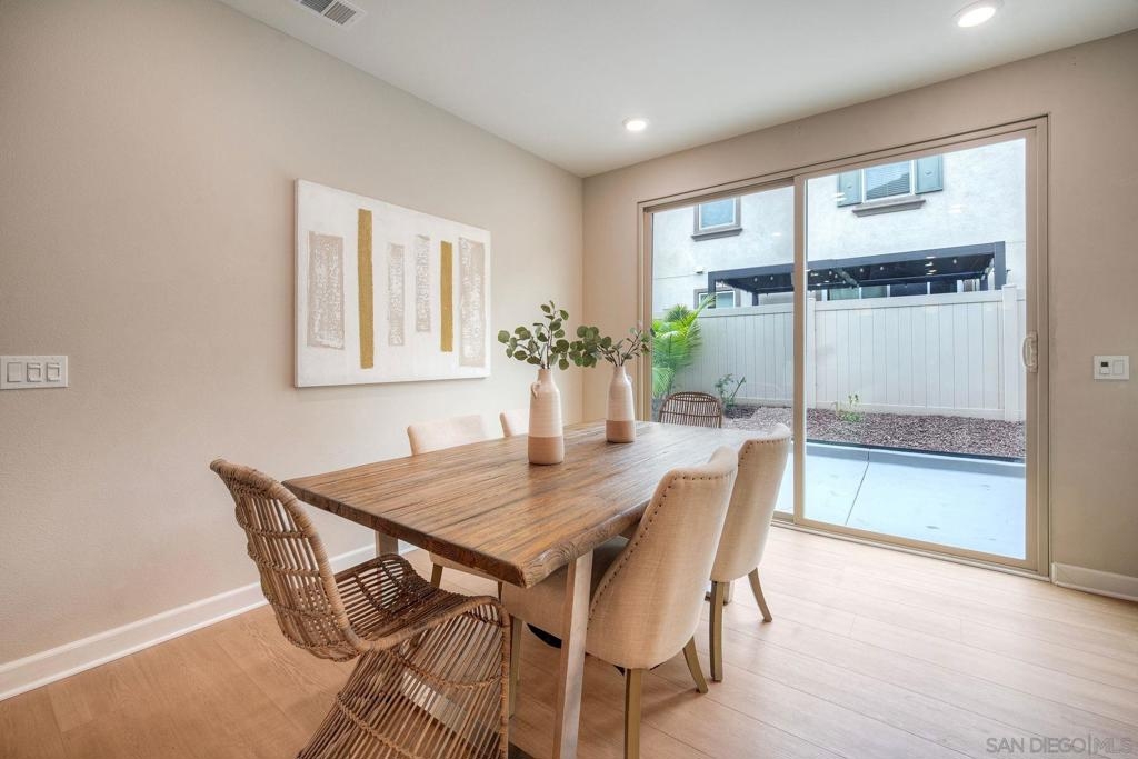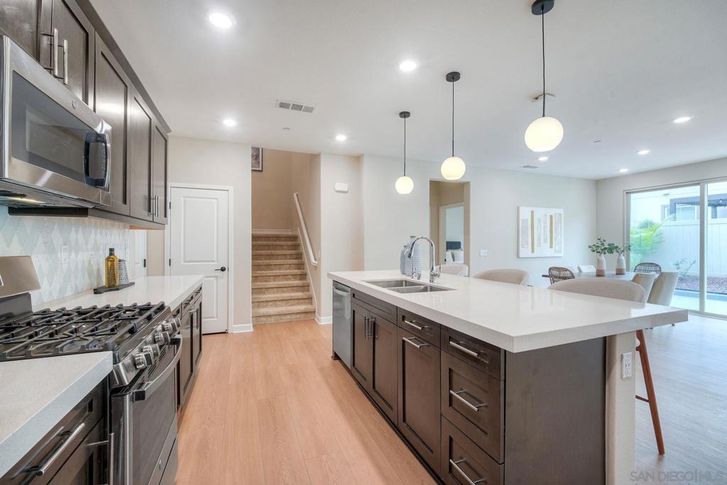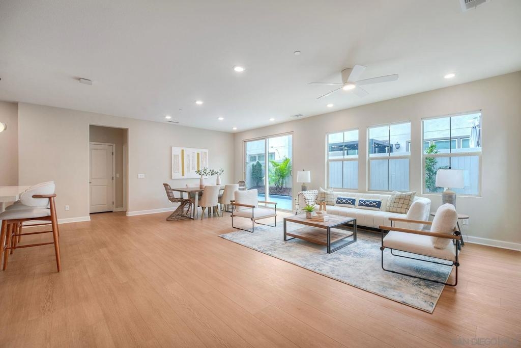 Stunning 4 bedroom, 3 bath end-unit townhome with backyard in highly desirable Rancho Peñasquitos! Set in a family friendly, modern community with a welcoming neighborhood feel. Enjoy NO Mello-Roos and low HOA fees! Newly installed luxury LVP flooring downstairs and tile in all bathrooms for a clean, contemporary look. A full bedroom and full bath on the main level offers the flexibility today’s families love, perfect for guests, multigenerational living, a home office or a workout space. The bright, open concept layout features an oversized living room that flows seamlessly into the dining area and kitchen which is ideal for everyday life and entertaining. The stylish kitchen shines with quartz countertops, a large center island with bar seating, stainless steel appliances, and upgraded cabinetry. Upstairs you’ll find three additional bedrooms and a convenient full size laundry room with sink. The spacious primary suite is a relaxing retreat with dual vanities, a separate tub and shower, and a walk-in closet. Two additional bedrooms are generously sized, great for kids’ rooms, a playroom, or another home office. Step outside to a private backyard with both concrete patio space and a grassy area - great for pets, playtime, BBQs, and enjoying sunny San Diego days. The community offers standout amenities for all ages, including a kids’ playground, pool, spa, BBQ grills, two dog parks, and an inviting walking trail, great for evening strolls or weekend walks. Additional features include a whole house water softener and reverse osmosis drinking water system. Located in the Poway Unified School District and close to schools, shopping, restaurants, a movie theater, library, and convenient freeway access. This home truly combines comfort, convenience, and community.