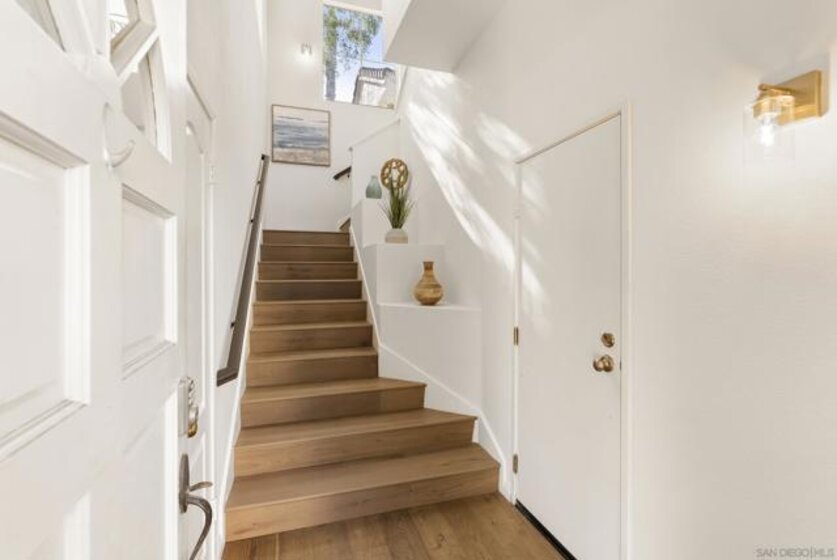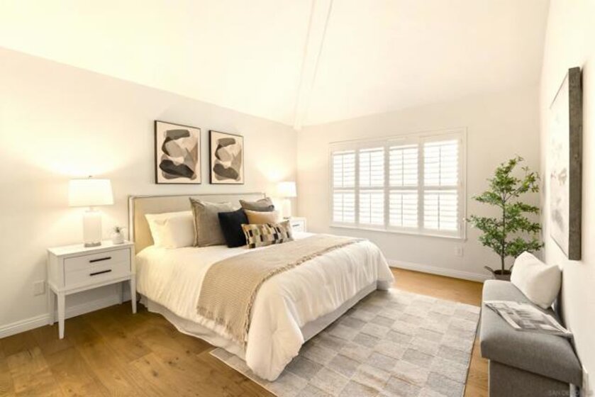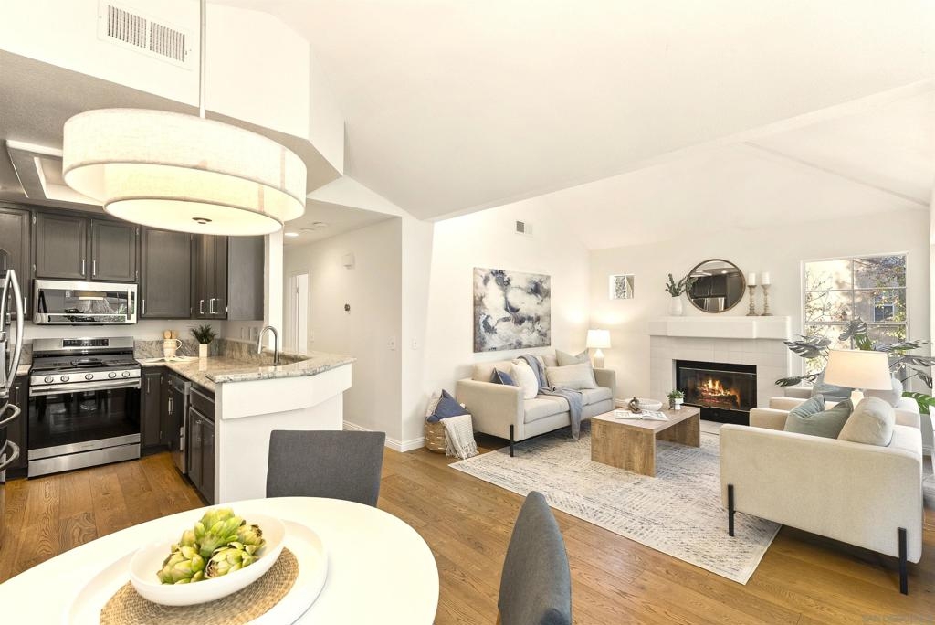 Stunning Upper-Level, 2-Bedroom, 2-Bath Condominium with a Private Corner Location! Features include a bright open floor plan, vaulted ceilings, rich engineered-wood flooring, beautiful kitchen remodel with granite counters and premium stainless steel appliances, large outdoor patio balcony, spacious bedrooms with classic wood shutters, walk-in closet, central heat and air conditioning, one-car attached garage with full-size laundry plus additional covered carport. Enjoy the beautiful Belsera community with sparkling pools, spa, recreation area with volleyball sand court, adjoining Mission Trails Park with endless hiking and biking trails and more!