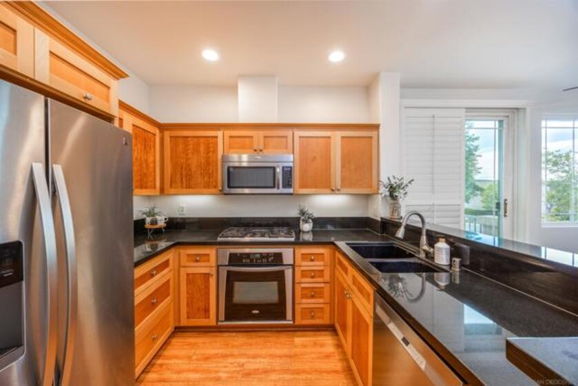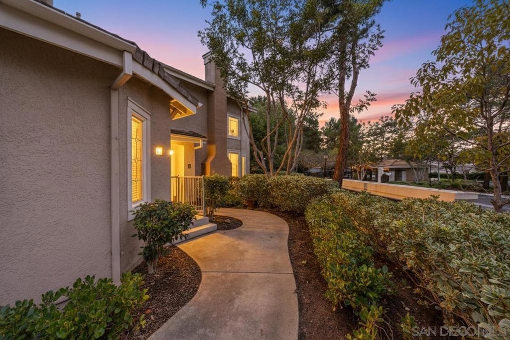 Absolutely GORGEOUS corner-unit condominium in the highly desirable Windham community of Carmel Mountain Ranch. This light and bright end unit features a thoughtfully designed layout that floods the space with natural light from 3 sides, creating an inviting and open feel throughout. The welcoming living room offers a cozy fireplace, perfect for relaxing or entertaining. Pride of ownership shines with upgrades galore, including German-engineered wood flooring, plantation shutters, vaulted ceilings, designer ceiling fans, and freshly painted interiors. The beautifully remodeled galley kitchen boasts top-of-the-line appliances, black granite countertops, and custom hickory cabinetry. Both bathrooms have been updated with new vanities, fixtures, lighting, and mirrors, and the primary bath features a seamless, high-end shower enclosure. Additional highlights include a new ultra-quiet energy-efficient AC unit, central heat and air, in-unit full-size washer and dryer, energy-efficient Craftsman-style dual-pane windows (low utility bills), and an attached 2-car garage with full-speed 60A Tesla EV charger. Enjoy a walkable lifestyle just steps to Starbucks, Trader Joe's, the library, Ralphs, Poway Unified schools, and Sabre Springs transit station—plus minutes to Costco, I-15/SR-56, UTC/downtown (20-25 min). Community perks include being steps from the pool, spa, and BBQ area (HOA covers all exterior maintenance, including a recent complete re-roof). This must-see condominium offers exceptional upgrades, location, and lifestyle.