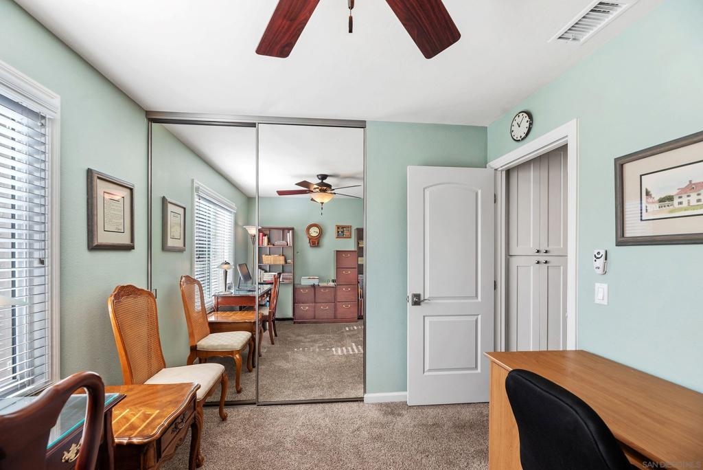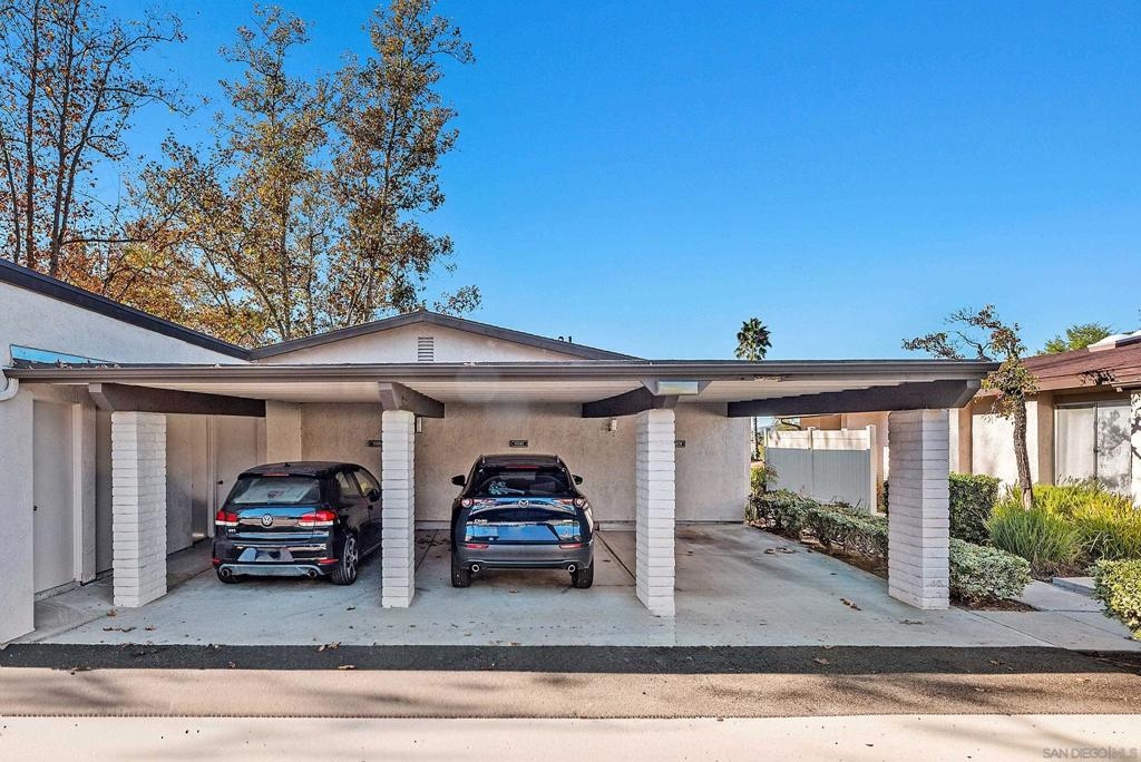 Beautiful turn-key, single story, 2 br, 2 ba end unit in "Alameda" complex. Private patio off living room with sunset views! Renovated throughout with wood-like porcelain flooring in all areas except for carpets in brs. Recessed lighting in kit, entry, hallway, & bathrms. Newer water heater, heat pump, & venting. Ceiling fans in LR & both brs. Upgraded kit cabinets & granite counters. Stainless steel appliances, double oven, refrigerator, dishwasher. Stackable washer/dryer in kit closet. Quartz bathrm countertops, custom mirrored wardrobe doors in brs. Custom drapery & rod in LR. Most hardware upgraded, including front door. Assigned one covered parking space with storage. Located in desirable Poway School system. Move-in ready and much more to see and appreciate!