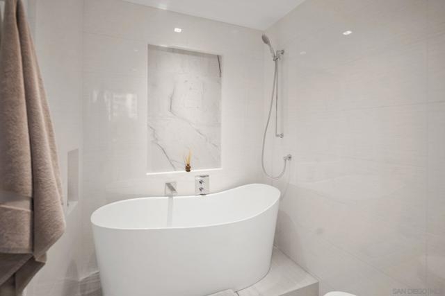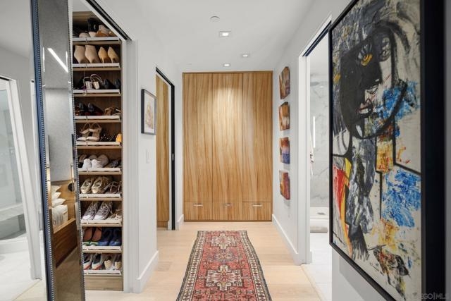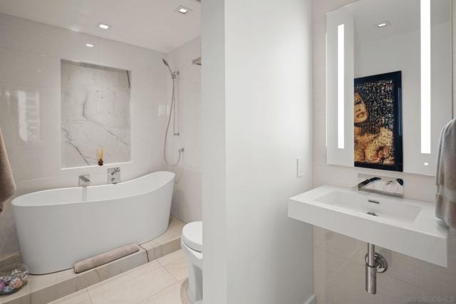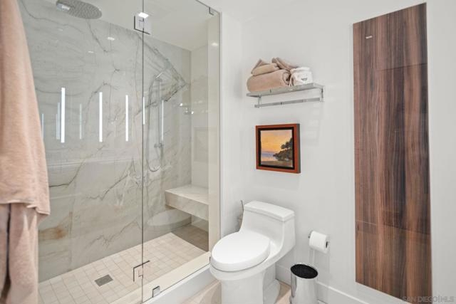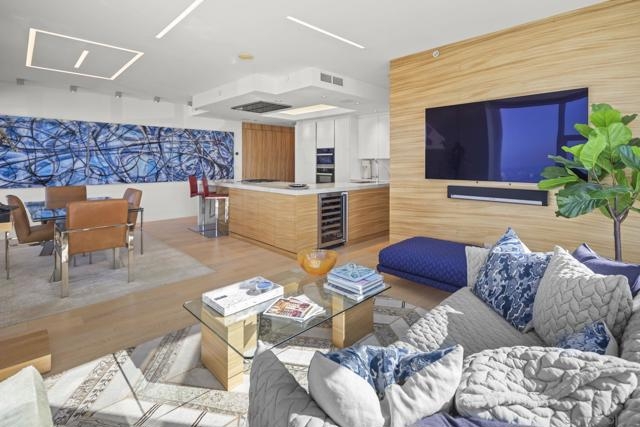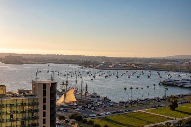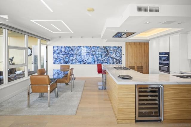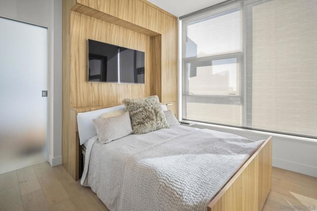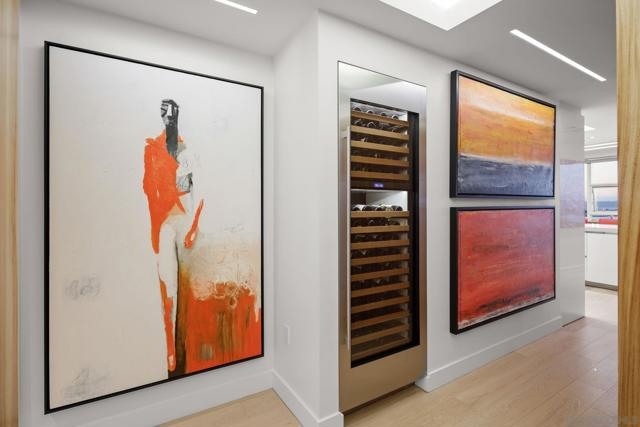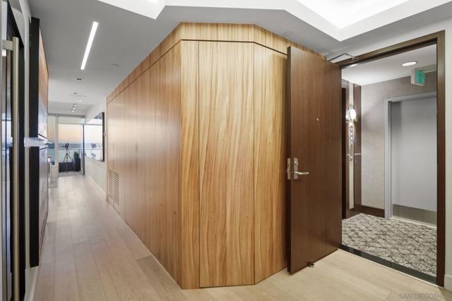 Truly one-of-a-kind, fully upgraded luxury residence in Bayside on Millionaire’s Row. This southwest-facing corner home offers sweeping bay, city, and sunset views and underwent a complete $500K+ down-to-the-studs remodel in 2018. Every detail was reimagined to enhance light, views, and craftsmanship, with meticulous care from the original owner. Enter through a dramatic foyer with coffered ceilings, designer lighting, custom Koa wood cabinetry imported from Hawaii, and built-in wine storage. The open-concept living, dining, and kitchen spaces showcase floor-to-ceiling views, Duchateau flooring, quartzite stone accents, sleek ceilings with modern lighting, and a private balcony ideal for relaxing or entertaining. The chef-inspired kitchen features custom German cabinetry, quartzite counters, Miele appliances, and breakfast seating. The serene primary suite includes its own balcony, custom Koa furnishings, a larger-than-original walk-in closet with California Closets, and a spa-style bath with dual sinks and walk-in shower. A flexible layout includes a home office plus guest room with custom Zoom bed and a designer bath with soaking tub. Additional upgrades include power blinds, built-ins throughout, and two premium side-by-side parking spaces with EV charger and storage located near the elevator. Bayside features a newly renovated lobby, 24-hour concierge, pool, spa, sauna, steam room, movie theater, wine lounge, conference room, BBQ areas, and library. Just steps to Little Italy, Waterfront Park, the Rady Shell, Petco Park, and San Diego’s best dining and entertainment! Retreat to the serene primary suite with its own private balcony, custom Koa furnishings, and a larger than original walk-in closet with a California Closet system and custom built-ins. The spa-inspired bath offers dual sinks, a walk-in shower, and striking custom stonework. A flexible floor plan includes a home office and guest bedroom with a custom Zoom bed, while the guest bath offers a freestanding soaking tub and designer finishes. Additional highlights include power blinds throughout (blackout in bedrooms), ample storage, and two side-by-side premium parking spaces with a dedicated electric charger for your Tesla or other electric vehicle, conveniently located just outside the elevator with separate storage. Bayside residents enjoy a newly renovated lobby, 24-hour concierge, pool, spa, sauna, steam room, movie theater, conference room, wine lounge with oversized chiller, BBQ areas, library, and more. Perfectly located, you’re steps from Little Italy, the Gaslamp, Waterfront Park, Petco Park, the Rady Shell, and San Diego’s best dining, shopping, and entertainment. This residence represents the very best in luxury downtown living on the front row to the waterfront.