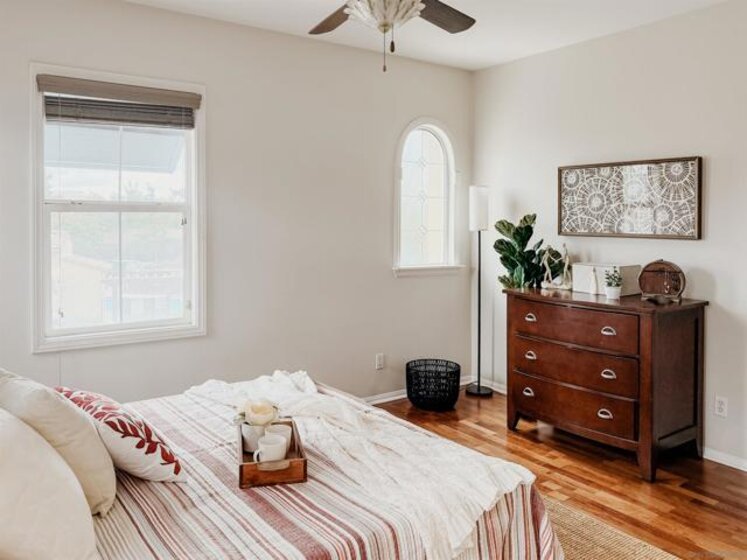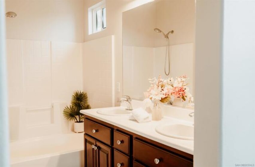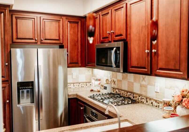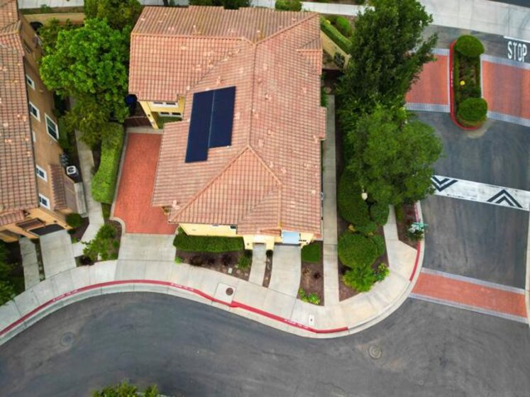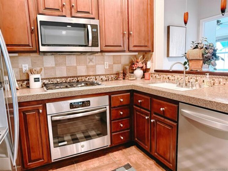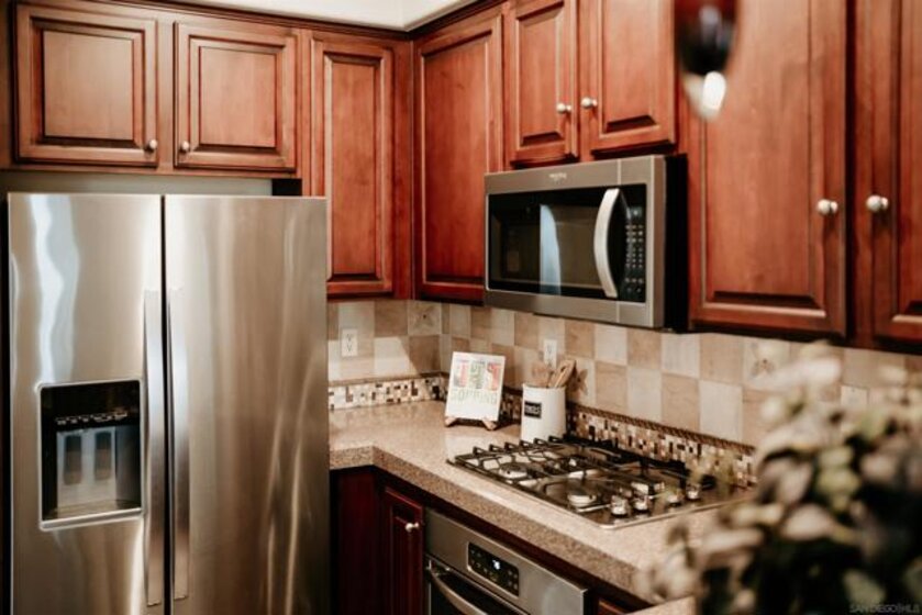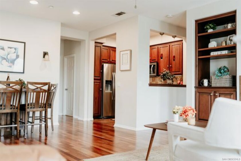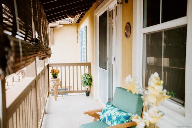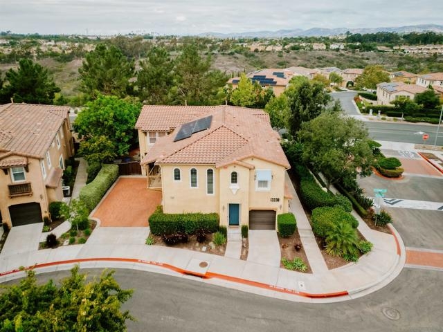 This beautifully maintained townhome features an open floor plan with high-end touches throughout, including upgraded kitchen counters, refinished hardwood floors, ceiling fans, designer paint, a private balcony, and a cozy fireplace in the living/dining area. All living spaces are located on the second floor with direct access from the attached 1-car garage.The master suite includes a spacious walk-in closet . The home comes with a dedicated laundry room for convenience. With FULLY PAID SOLAR to offset electricity costs and zoning for the top-rated Poway Unified School District, this home offers both comfort and value.Recent updates include NEM 2.0 based solar panels (2023), brand new EV charger (2025), Cooktop (2025) Water heater (2023). Ideally situated in one of the best locations within the Monaco complex, residents enjoy community amenities such as a sparkling pool and spa, along with close proximity to shopping, dining, parks, schools, and easy freeway access. Torrey Meadows Park and the highly ranked West View High School are just few blocks away.