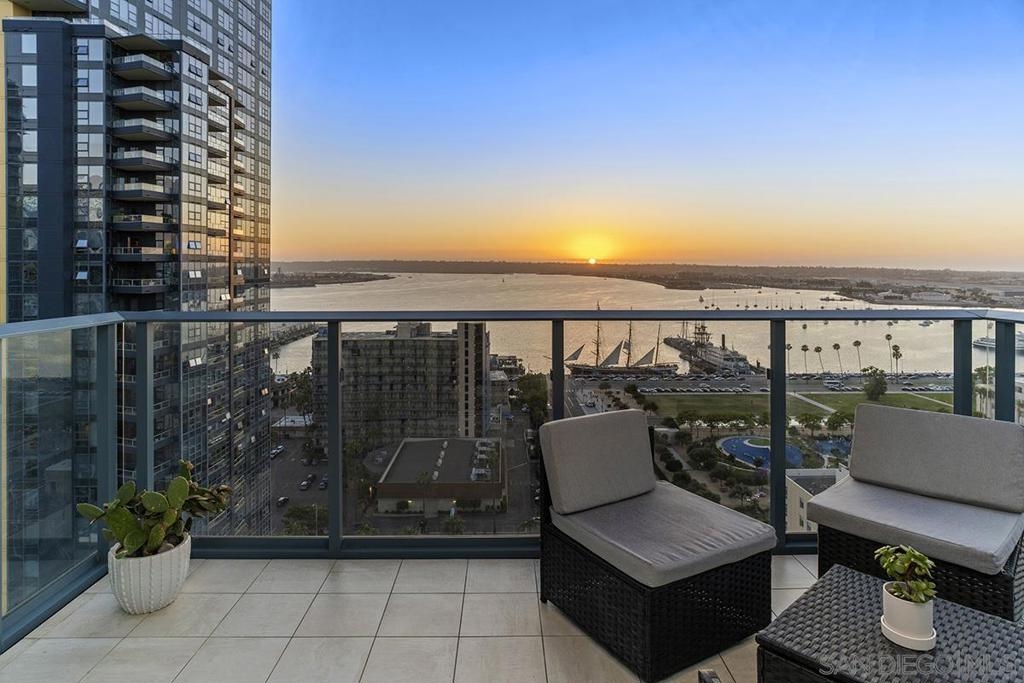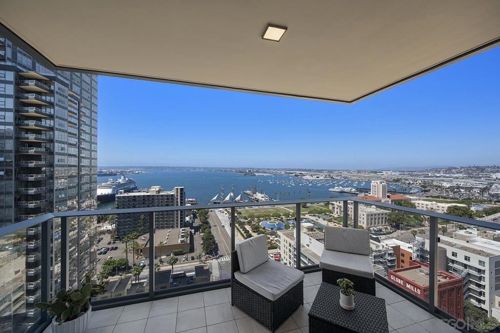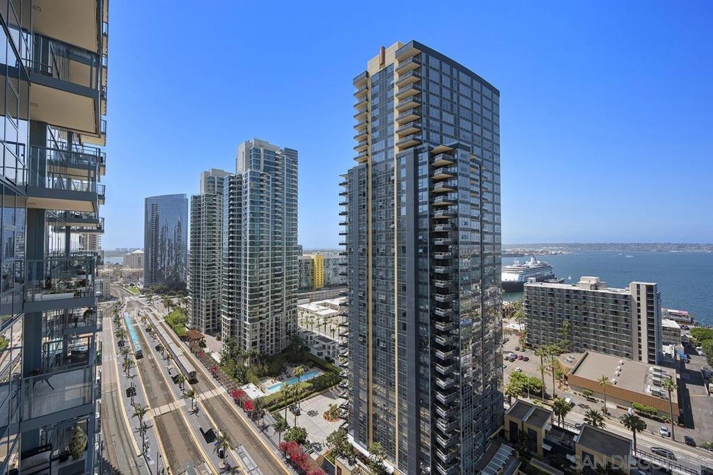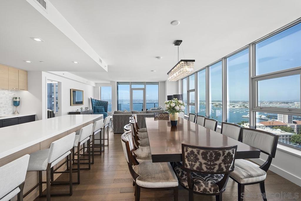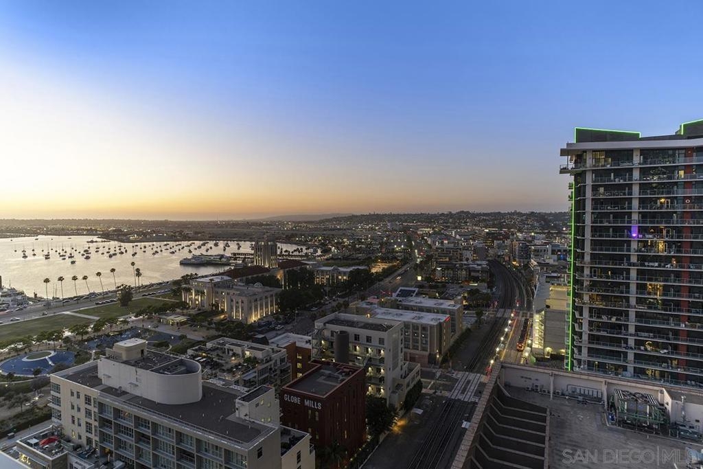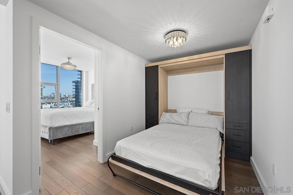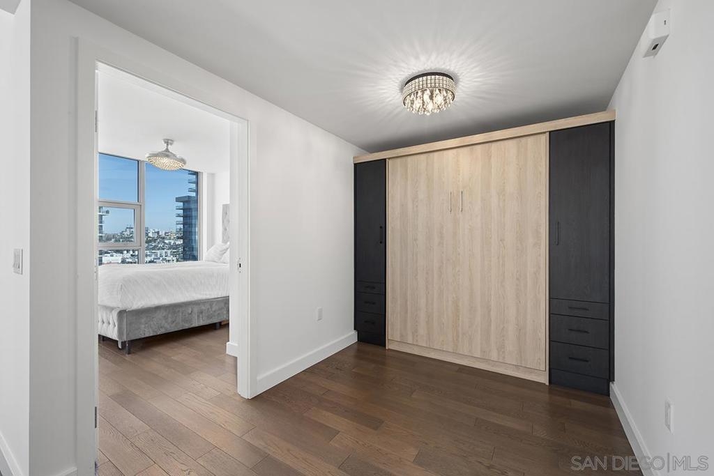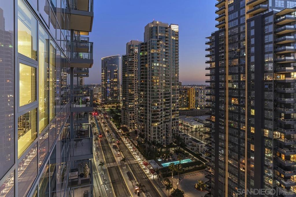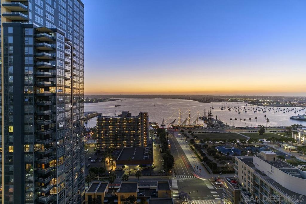 Twenty floors up, this northwest corner residence at Savina delivers unobstructed views of the San Diego Bay, Pacific Ocean, and city skyline from every single room. The west-facing balcony offers a front-row seat to some of the most spectacular sunsets in the city, night after night. Inside, this highly desirable floor plan is highlighted by a spacious living area and generously sized gourmet kitchen. Custom lighting fixtures throughout, including statement ceiling pieces and elegant sconces, create a warmth and intentionality that sets the residence apart, while wood flooring and motorized window shades with silent motors complete the effortless, polished feel. The gourmet kitchen is built for both function and style, featuring stainless Thermador appliances, a cabinet-front refrigerator, designer backsplash, quartz surfaces, wine chiller, and an oversized center island with a waterfall edge. The primary bedroom includes a spa-caliber ensuite bathroom with step-in rain shower and dual vanity. The second bedroom offers city views, while the adjacent den is anchored by a custom built-in Murphy bed system and ideal as a home office that converts effortlessly for overnight guests. Additional highlights include a storage unit and two side-by-side parking spaces. Elevated in every sense of the word. Savina by Bosa is one of San Diego’s newest high-rise buildings located just steps away from Little Italy, listed as one of Forbes “Best Neighborhoods.” Savina’s first-class amenities include amazing outdoor pool and spa, fitness center with outdoor yoga deck, steam room & sauna, dog wash and pet park, bicycle repair room, and club house/game room with BBQ deck for entertaining. Literally steps away from Waterfront Park, enjoy an array of concerts and outstanding local events. When it’s time to get away, take advantage of your close proximity to the airport, cruise terminal, and train/trolley stations. Whether winding down on the private balcony or making your way to one of Little Italy’s countless renowned restaurants, Savina is city living at its finest.