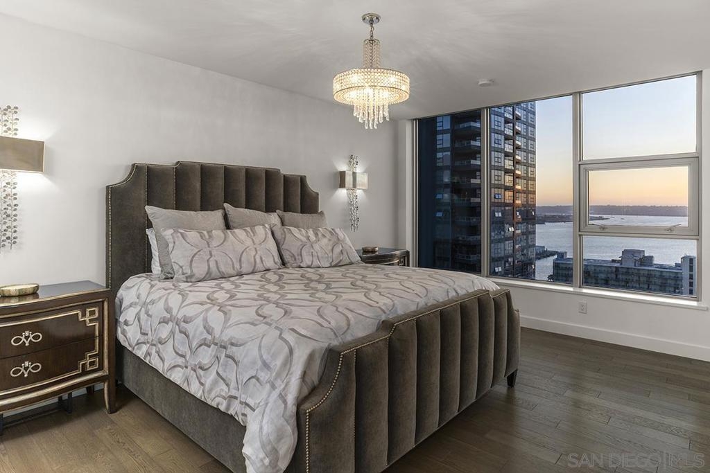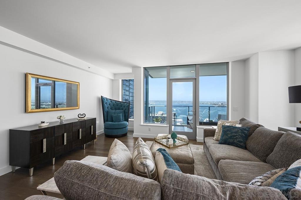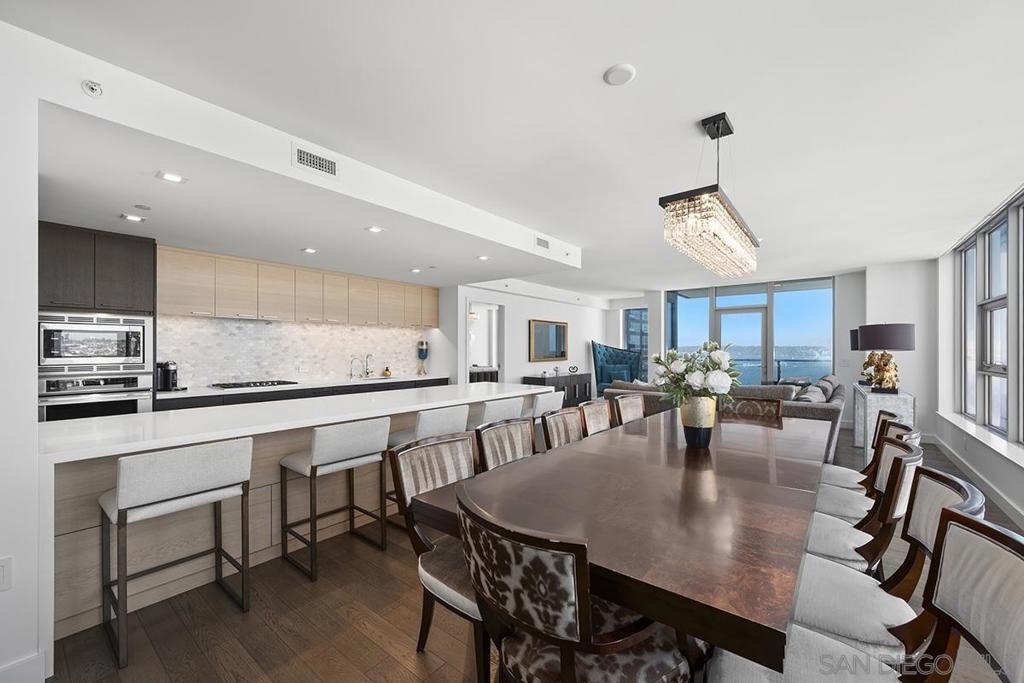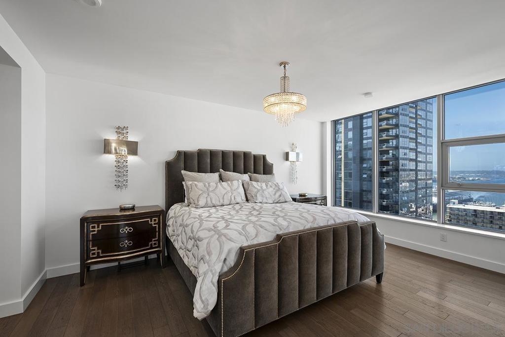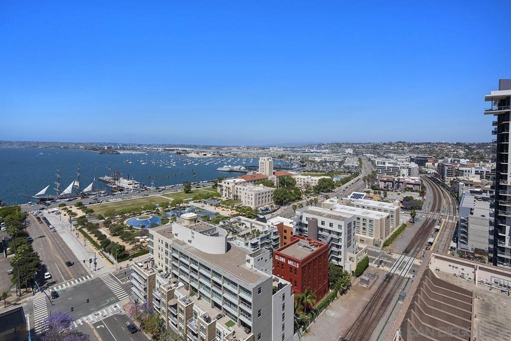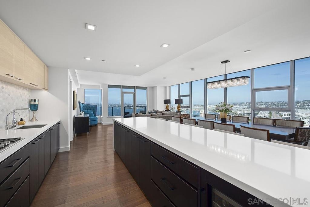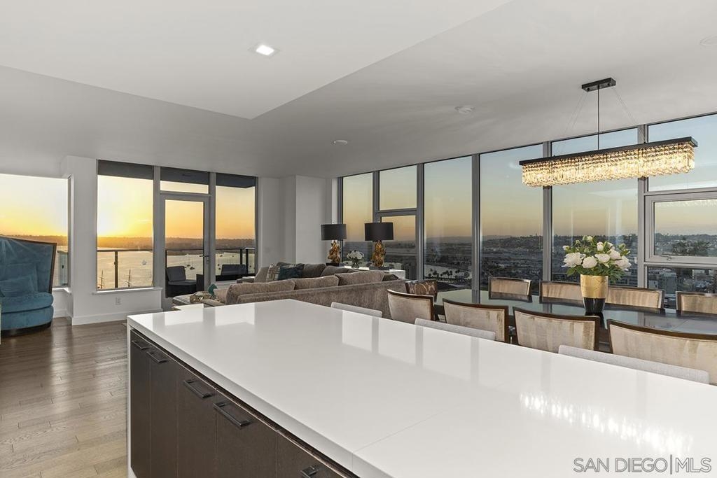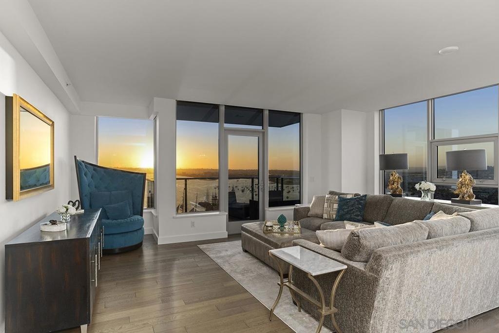 Twenty floors up, this northwest corner residence at Savina delivers unobstructed views of the San Diego Bay, Pacific Ocean, and city skyline from every single room. The west-facing balcony offers a front-row seat to some of the most spectacular sunsets in the city, night after night. Inside, this highly desirable floor plan is highlighted by a spacious living area and generously sized gourmet kitchen. Custom lighting fixtures throughout, including statement ceiling pieces and elegant sconces, create a warmth and intentionality that sets the residence apart, while wood flooring and motorized window shades with silent motors complete the effortless, polished feel. The gourmet kitchen is built for both function and style, featuring stainless Thermador appliances, a cabinet-front refrigerator, designer backsplash, quartz surfaces, wine chiller, and an oversized center island with a waterfall edge. The primary bedroom includes a spa-caliber ensuite bathroom with step-in rain shower and dual vanity. The second bedroom offers city views, while the adjacent den is anchored by a custom built-in Murphy bed system and ideal as a home office that converts effortlessly for overnight guests. Additional highlights include a storage unit and two side-by-side parking spaces. Elevated in every sense of the word. Savina by Bosa is one of San Diego’s newest high-rise buildings located just steps away from Little Italy, listed as one of Forbes “Best Neighborhoods.” Savina’s first-class amenities include amazing outdoor pool and spa, fitness center with outdoor yoga deck, steam room & sauna, dog wash and pet park, bicycle repair room, and club house/game room with BBQ deck for entertaining. Literally steps away from Waterfront Park, enjoy an array of concerts and outstanding local events. When it’s time to get away, take advantage of your close proximity to the airport, cruise terminal, and train/trolley stations. Whether winding down on the private balcony or making your way to one of Little Italy’s countless renowned restaurants, Savina is city living at its finest.