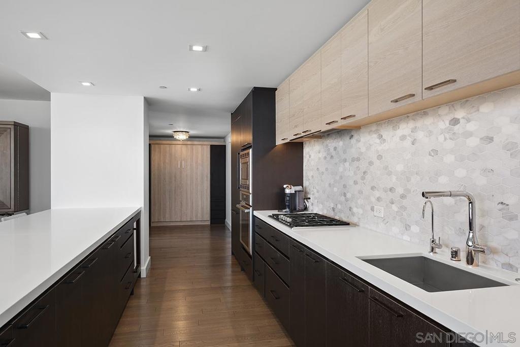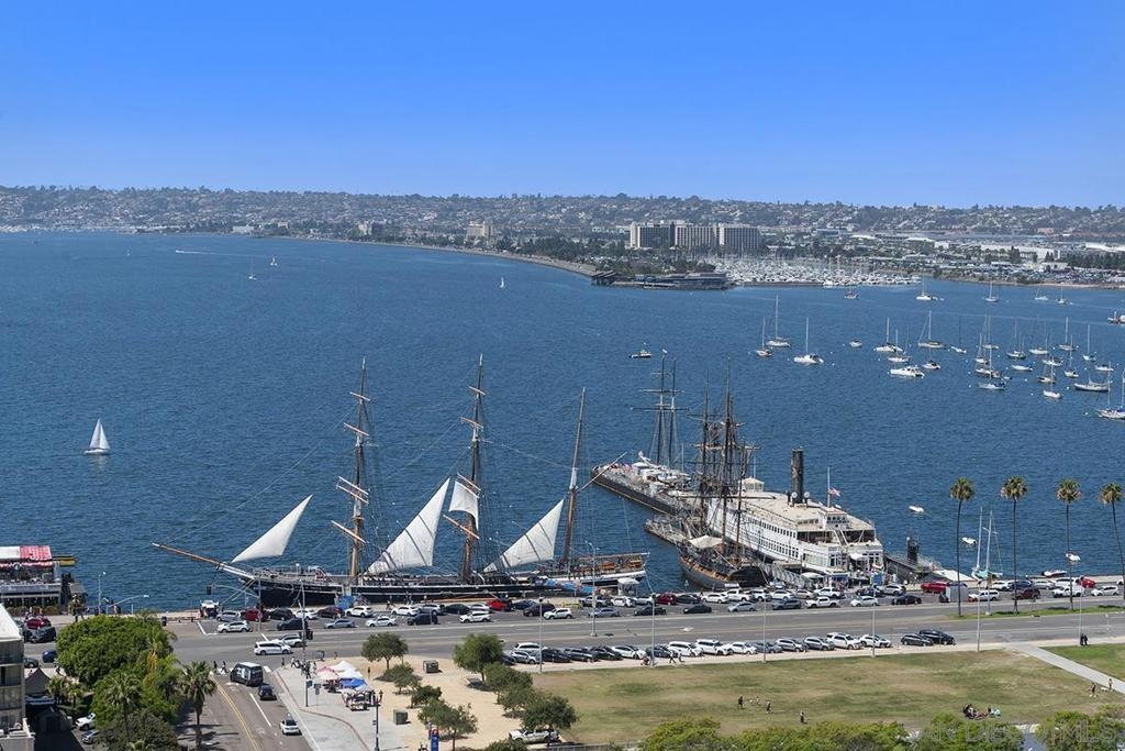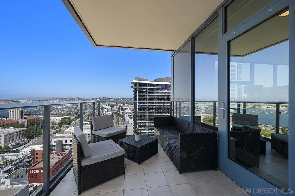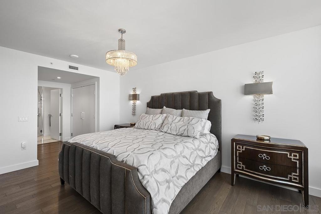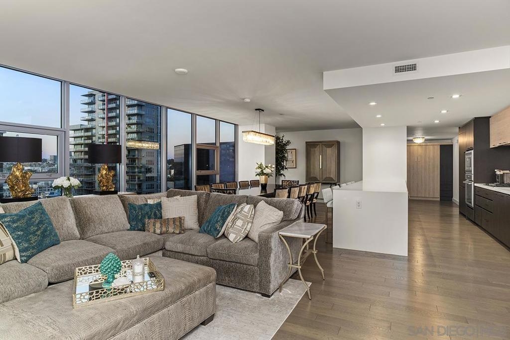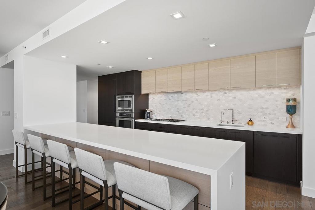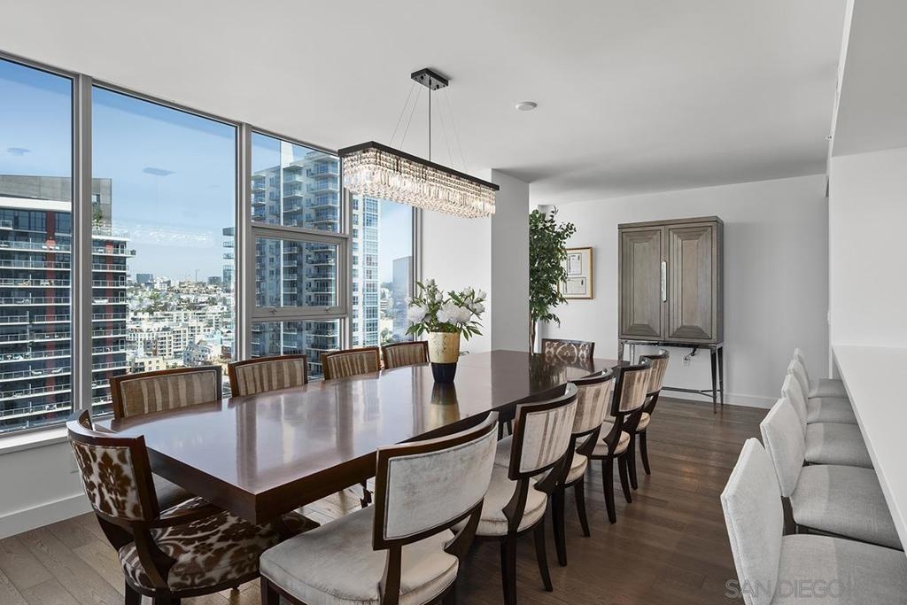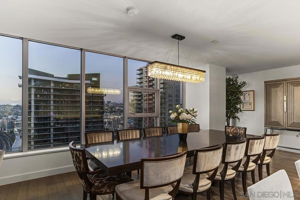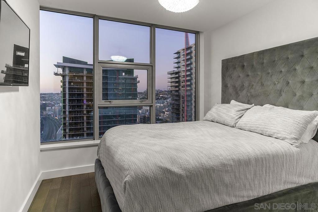 Twenty floors up, this northwest corner residence at Savina delivers unobstructed views of the San Diego Bay, Pacific Ocean, and city skyline from every single room. The west-facing balcony offers a front-row seat to some of the most spectacular sunsets in the city, night after night. Inside, this highly desirable floor plan is highlighted by a spacious living area and generously sized gourmet kitchen. Custom lighting fixtures throughout, including statement ceiling pieces and elegant sconces, create a warmth and intentionality that sets the residence apart, while wood flooring and motorized window shades with silent motors complete the effortless, polished feel. The gourmet kitchen is built for both function and style, featuring stainless Thermador appliances, a cabinet-front refrigerator, designer backsplash, quartz surfaces, wine chiller, and an oversized center island with a waterfall edge. The primary bedroom includes a spa-caliber ensuite bathroom with step-in rain shower and dual vanity. The second bedroom offers city views, while the adjacent den is anchored by a custom built-in Murphy bed system and ideal as a home office that converts effortlessly for overnight guests. Additional highlights include a storage unit and two side-by-side parking spaces. Elevated in every sense of the word. Savina by Bosa is one of San Diego’s newest high-rise buildings located just steps away from Little Italy, listed as one of Forbes “Best Neighborhoods.” Savina’s first-class amenities include amazing outdoor pool and spa, fitness center with outdoor yoga deck, steam room & sauna, dog wash and pet park, bicycle repair room, and club house/game room with BBQ deck for entertaining. Literally steps away from Waterfront Park, enjoy an array of concerts and outstanding local events. When it’s time to get away, take advantage of your close proximity to the airport, cruise terminal, and train/trolley stations. Whether winding down on the private balcony or making your way to one of Little Italy’s countless renowned restaurants, Savina is city living at its finest.