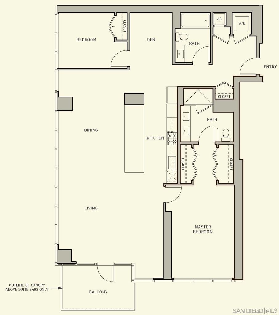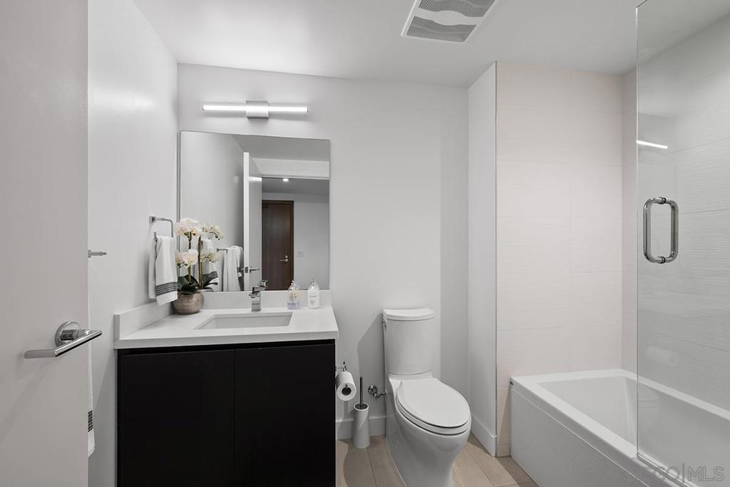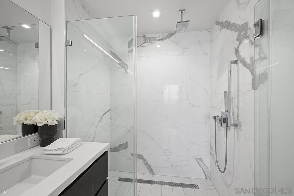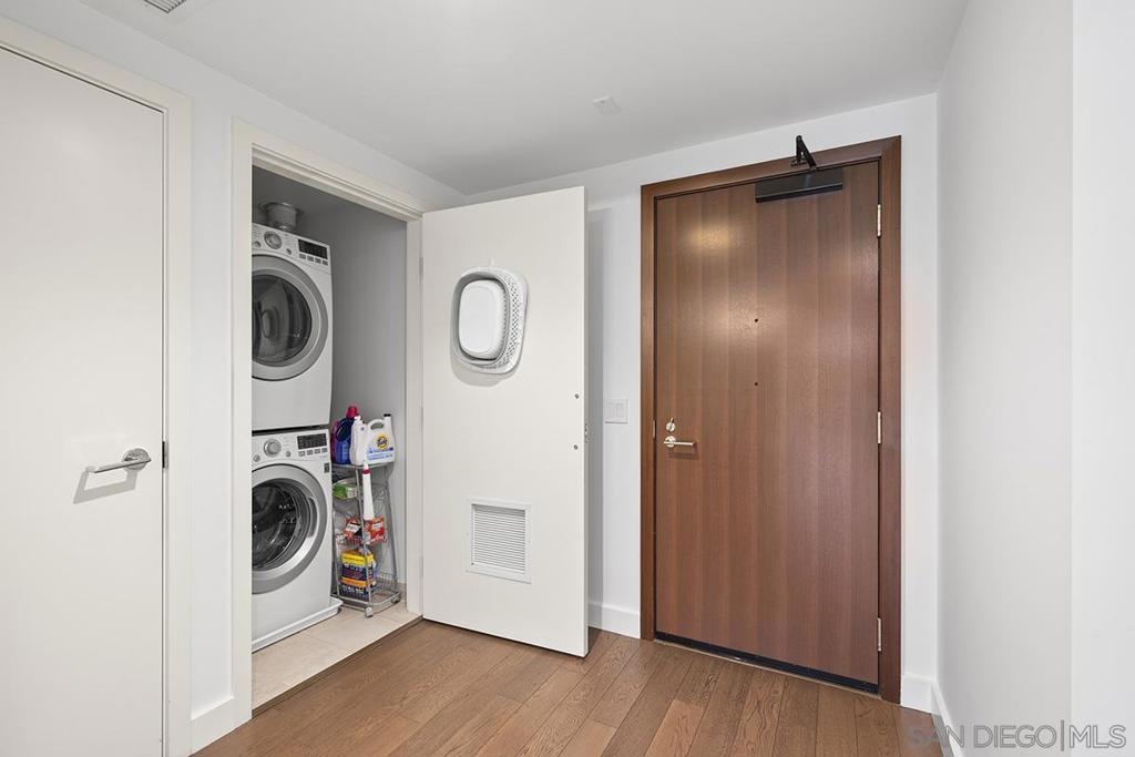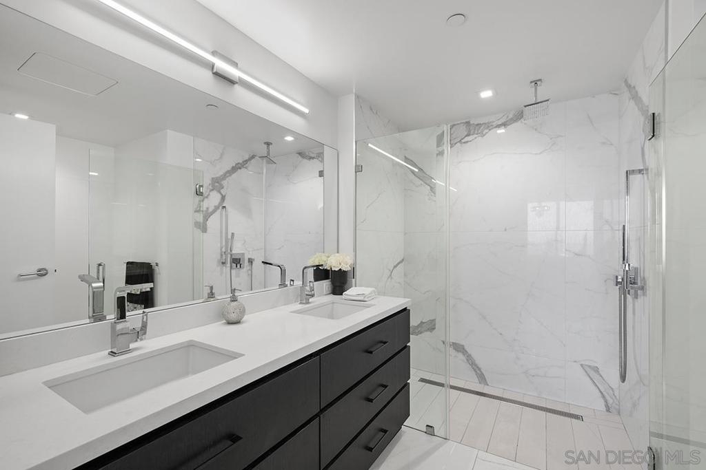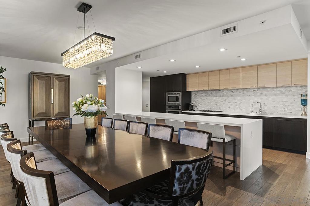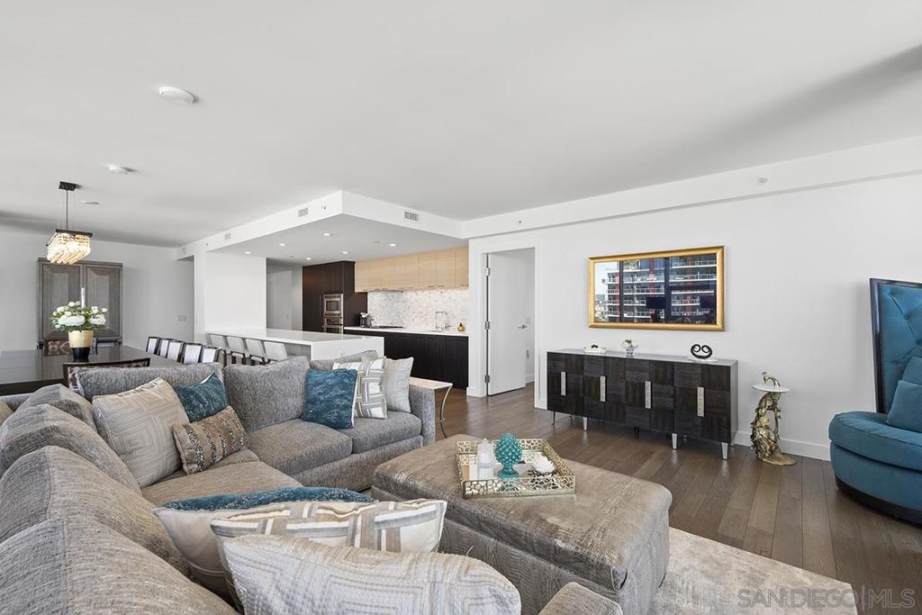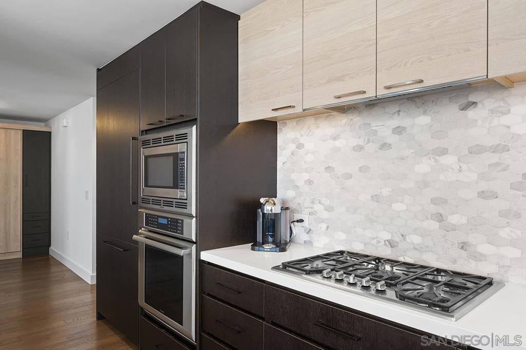 Twenty floors up, this northwest corner residence at Savina delivers unobstructed views of the San Diego Bay, Pacific Ocean, and city skyline from every single room. The west-facing balcony offers a front-row seat to some of the most spectacular sunsets in the city, night after night. Inside, this highly desirable floor plan is highlighted by a spacious living area and generously sized gourmet kitchen. Custom lighting fixtures throughout, including statement ceiling pieces and elegant sconces, create a warmth and intentionality that sets the residence apart, while wood flooring and motorized window shades with silent motors complete the effortless, polished feel. The gourmet kitchen is built for both function and style, featuring stainless Thermador appliances, a cabinet-front refrigerator, designer backsplash, quartz surfaces, wine chiller, and an oversized center island with a waterfall edge. The primary bedroom includes a spa-caliber ensuite bathroom with step-in rain shower and dual vanity. The second bedroom offers city views, while the adjacent den is anchored by a custom built-in Murphy bed system and ideal as a home office that converts effortlessly for overnight guests. Additional highlights include a storage unit and two side-by-side parking spaces. Elevated in every sense of the word. Savina by Bosa is one of San Diego’s newest high-rise buildings located just steps away from Little Italy, listed as one of Forbes “Best Neighborhoods.” Savina’s first-class amenities include amazing outdoor pool and spa, fitness center with outdoor yoga deck, steam room & sauna, dog wash and pet park, bicycle repair room, and club house/game room with BBQ deck for entertaining. Literally steps away from Waterfront Park, enjoy an array of concerts and outstanding local events. When it’s time to get away, take advantage of your close proximity to the airport, cruise terminal, and train/trolley stations. Whether winding down on the private balcony or making your way to one of Little Italy’s countless renowned restaurants, Savina is city living at its finest.