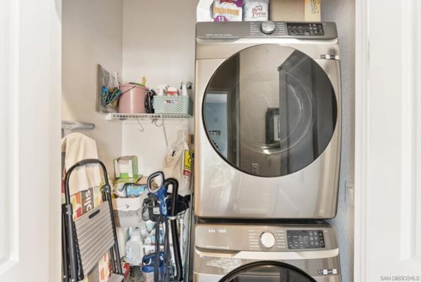 Top-floor end-unit living in the highly desirable Cypress Greens community of Carmel Mountain Ranch. Built by Shea Homes in 2008 and still owned by the original buyer, this 2-bedroom, 2-bath residence is ideally positioned above the garages with no units below and windows on three sides—delivering exceptional privacy, natural light, and a floor plan that lives more like a single-family home. With only three units per building, the setting feels quiet, open, and rarely available. (see suppl) Inside, the home offers thoughtfully upgraded living space with hand-scraped engineered hardwood flooring throughout the main living areas, bedrooms, and kitchen. The kitchen blends style and functionality with quartz countertops, stainless steel appliances, a recently installed quiet-run dishwasher and microwave, and a convenient two-seat eat-at bar. A custom built-in storage and shelving feature enhances the dining area with both character and practicality. The living room is framed by a wall of southeast-facing windows with plantation shutters, filling the space with soft morning light, while the fireplace creates a comfortable place to unwind. The private patio—one of the larger options in the community—offers direct access from both the living room and primary suite, making indoor-outdoor living easy. Additional highlights include a security system, direct-access one-car garage with overhead storage, and a second deeded parking space. Located directly across from the pool, spa, and community gathering areas, with no Mello-Roos, and close proximity to shopping, dining, top-rated schools, and freeway access, this home delivers comfort, privacy, and everyday convenience in a prime San Diego location.