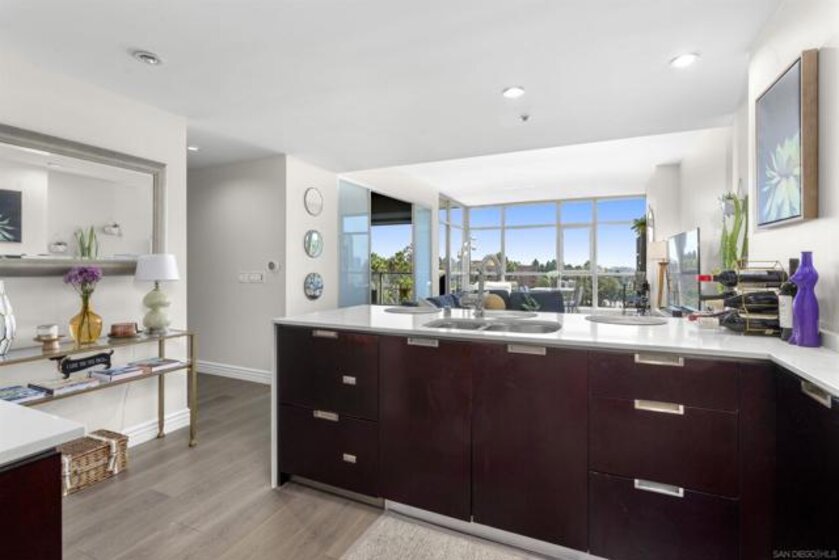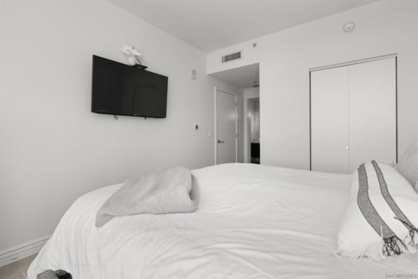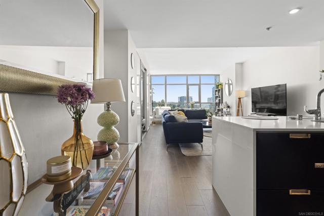 Welcome to Aria, located in the exclusive Cortez Hill neighborhood. This impeccably designed 3 bedroom, 2 bathroom condo with exceptional views and almost 1,400 square feet of living space could be yours! Floor-to-ceiling windows invite in a significant amount of natural light, which compliments the new vinyl plank flooring in the living room, kitchen, third bedroom (currently staged as an office) and hallway. The remaining two bedrooms have newer neutral carpeting and motorized shades were added in the primary. The kitchen offers a substantial amount of storage which extends into the pantry as well. The laundry room is equipped with washer and dryer and contains built-in storage too. The 19x8 balcony (about 150 square feet) provides exceptional outdoor living space and is a perfect spot to relax and enjoy the views. Aria residents enjoy a large pool, spa, fitness center and common area. There is also bike storage on the first floor of the parking garage for all residents. The unit offers two assigned parking spaces as well and is minutes from Little Italy, Gaslamp Quarter, Petco Park and the Embarcadero.