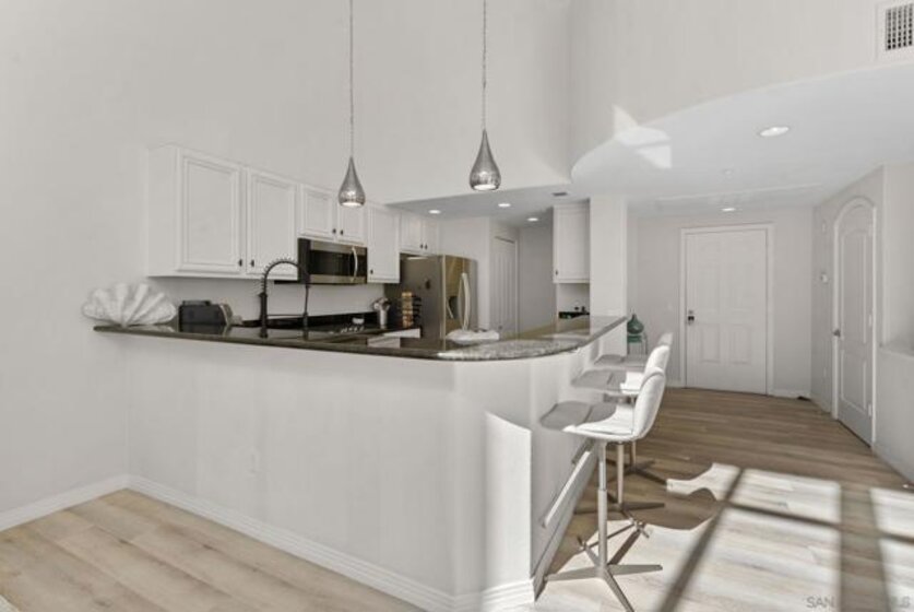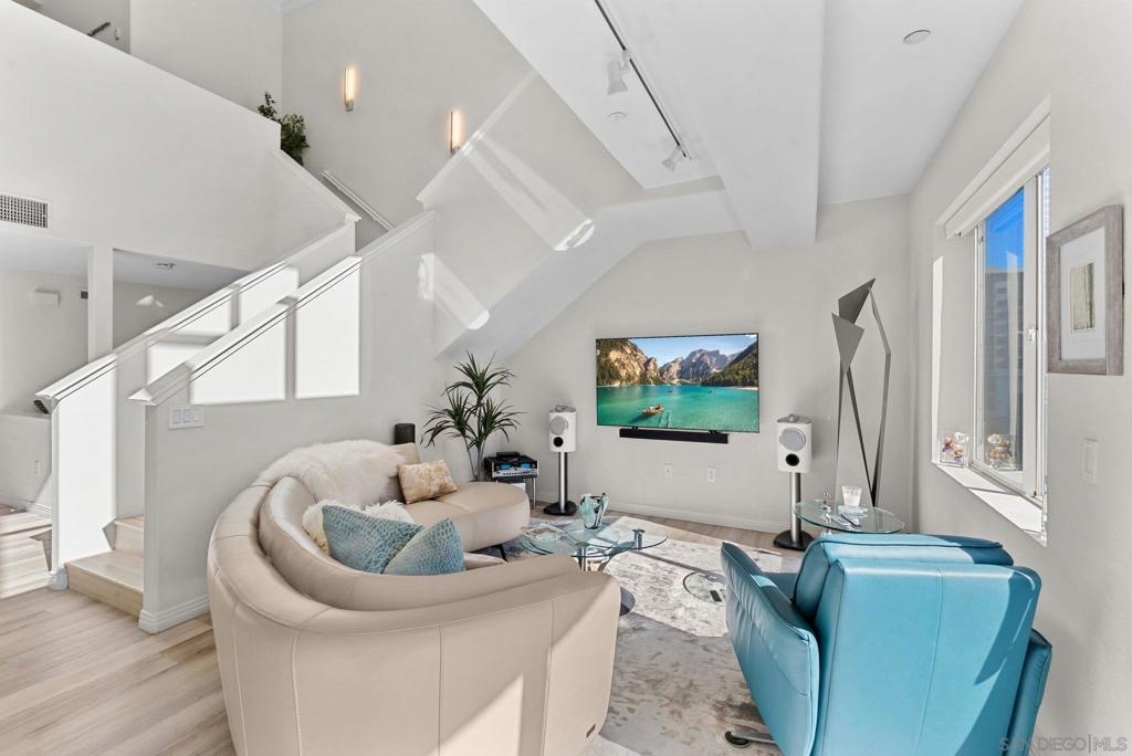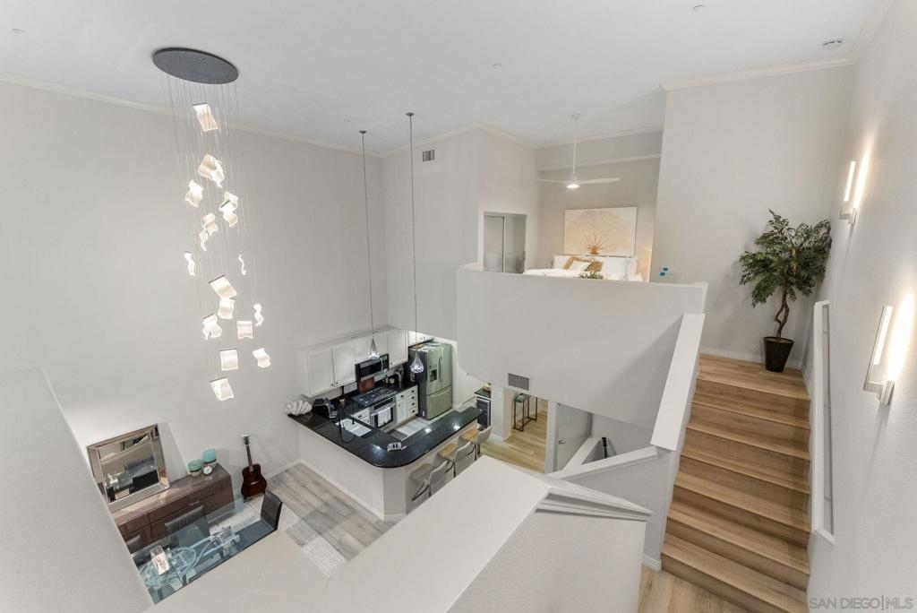 Welcome to 1501 India St Unit 613, nestled in the heart of Little Italy, offering STUNNING Bay and City views. This absolute CHARM of a unit is located on the top floor of the highly sought-after “Village Walk” community. Upon entering, you are greeted by alluring 20-ft ceilings and a delightful open concept that magnifies every inch of the property. The enormous kitchen along with the large living room and wide-ranging dining area offers the perfect space to enjoy, gather, and entertain while the bedroom upstairs provides an optimal space to enjoy peace and serenity directly across from the balcony—the perfect outdoor space to take in the breathtaking views. The primary bathroom is highlighted by new fixtures, a new barn door, a new vanity and high-end vanity mirror, and a new bidet. The optional bedroom downstairs offers multiple possibilities to maximize the space, whether it be an office, a den, or whatever suits your lifestyle. Additional upgrades include luxury electric shades to complement the dual-pane windows, a new high-end chandelier, new lighting fixtures, a built-in wine cooler, and more. A short elevator ride downstairs leads you to San Diego’s finest entertainment options, such as the San Diego Bay, multiple award-winning restaurants and coffee shops, and the renowned “Little Italy Farmers Market.” In addition to the highly desirable walkability, this luxurious unit offers easy access to the 5 and 163 freeways, as well as a short commute to San Diego International Airport, allowing for ease and convenience of travel in every regard. Come have a look!