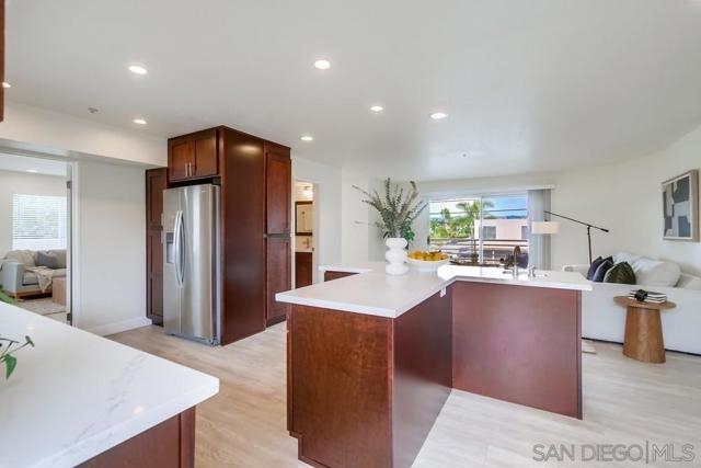 Incredibly rare, almost 2,000 square foot single level condo, in the heart of Crown Point, Pacific Beach. SHORT TERM RENTALS ALLOWED in the complex- projections attached! Beautifully remodeled with over $150,000 in new luxury flooring, quartz countertops, real wood cabinetry, stainless steel appliances, lighting, fixtures, fresh paint throughout, & more. Featuring a spacious floor plan with a dedicated dining area, formal living room with a fireplace, & a family room connected to the open kitchen which includes a large island & breakfast nook. This home showcases our temperate beach climate with 5 private outdoor spaces totaling approximately 400 square feet & the largest located right off the family room with plenty of space for entertaining, dining or watching sunsets over the neighborhood. The large primary bedroom has a walk-in closet, retreat space next to the two way fireplace, attached balcony & spacious, elegant bathroom with soaking tub, separate shower & 2 sink areas. Additional features: dedicated laundry room, plenty of storage/linen closets, recessed lighting & private/secure 1 car garage with additional off street parking spot behind the garage. This location is hard to beat...only 1 block to the Bay- sand, bike path, views or two blocks to the commercial hub for Crown Point- the famous Rocky's burger, new Tajima Ramen, North Park Beer Company, coffee shop, bar/restaurant & a market. Come live the true beach area lifestyle...walkability, sun/sand & enjoyment!