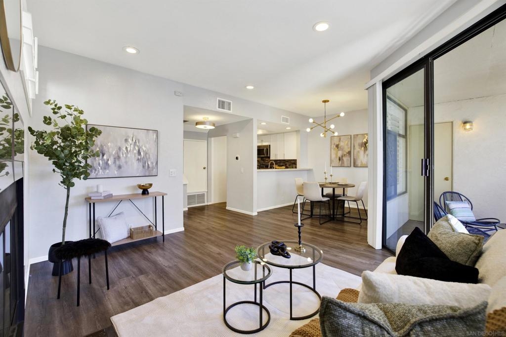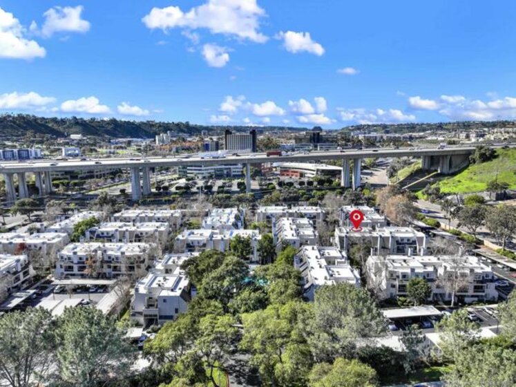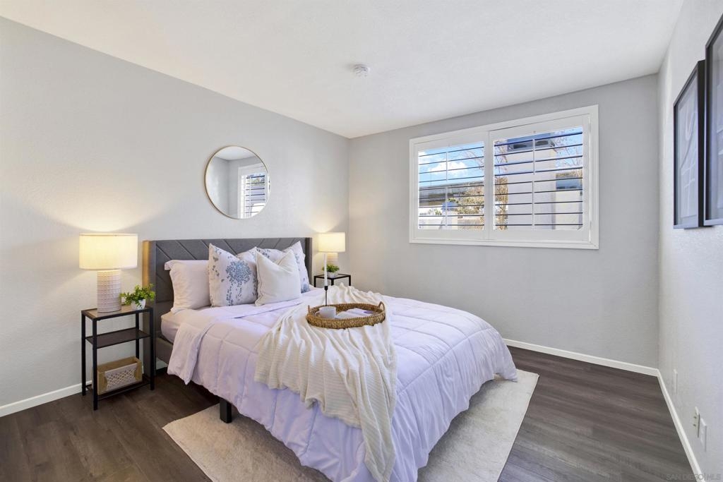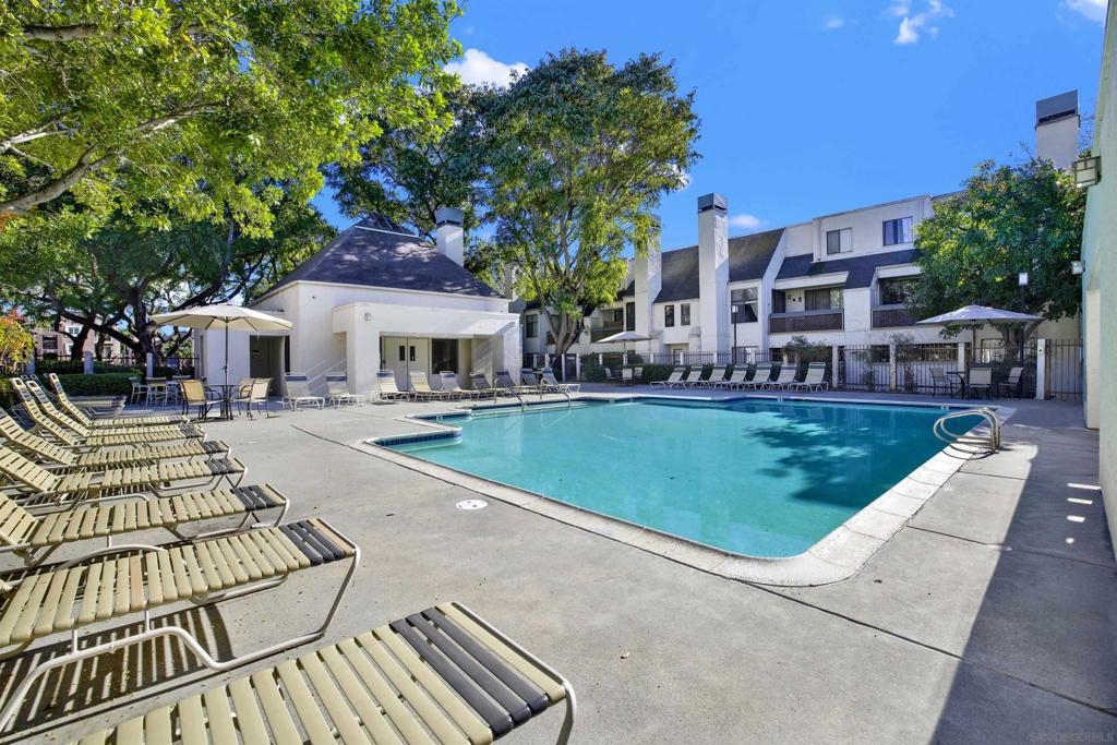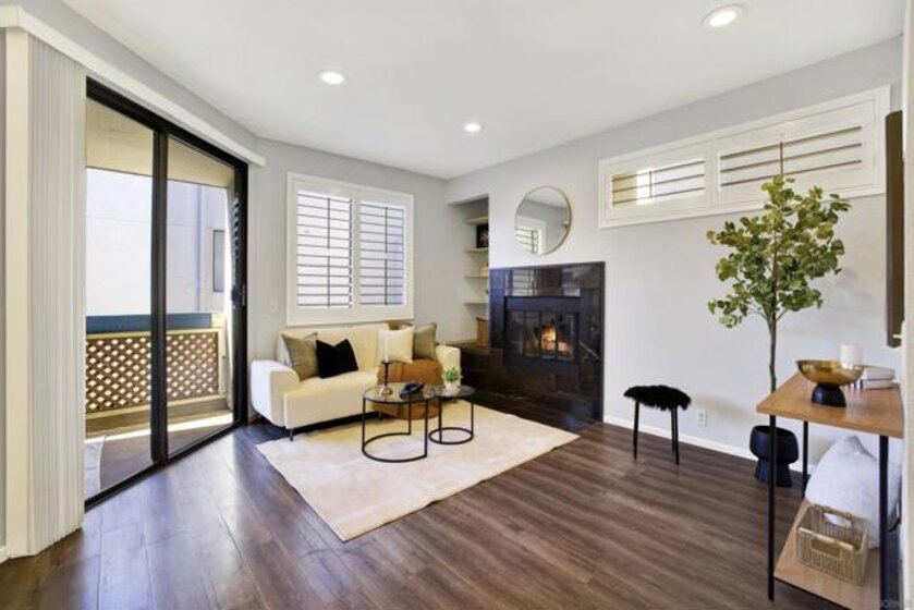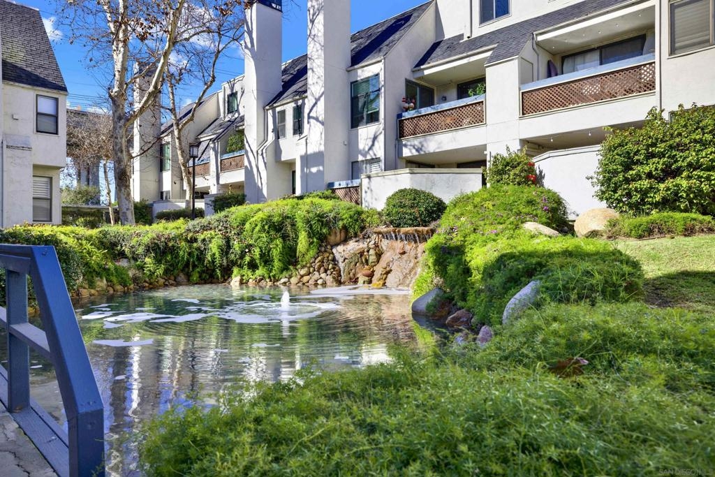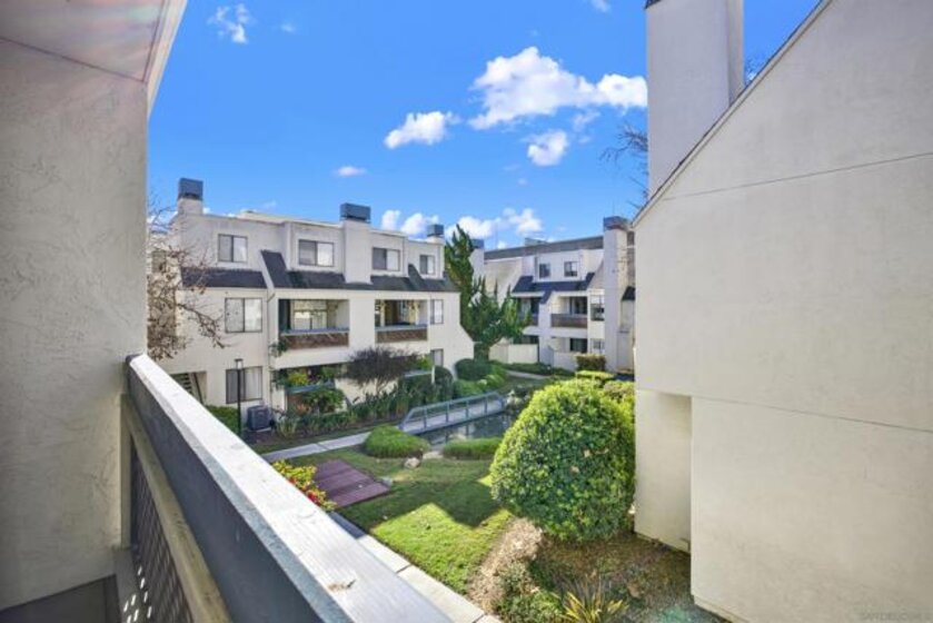 Highly sought-after Mission Valley location with unbeatable convenience! This rare upstairs unit, two-story condo has two separate entrances, and an open floor plan with natural light. Featuring 2 bedrooms and 1 full bathroom with two skylights, the home is perfectly positioned with tranquil pond & water-feature views from the generously sized balcony—an ideal spot to relax & unwind. Inside, enjoy a warm & inviting living space complete with a newly upgraded in-unit laundry, a wood-burning fireplace, recessed lighting, plantation shutters & stainless steel appliances. Central heat & air conditioning! Thoughtful upgrades include a Nest thermostat and a Schlage electronic door lock for modern comfort & peace of mind. A unique bonus to this unit is the additional private patio with a separate top-floor entrance—perfect for enjoying fresh air, a quiet retreat, or a convenient pet area as well as 2 assigned parking spots. The well-maintained complex offers great amenities including a pool & jacuzzi, expansive lounge area with two BBQ pits, ample patio seating with umbrellas, private bathrooms & a fully equipped gym—all securely accessible to owners only. Centrally located near shopping, dining, trolley, entertainment & major freeways, this Mission Valley condo truly offers the best of San Diego living.