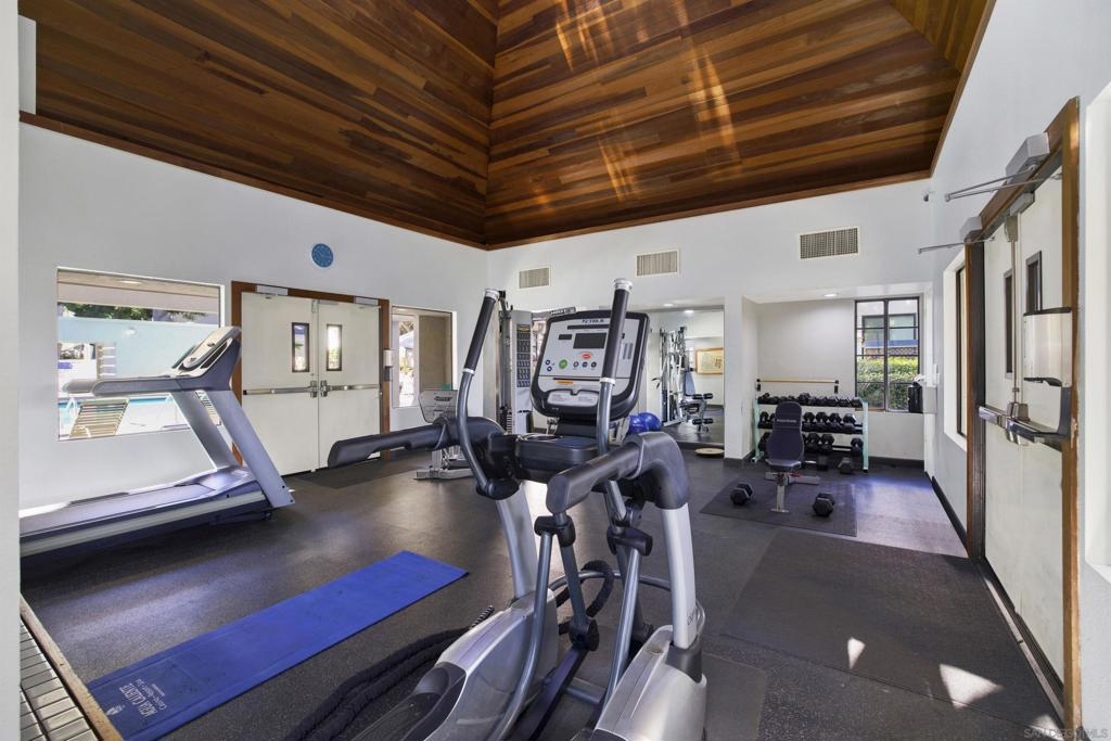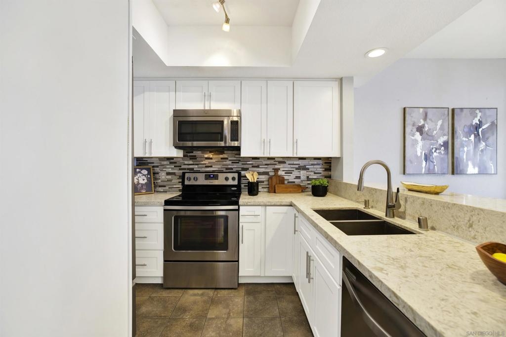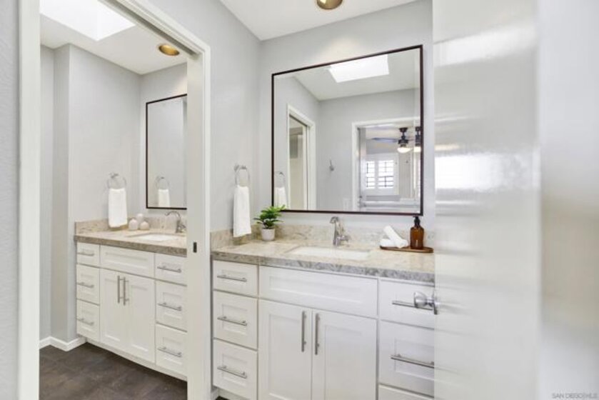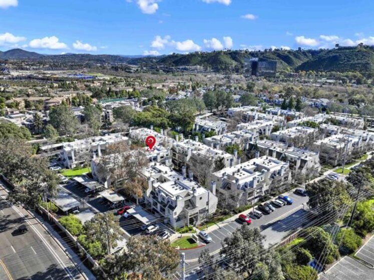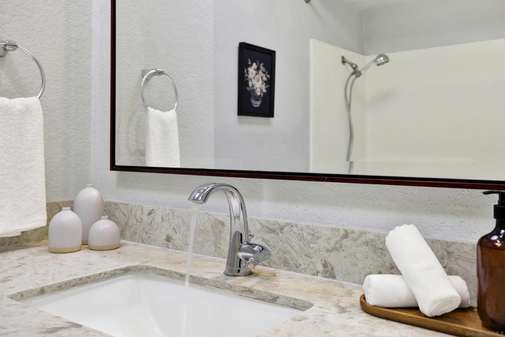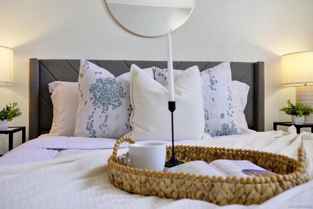 Highly sought-after Mission Valley location with unbeatable convenience! This rare upstairs unit, two-story condo has two separate entrances, and an open floor plan with natural light. Featuring 2 bedrooms and 1 full bathroom with two skylights, the home is perfectly positioned with tranquil pond & water-feature views from the generously sized balcony—an ideal spot to relax & unwind. Inside, enjoy a warm & inviting living space complete with a newly upgraded in-unit laundry, a wood-burning fireplace, recessed lighting, plantation shutters & stainless steel appliances. Central heat & air conditioning! Thoughtful upgrades include a Nest thermostat and a Schlage electronic door lock for modern comfort & peace of mind. A unique bonus to this unit is the additional private patio with a separate top-floor entrance—perfect for enjoying fresh air, a quiet retreat, or a convenient pet area as well as 2 assigned parking spots. The well-maintained complex offers great amenities including a pool & jacuzzi, expansive lounge area with two BBQ pits, ample patio seating with umbrellas, private bathrooms & a fully equipped gym—all securely accessible to owners only. Centrally located near shopping, dining, trolley, entertainment & major freeways, this Mission Valley condo truly offers the best of San Diego living.