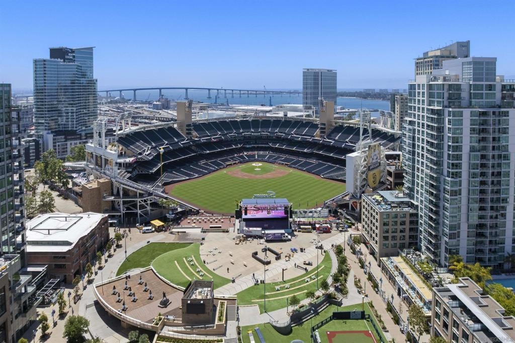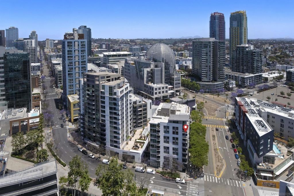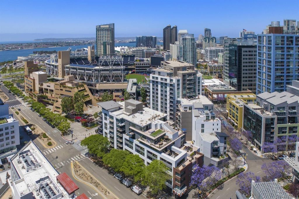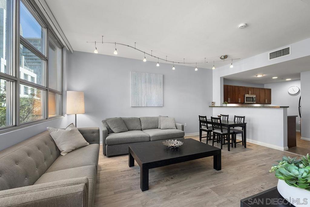Light, space, and style define this bright and open Park Terrace residence. Oversized windows fill the living and dining area with natural light, nicely complemented by sleek track lighting and warm luxury vinyl plank flooring throughout. Step outside onto your private balcony and take in a lush, tree-lined streetscape framed by the Downtown skyline with the iconic San Diego Central Library dome as your backdrop and peek views toward Petco Park. The open-concept layout flows from the living room to a well-appointed kitchen featuring granite countertops, stainless appliances, and recessed lighting. The bedroom offers a spacious walk-in closet, and a full bath with shower/tub combo keeps things practical. An oversized dedicated parking and north-facing exposure (keeping the unit cool and comfortable year-round) seal the deal. Steps from the Gaslamp Quarter, Petco Park, and the waterfront, this is Downtown San Diego living done right Park Terrace puts you in the heart of East Village, just steps from Petco Park and the lively Gallagher Square. Surrounded by local favorites like Lestat’s on Park for coffee, Café Chloe for French-inspired dining, and Parkhouse Eatery for brunch, residents enjoy a walkable lifestyle filled with trendy cafés, restaurants, and nightlife. With ballgames, concerts, and community events right outside your door, Park Terrace offers truly prime Downtown living. Residents of Park Terrace enjoy amenities such as a well-equipped fitness center, recreation room with pool table, and an inviting community courtyard complete with lounge areas and barbecues, perfect for gatherings with friends and neighbors.