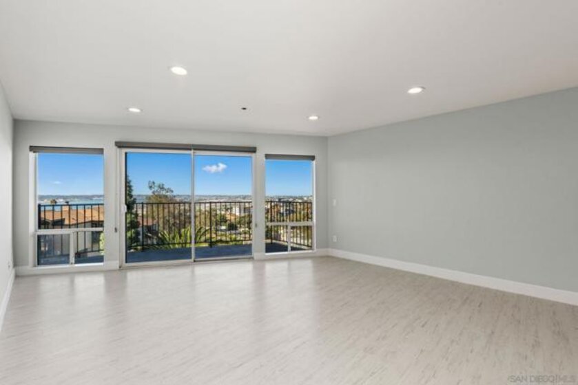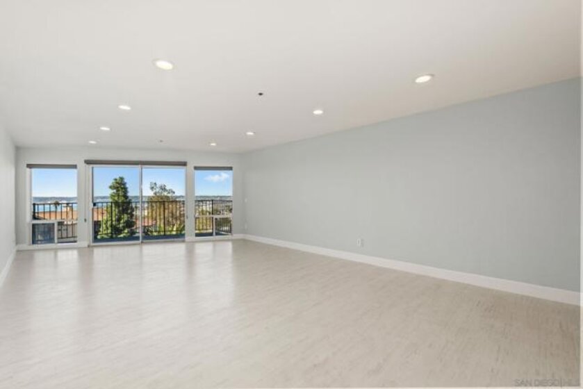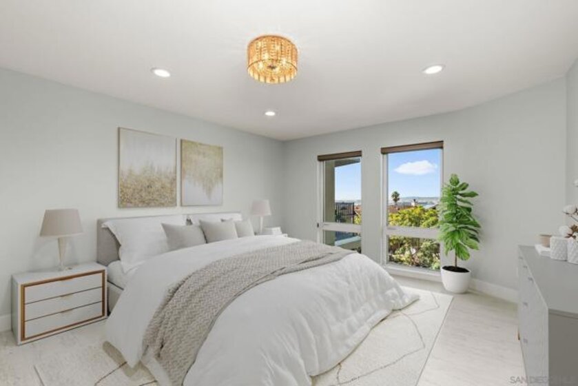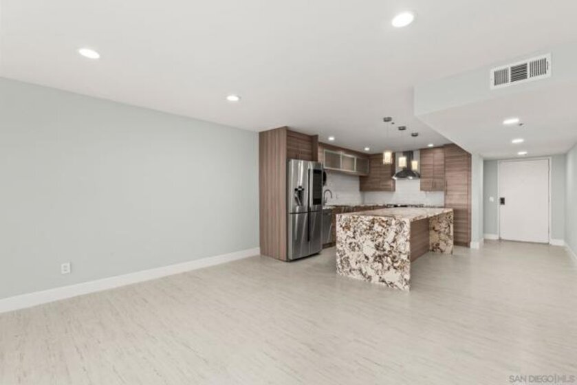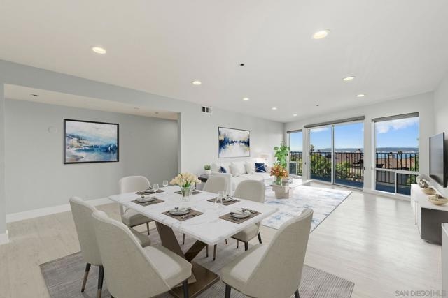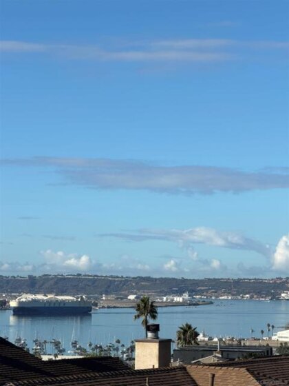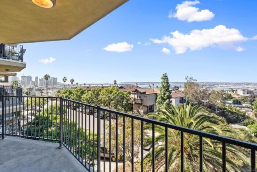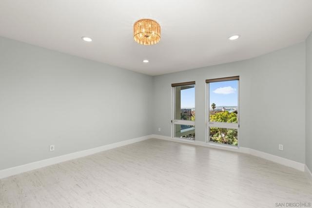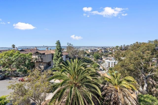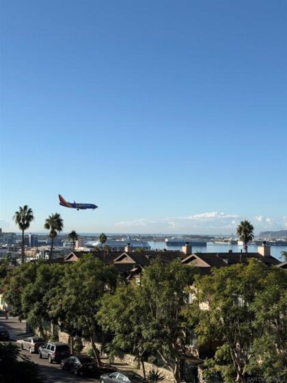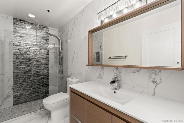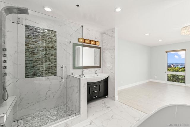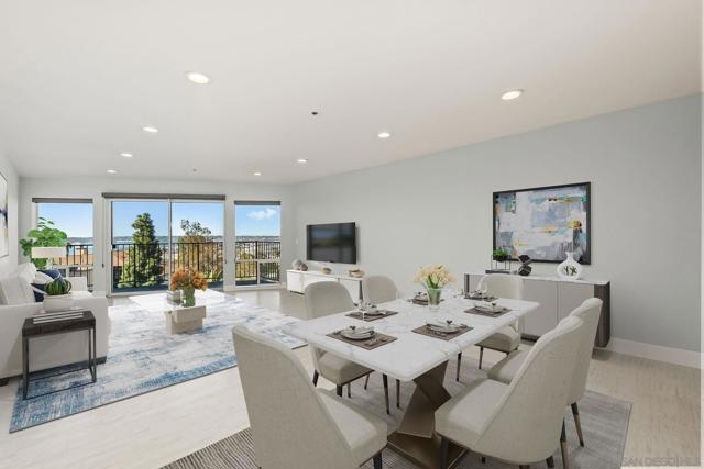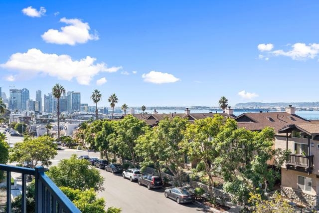 Experience elevated urban living in this beautifully reimagined 2BR/2BA Condo offering sweeping 180° Bay views from the glittering Downtown skyline to Point Loma. The spacious open layout showcases a chef’s kitchen anchored by a dramatic 10-foot granite cascading island, custom cabinetry, and premium SS appliances. The living and dining areas open to a large west-facing balcony where sunset bay views and airplane landings steal the show. The serene primary suite features peaceful bay views, a spa-inspired bathroom with a soaking tub, walk-in shower, marble & mosaic tile accents, plus a custom-designed walk-in closet. The generously sized second bedroom offers comfort and privacy for guests or office use with an adjacent stylish guest bath, finished with marble and designer tile. Throughout the home, enjoy luxury vinyl flooring, custom lighting, abundant in-unit storage, and the convenience of a full laundry room. All this in a perfectly positioned, well-maintained building, features solar panels for an almost zeroed out SDGE bill, steps from top restaurants, boutiques, cafés, and more.