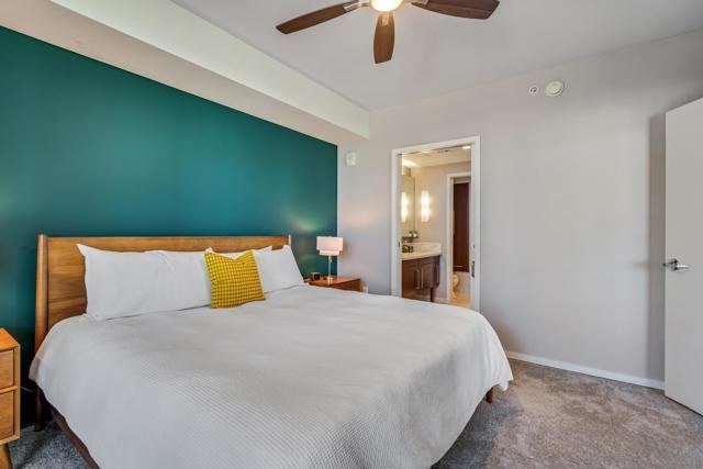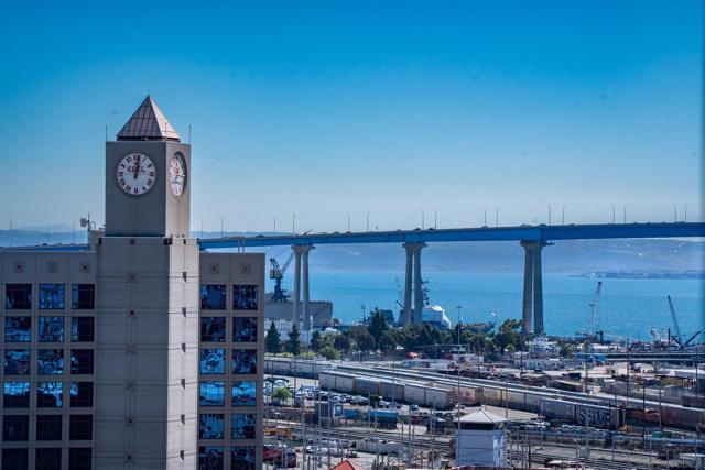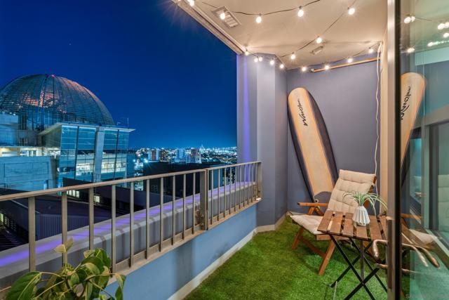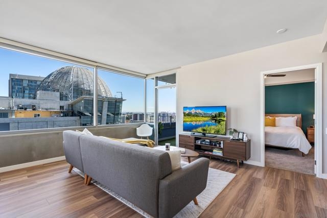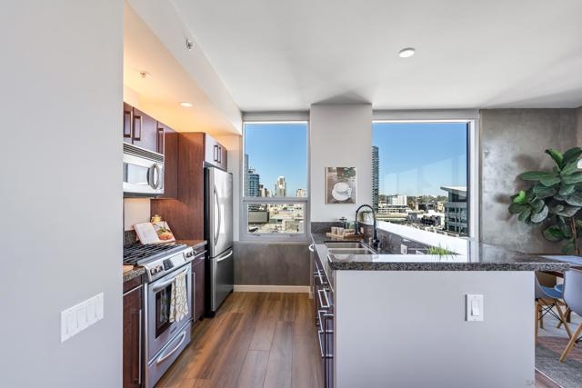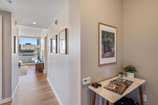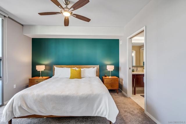 Experience elevated downtown living at ICON, where modern design meets timeless sophistication. This meticulously maintained and upgraded northeast corner residence showcases breathtaking panoramic views of the San Diego Bay, Coronado Bridge, and the sparkling city skyline. Step through the entryway into a light-filled, open-concept floor plan featuring new carpet, wood-look flooring, and fresh designer paint throughout. The gourmet kitchen impresses with stainless steel appliances, sleek granite countertops, and ample cabinetry—perfect for both casual dining and entertaining. The serene primary suite includes a fully built-out closet and a beautifully finished bath with dual vanities. Modern urban comforts include in-unit laundry, two parking spaces, and a private storage unit, providing both convenience and functionality to your downtown lifestyle. ICON is a VA-approved community offering resort-style amenities such as a 24-hour front desk attendant, state-of-the-art fitness center, and the iconic rooftop Skybox terrace with lounge seating, TVs, surround sound, BBQs, heaters, and panoramic city views. Additional amenities include the 5th Inning community recreation room with a full kitchen and business center, a private movie theater, community fireplace, bike and package storage with Amazon lockers, and an interior courtyard featuring sculptural art, a waterfall element, and modern landscaping. Residents also enjoy Google Fiber high-speed internet, on-site property management, and a sleek, contemporary lobby entrance. ICON is a VA-approved community offering resort-style amenities such as a 24-hour front desk attendant, state-of-the-art fitness center, and the iconic rooftop Skybox terrace with lounge seating, TVs, surround sound, BBQs, heaters, and panoramic city views. Additional amenities include the 5th Inning community recreation room with a full kitchen and business center, a private movie theater, community fireplace, bike and package storage with Amazon lockers, and an interior courtyard featuring sculptural art, a waterfall element, and modern landscaping. Residents also enjoy Google Fiber high-speed internet, on-site property management, and a sleek, contemporary lobby entrance. Explore the best of downtown living—just moments from Petco Park, Gallagher Square, the historic Gaslamp Quarter’s shops and dining, the Central Library, convenient trolley and bus lines, FIT Athletic Club, the Harbor Drive Pedestrian Bridge leading to The Rady Shell, the Convention Center, Seaport Village, Embarcadero Parks, the Coronado Ferry, and more. This home offers the perfect balance of sophistication and vibrant urban energy.