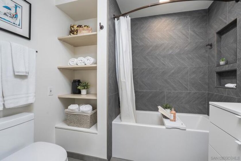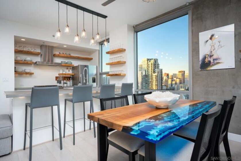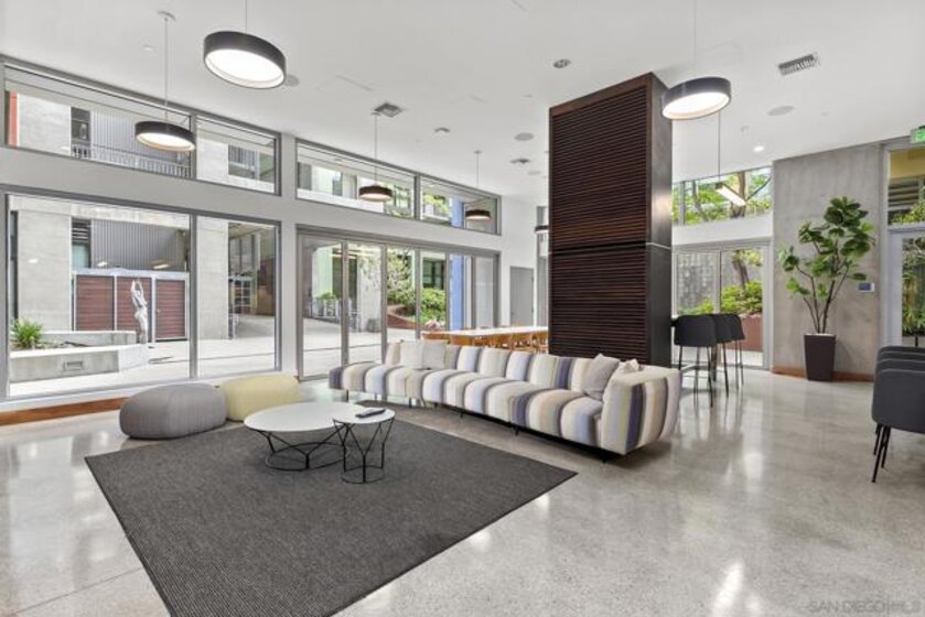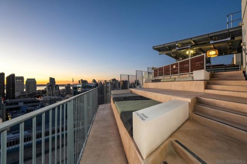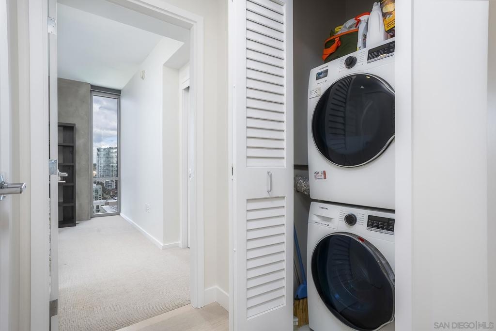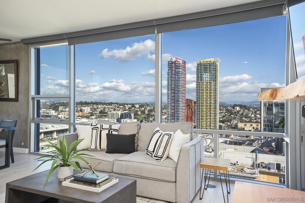 Experience elevated downtown living in this highly customized 2-bedroom, 2-bath residence at ICON, a premier concrete and steel high-rise in the heart of East Village. Sweeping northwest-to-southwest views stretch beyond the skyline to include the San Diego Central Library, distant mountain ranges, and glimpses of the bay. Floor-to-ceiling tinted windows frame the scenery while enhancing privacy and comfort throughout the home. Extensive custom upgrades set this residence apart, including a built-in Sonos sound system discreetly integrated within the walls for a clean, immersive experience. The primary suite is a true retreat, featuring automated blinds and a spa-inspired bath. A stackable washer and dryer are conveniently located in the in-unit closet, and nearly every detail has been thoughtfully customized for modern urban living. ICON delivers a secure, full-service lifestyle with controlled-access lobbies, underground parking, 24-hour on-site property management and staff, and residential trash chutes on every floor. The home includes secure two-car tandem garage parking. Residents enjoy a 1,700-square-foot fitness center with WiFi, a community theater room with raised seating and a 135-inch HD screen, and the 5th Inning Community Lounge with a full kitchen, TV, WiFi, and comfortable seating ideal for larger gatherings. The rooftop Skybox and viewing terrace, located across the street from Petco Park, offer unobstructed ballpark views with BBQs, surround sound, space heaters, and WiFi—perfect for enjoying games, concerts, and city events year-round!