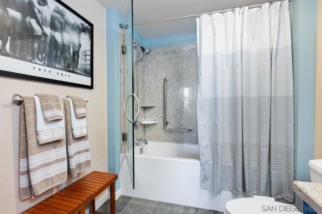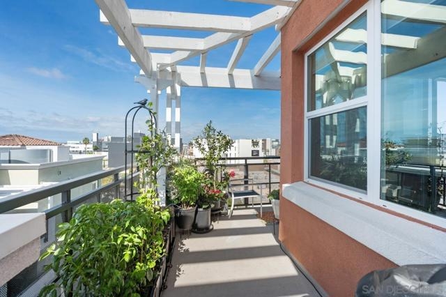 Come experience this stunning northwest-corner penthouse offering ocean & downtown views & breathtaking sunsets from two private balconies—one off the primary suite and another wrapping around the spacious great room. This open-concept floor plan combines elegance and functionality with abundant natural light and an incredible breeze from the top floor. The beautifully upgraded kitchen features a new Cambria quartz island, custom cabinetry, designer fixtures, a water filtration system, and a KitchenAid Eco Series 24” top-control dishwasher. Thoughtful details include custom-painted cabinets, metal roller pull-out shelving, a new backsplash, and three stylish pendant lights. The custom-built bar with quartz countertop and 52-bottle wine refrigerator—enhanced by new bar lighting and a chic dining-area chandelier—creates the perfect space for entertaining. Additional upgrades include a TV entertainment system with integrated lighting, new ceiling fans in the living room and guest bedroom, blackout roller shades in both bedrooms, custom-painted bathroom cabinets with framed mirrors, and new carpet in the hallway and bedrooms (installed just 2½ years ago). This home is in pristine condition within a community that recently received fresh custom paint and new carpeting throughout all common areas—reflecting pride of ownership, a strong HOA and attention to detail. Enjoy side-by-side parking, large secure walk in storage unit in garage, EV chargers, pool, hot tub, gym, and a social lounge, all just steps from Balboa Park and Hillcrest’s vibrant restaurants and nightlife.