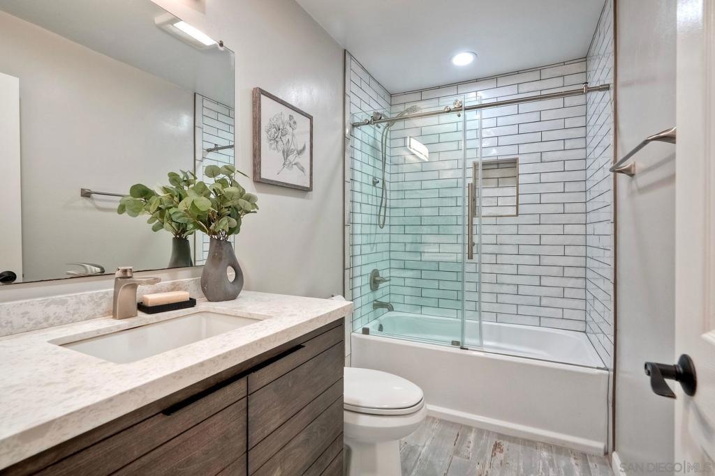 Located in one of the best, private and quiet spots in the complex, this first-floor corner unit is surrounded by lush greenery. Fully remodeled from top to bottom! The bright and open layout features: Modern kitchen with quartz countertops, stainless steel appliances, and a convenient breakfast bar. Spacious living room with a stylish marble fireplace. Generously sized primary bedroom with a large walk-in closet and a beautifully updated en-suite bathroom featuring a walk-in shower with pebble tile. Second bedroom is spacious and the second bathroom offers a tub for relaxation. Private patio perfect for outdoor enjoyment. Attached 2-car garage for your convenience. Community amenities include a sparkling pool and relaxing hot tub.