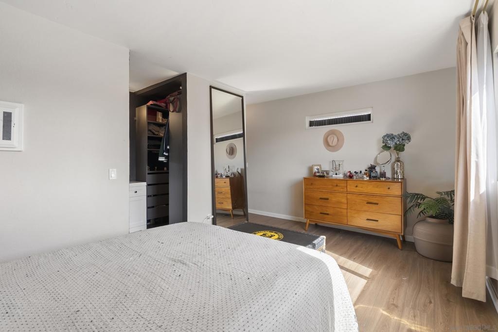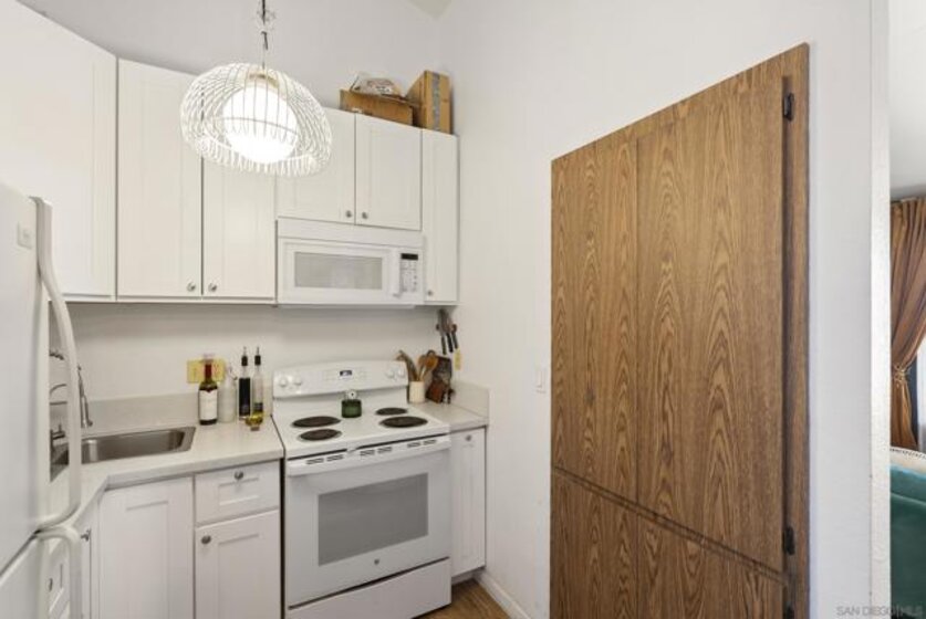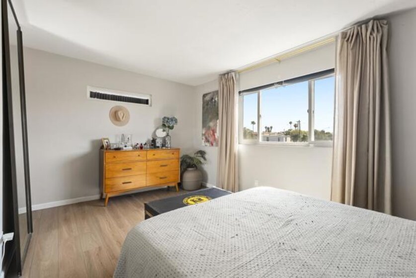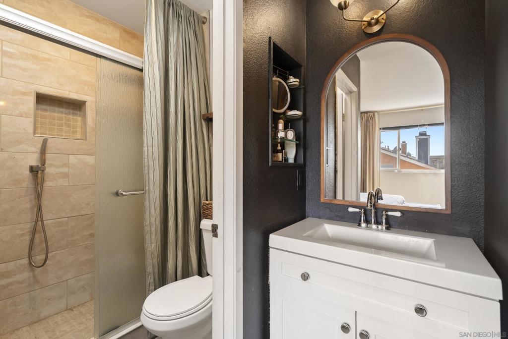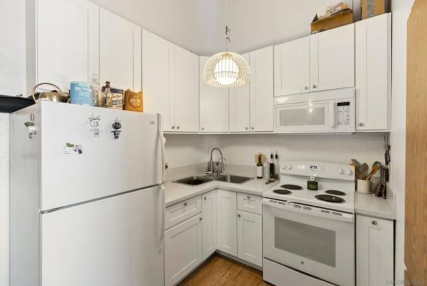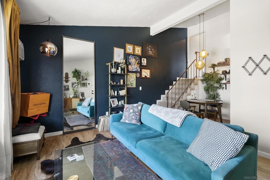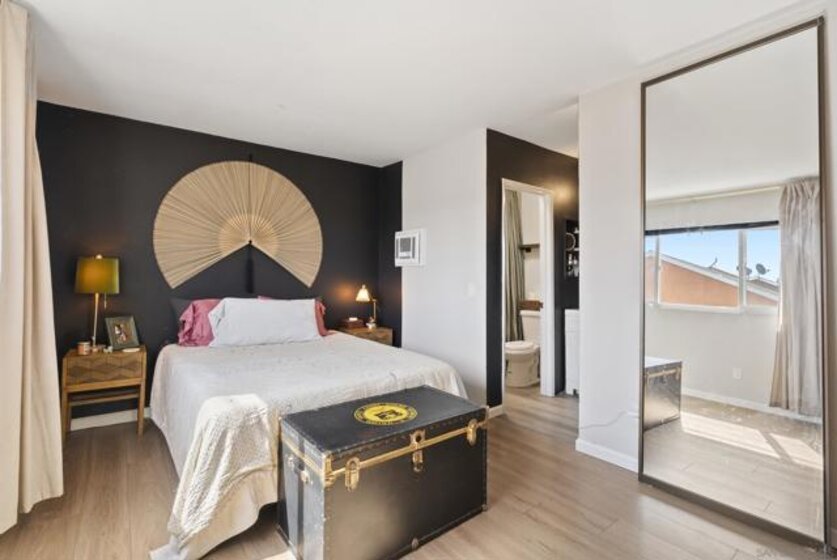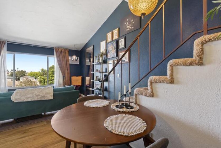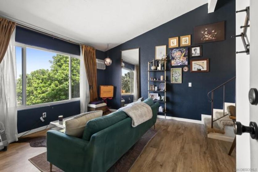 This one isn't your average condo, it's a two-story residence with the living space and kitchen on the main level and the bedroom tucked upstairs, creating a separation of space that feels more like a home than a unit. The split-level layout opens up to vaulted ceilings that pull in natural light that fills the space, giving the space an openness that the square footage alone doesn't tell you. The living room is anchored by the oversized window with unobstructed views and warm vinyl plank floors that run throughout both levels. The kitchen is clean and functional with white shaker cabinets, a pendant light, and everything you need without any wasted space. Upstairs, the bedroom is a proper retreat with a dramatic accent wall, generous natural light, and access to a walk-in closet that has been upgraded with a custom organization system. The bathroom is shower-only, an arched wood-framed mirror, and brushed gold fixtures. One parking space plus a private garage space are included. HOA is just $224/month and covers water, trash, sewer, common area maintenance, and your laundry facilities on site! It is rare to find a unit with this many compelling features under $400k. If you want a place that actually has a vibe and character, this is the one you've been waiting for.