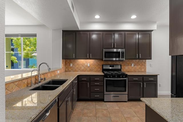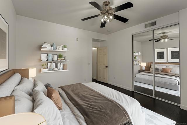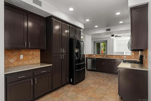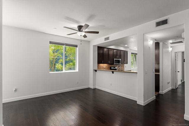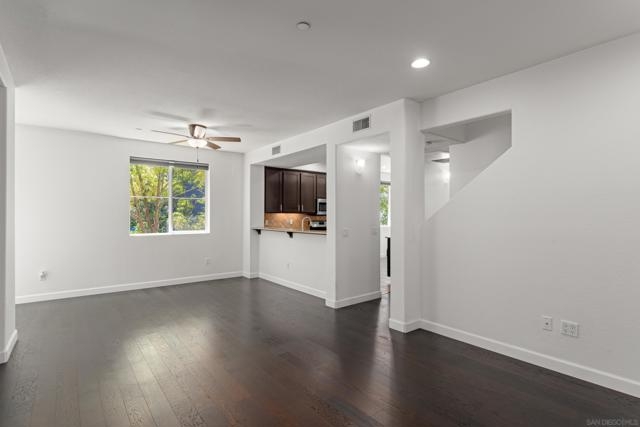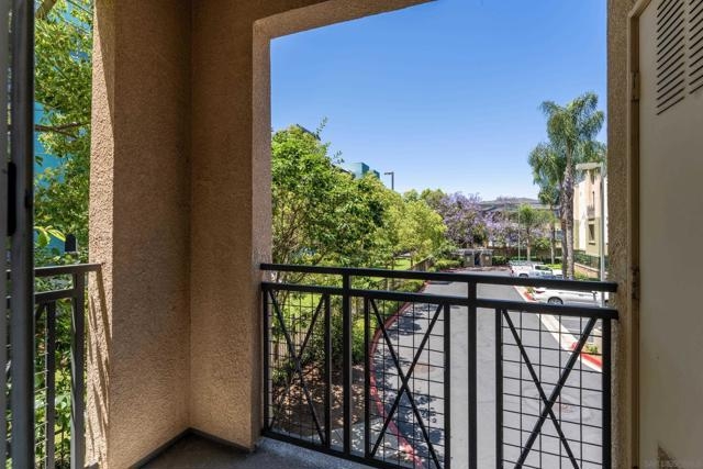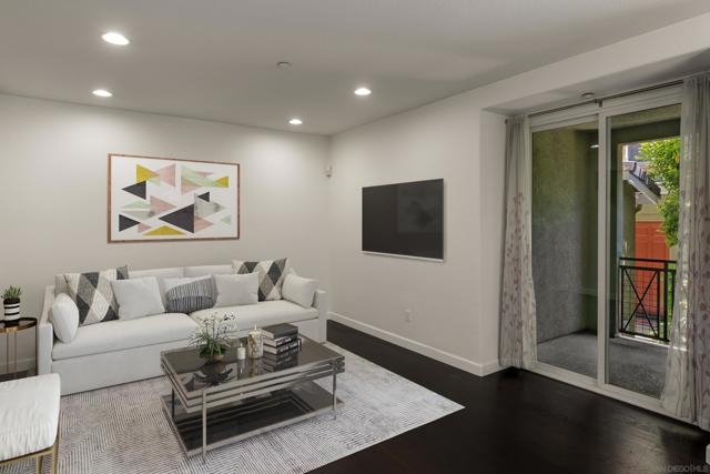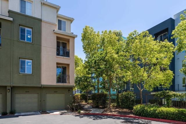FHA/VA Approved! Bright, welcoming, and ideally located, this end-unit townhome in the Tribeca community offers a smart layout and everyday comfort in the heart of Kearny Mesa. Set on a quiet street lined with palm trees and just steps from a local park, the home blends modern convenience with easy access to shopping, dining, major freeways, and everyday essentials. Inside, you’ll find a thoughtfully well-maintained space featuring hardwood flooring, dual-pane windows w/ custom window treatments, and recessed lighting throughout. The open-concept kitchen is both functional and inviting, with stainless steel appliances, granite countertops, a stylish tile backsplash & ample cabinet and counter space. A breakfast bar adds flexibility for casual meals or entertaining. The main level features two private balconies with no direct neighbors, offering added privacy and a peaceful setting for morning coffee or evening relaxation. The layout flows smoothly into the living and dining areas, with a guest bedroom and full bathroom just down the hall. Custom designed closets with added storage in each bedroom enhance both style and organization. An in-unit washer and dryer complete the convenience of the second floor. Upstairs, the primary suite occupies the entire floor, offering a private retreat with an ensuite bathroom. Amenities include a two-car tandem garage with built-in cabinets & workspace and forced a/c, while the community provides pool, spa, and BBQ areas. Take advantage of this rare opportunity to own in one of San Diego’s most convenient and well-connected neighborhoods.