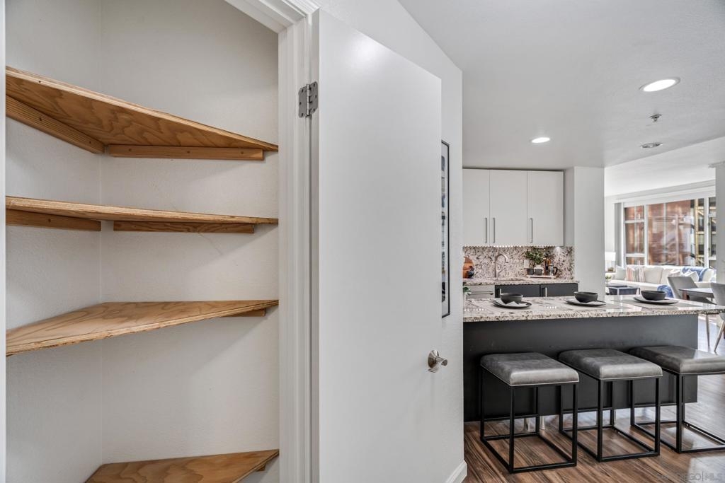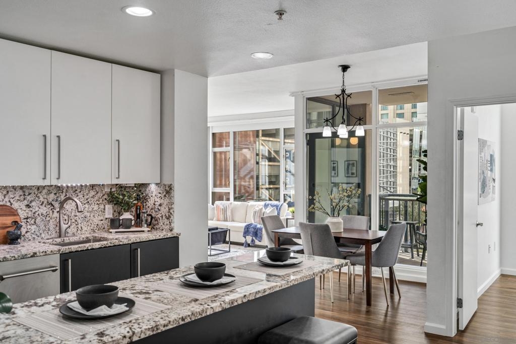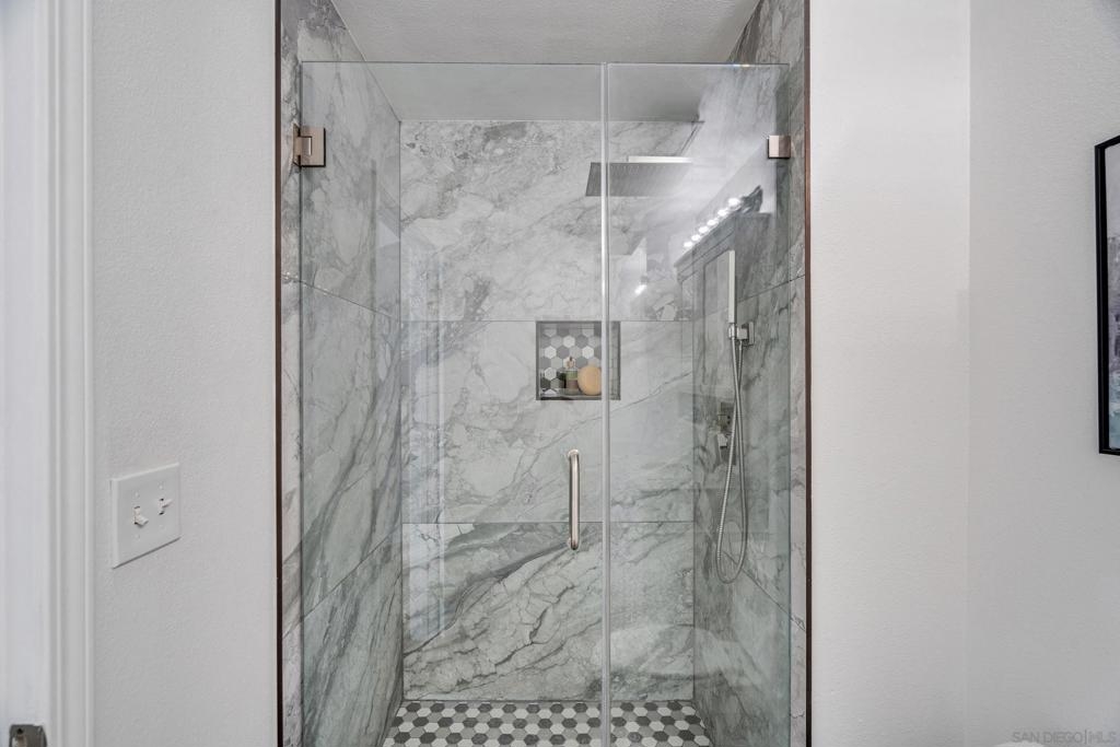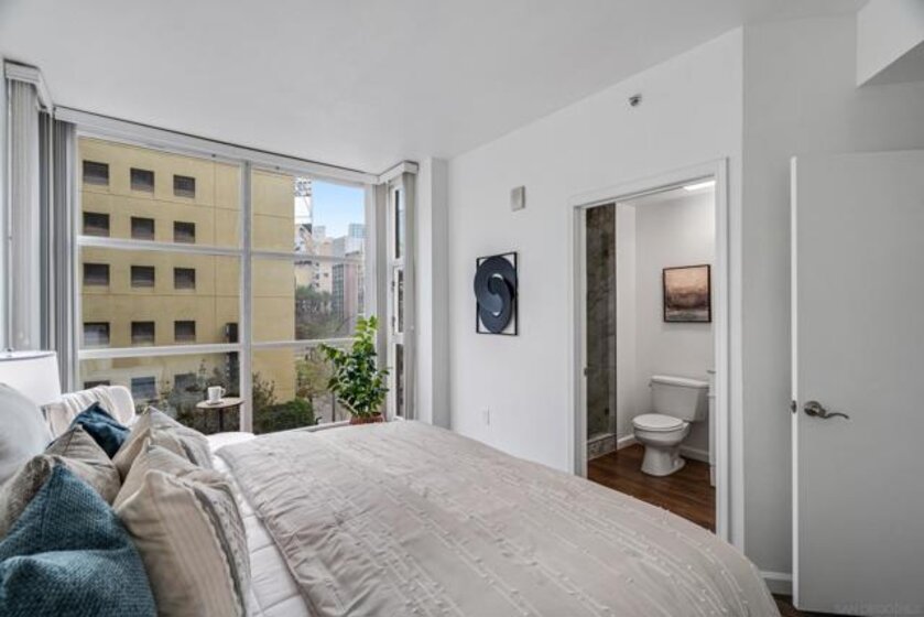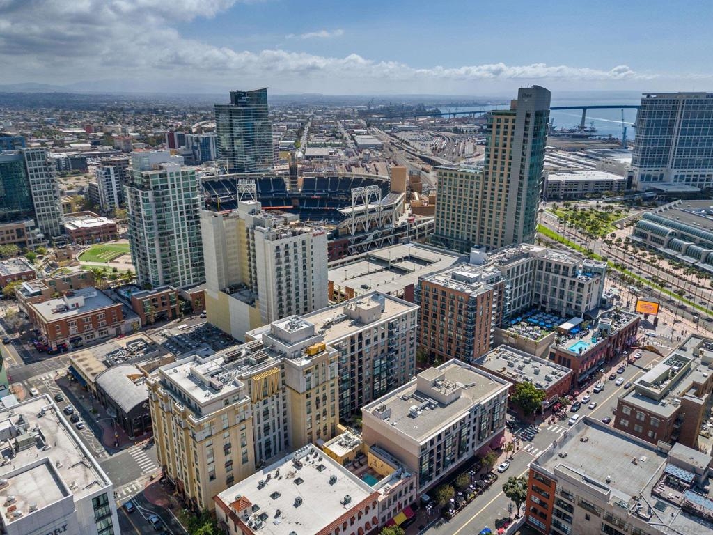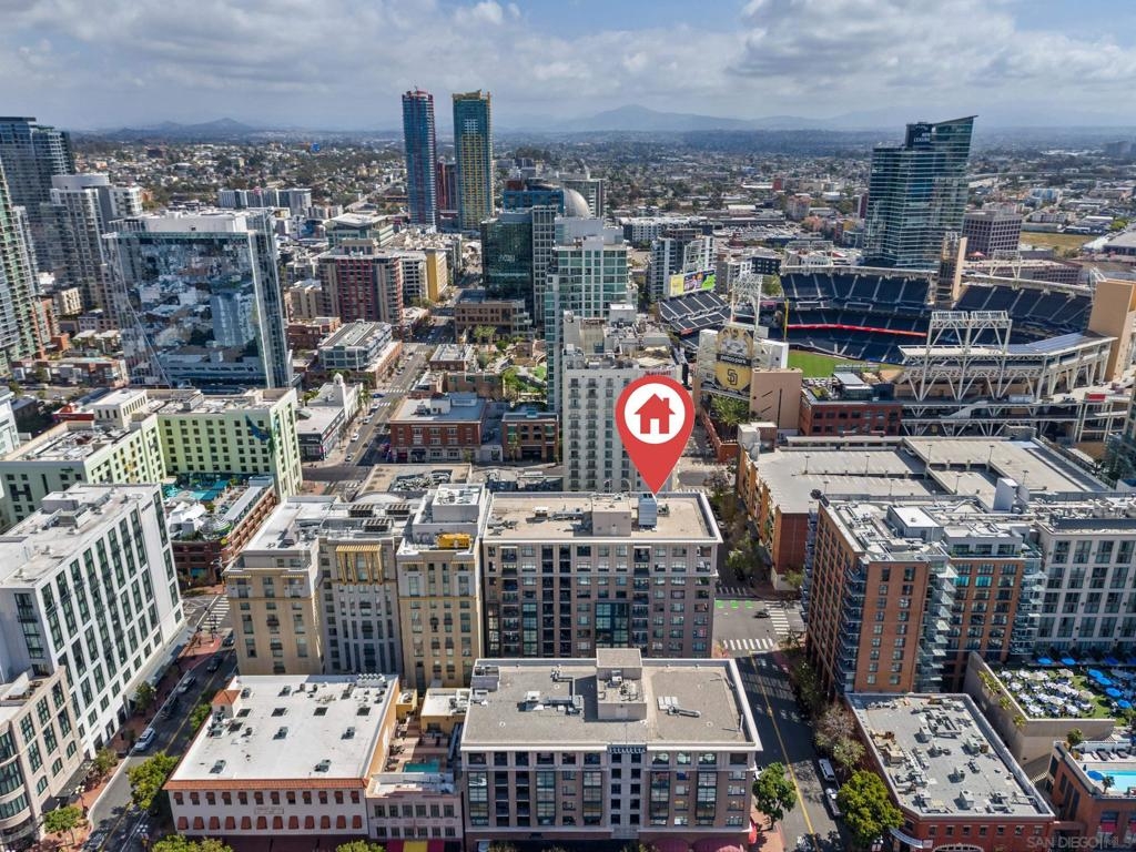 Experience a sophisticated and effortless downtown lifestyle from this perfectly positioned southeast corner residence, where abundant natural light and thoughtful design create the ideal lock-and-leave urban retreat. This exceptional two-bedroom condo with a desirable split floor plan & two parking spaces (side-by-side) offers both privacy and functionality while showcasing stylish, desirable upgrades throughout. Step through the entryway into an open-concept living space featuring views of Petco Park and the iconic right-field jumbotron, creating a dynamic downtown backdrop. The reimagined gourmet kitchen impresses with a newly added island and pantry, luxurious granite countertops with a full-height backsplash, and a suite of upgraded appliances, including a ZLINE range for coveted gas cooking, dishwasher, microwave hood, and refrigerator—perfect for both casual dining and effortless entertaining. The serene primary suite features custom built-in closets and a beautifully renovated bathroom showcasing large-format tile, an elegant Carrera marble vanity, and an oversized mirrored medicine cabinet. The guest bathroom has also been fully remodeled, offering matching finishes and contemporary design. Additional highlights include luxury vinyl flooring throughout, designer paint, custom built-in closets in both bedrooms, two hallway closets with integrated shelving, and a thoughtfully designed layout that maximizes both comfort and livability. Modern urban comforts include in-unit laundry and, providing both convenience and functionality. Trellis is a VA-approved community offering exceptional amenities, including weekend evening security, a fully equipped fitness center, rooftop BBQ terraces on the second floor, an interior courtyard seating with a tranquil water feature, Amazon package lockers, a community information display, and a sleek modern lobby entrance. Residents enjoy a prime downtown location close to Petco Park, Gallagher Square, the historic Gaslamp Quarter archway, renowned dining and shopping, bus and trolley transportation, the new Children’s and Dog Park, and the Harbor Drive Pedestrian Bridge, which connects to The Rady Shell, the Convention Center, Seaport Village, Embarcadero Parks, the Coronado Ferry Landing, and San Diego Bay. The very best of the city is just moments from home.