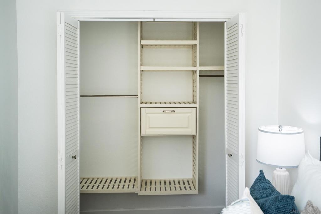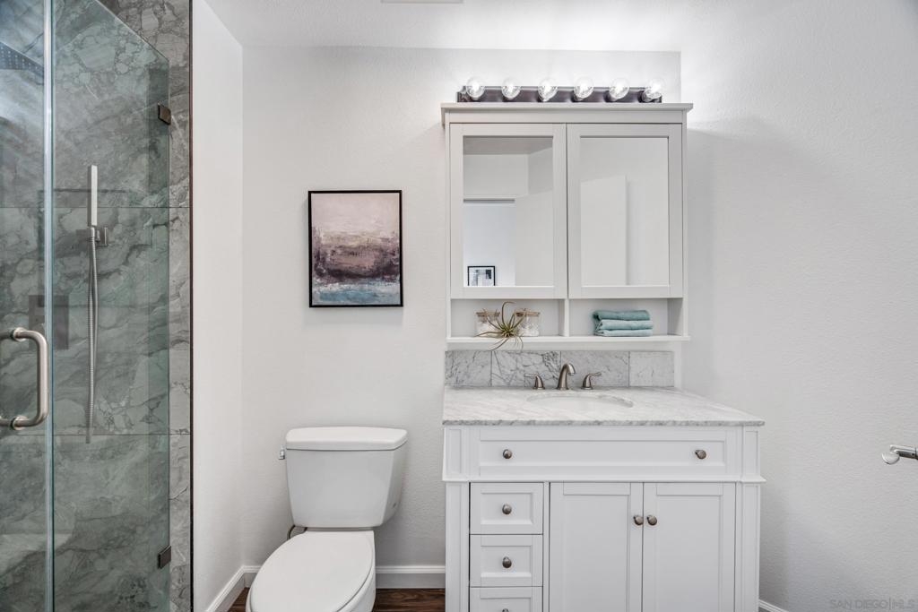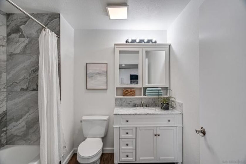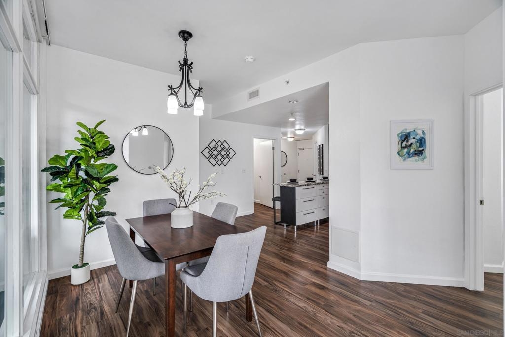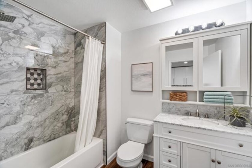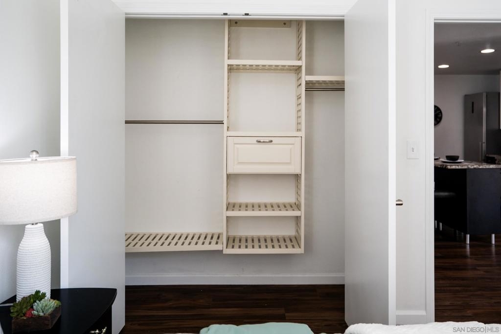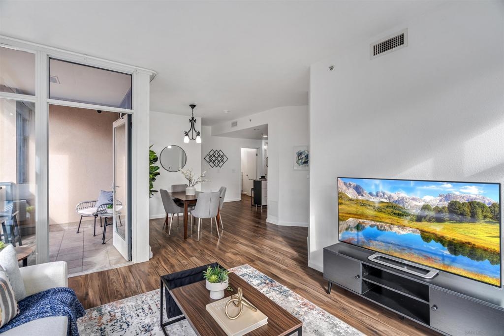 Experience a sophisticated and effortless downtown lifestyle from this perfectly positioned southeast corner residence, where abundant natural light and thoughtful design create the ideal lock-and-leave urban retreat. This exceptional two-bedroom condo with a desirable split floor plan & two parking spaces (side-by-side) offers both privacy and functionality while showcasing stylish, desirable upgrades throughout. Step through the entryway into an open-concept living space featuring views of Petco Park and the iconic right-field jumbotron, creating a dynamic downtown backdrop. The reimagined gourmet kitchen impresses with a newly added island and pantry, luxurious granite countertops with a full-height backsplash, and a suite of upgraded appliances, including a ZLINE range for coveted gas cooking, dishwasher, microwave hood, and refrigerator—perfect for both casual dining and effortless entertaining. The serene primary suite features custom built-in closets and a beautifully renovated bathroom showcasing large-format tile, an elegant Carrera marble vanity, and an oversized mirrored medicine cabinet. The guest bathroom has also been fully remodeled, offering matching finishes and contemporary design. Additional highlights include luxury vinyl flooring throughout, designer paint, custom built-in closets in both bedrooms, two hallway closets with integrated shelving, and a thoughtfully designed layout that maximizes both comfort and livability. Modern urban comforts include in-unit laundry and, providing both convenience and functionality. Trellis is a VA-approved community offering exceptional amenities, including weekend evening security, a fully equipped fitness center, rooftop BBQ terraces on the second floor, an interior courtyard seating with a tranquil water feature, Amazon package lockers, a community information display, and a sleek modern lobby entrance. Residents enjoy a prime downtown location close to Petco Park, Gallagher Square, the historic Gaslamp Quarter archway, renowned dining and shopping, bus and trolley transportation, the new Children’s and Dog Park, and the Harbor Drive Pedestrian Bridge, which connects to The Rady Shell, the Convention Center, Seaport Village, Embarcadero Parks, the Coronado Ferry Landing, and San Diego Bay. The very best of the city is just moments from home.