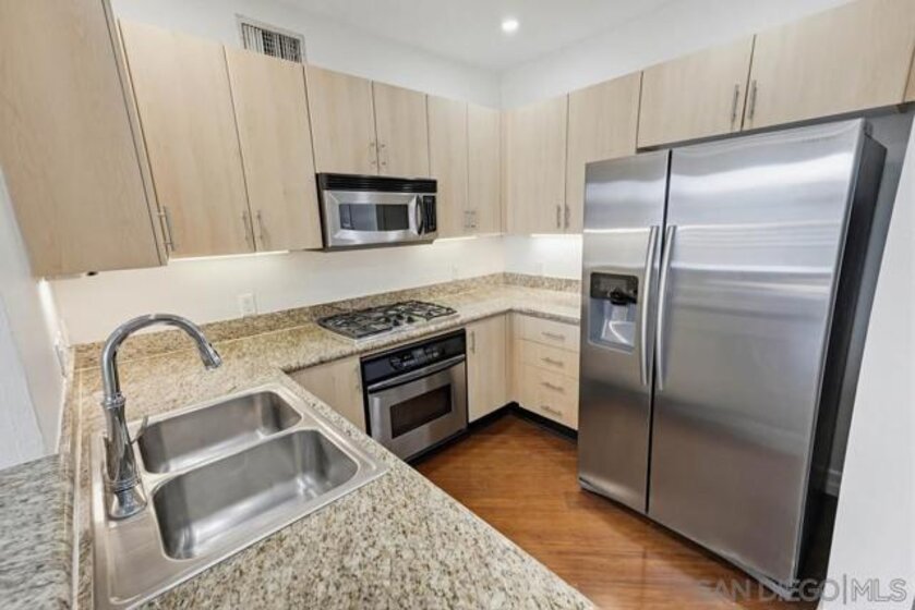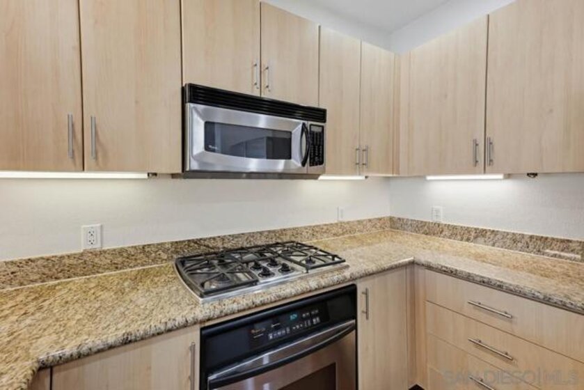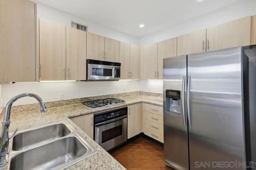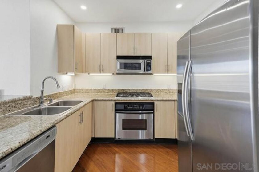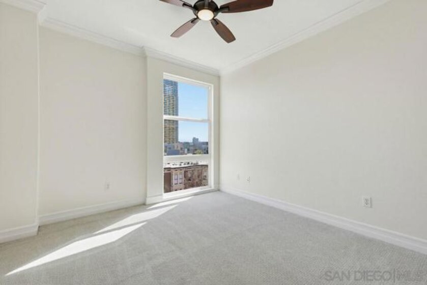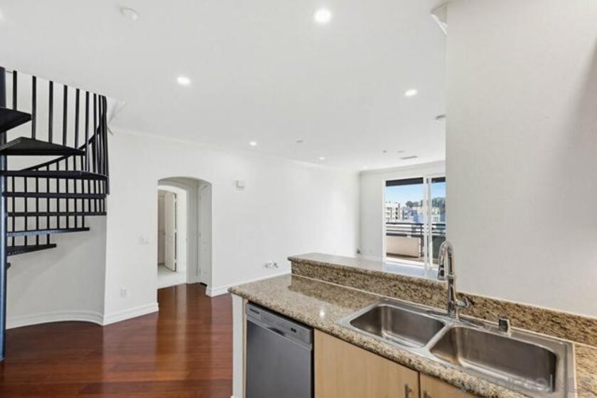 Top-floor residence at Park Blvd West featuring a rare PRIVATE ROOFTOP DECK with stunning downtown skyline views! This home offers an outdoor setup rarely found in East Village: a massive private roof deck plus a second balcony off the main living area. Inside, the split 2BR/2BA floor plan provides ideal privacy, with bedrooms separated by a bright, open living space refreshed with new paint, new recessed lighting, and brand-new carpeting. Hardwood floors anchor the main living areas, while the kitchen features clean modern cabinetry, granite counters, and stainless steel appliances. The living room is designed for real living, offering great wall space for art or media, a cozy fireplace, and sliding doors for effortless indoor-outdoor flow. Upstairs, the rooftop deck is your personal urban escape—perfect for entertaining, fitness, or pets under the city lights. The primary suite includes a walk-in closet and en-suite bath with dual sinks. Notable essentials include in-unit laundry, central HVAC, and two coveted tandem parking spaces in a secure gated garage. Located just steps from Petco Park, the Trolley, and the best of downtown San Diego.