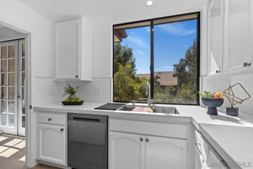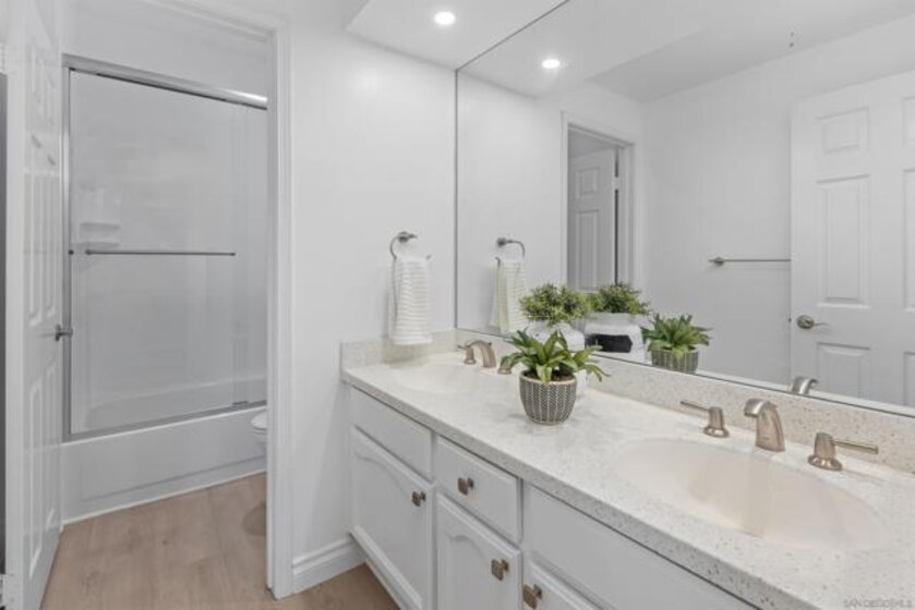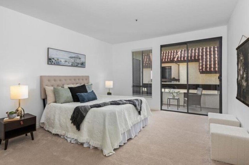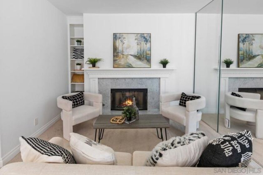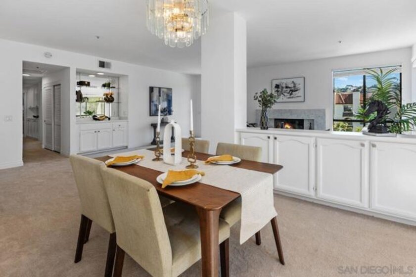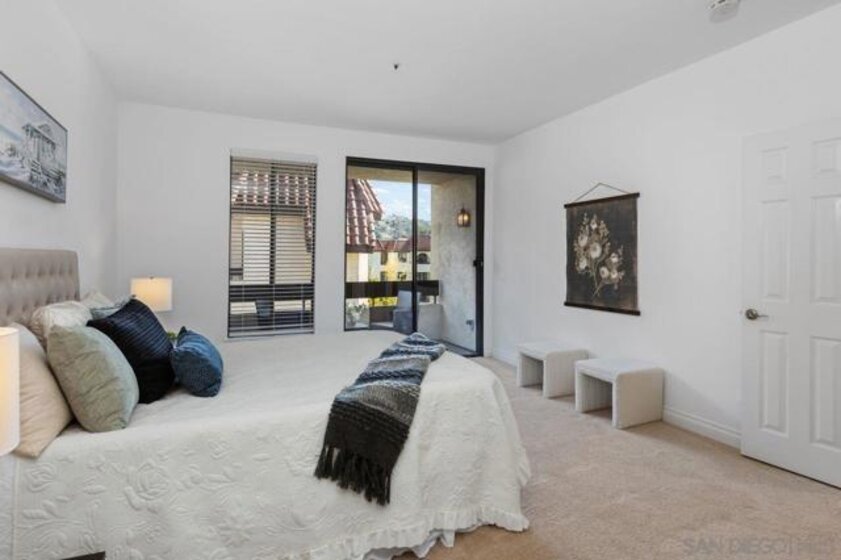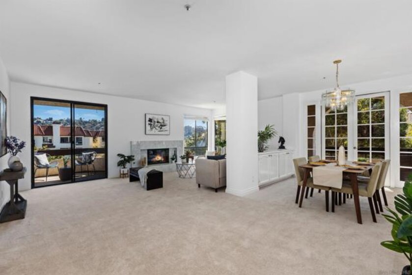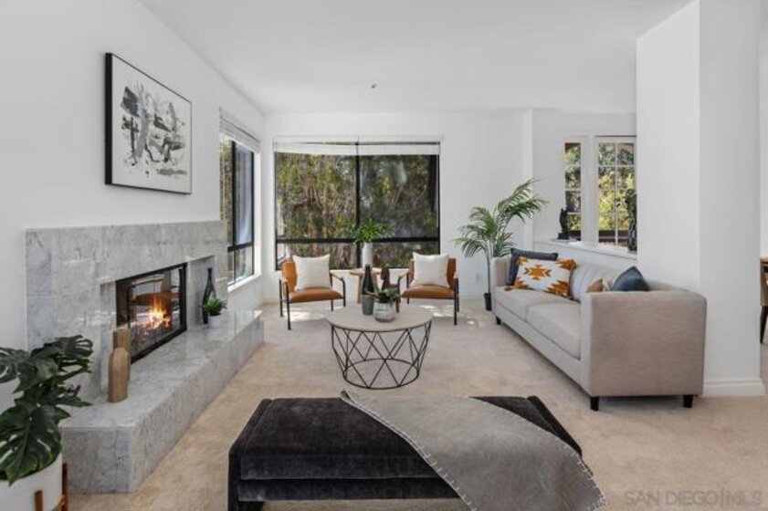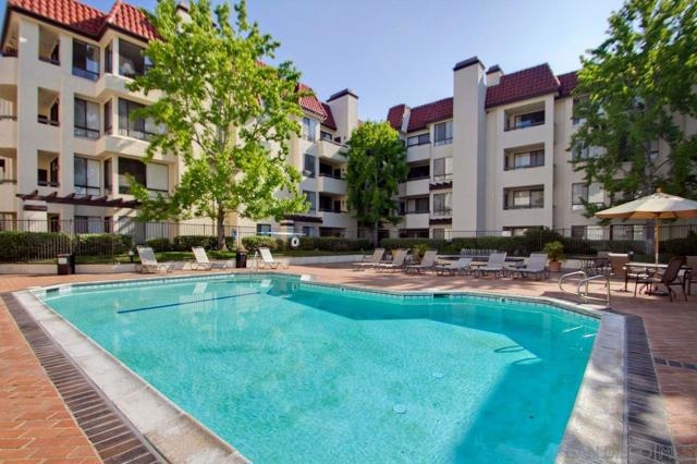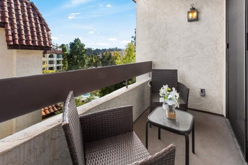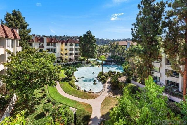 Stunning penthouse!!! Rarely available corner location, offers an impressive 1,969 sq ft of light-filled, turnkey living space with breathtaking views of the mountains, tranquil pond, and lush walking pathways. Step inside to discover this gorgeous remodel with brand-new flooring, fresh paint, upgraded lighting and elegant touches throughout. The remodeled kitchen features elegant stone countertops, a new farmhouse sink, stainless steel appliances, and a bright breakfast nook – perfect for casual dining. Both bathrooms have been tastefully remodeled with stone counters, white cabinetry, luxury vinyl plank flooring, and updated lighting and fixtures. The spacious primary suite is a true retreat, complete with a cozy sitting area with built-ins and a beautiful fireplace, plus a private balcony. The luxurious en-suite bathroom includes dual walk-in closets and ample space for comfort and functionality. Enjoy three balconies that take full advantage of the scenic surroundings, ideal for morning coffee or evening relaxation. The unit has two side-by-side parking spots, conveniently located near the elevators in the secure underground parking. Inside laundry with stackable unit that conveys. The Courtyards is a prestigious gated community offering resort-style amenities including pools, spa, tennis courts, exercise room, library, meeting room, and lush green areas throughout. All of this just minutes from Fashion Valley, the YMCA, public transportation, fine dining, and upscale shopping. This is a rare opportunity to own a top-floor Rothschild unit in pristine, move-in ready condition. Don’t miss your chance!
