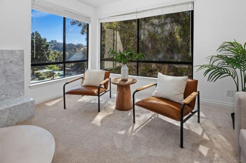 Welcome to the highly sought after gated community of The Courtyards in Mission Valley, where space, style, and serenity come together in one exceptional top floor corner residence. This rarely available 3 bedroom, 2 bath home offers an expansive 1,969 square feet of beautifully remodeled living space, filled with natural light and designed for both everyday comfort and entertaining. As a desirable top floor corner unit, you’ll enjoy added privacy along with three private balconies that invite in the breezes and allow the enjoyment of the gorgeous views. As a desirable top floor corner unit, you’ll enjoy added privacy along with three private balconies that invite in the breezes and allow the enjoyment of the gorgeous views. The floor plan is generous and thoughtfully designed, featuring a large living room with fireplace, a formal dining room for special gatherings, and a stunning, fully remodeled kitchen complete with breakfast nook. The finishes throughout are modern yet timeless; neutral tones, updated flooring, designer paint, and tastefully renovated bathrooms create a cohesive, move-in ready home that feels both elegant and welcoming. The primary suite is truly a retreat of its own, offering a spacious bedroom with a balcony plus an oversized sitting area with a custom fireplace, the perfect place to unwind at the end of the day. Two additional bedrooms provide flexibility for guests, office space, or whatever suits your lifestyle. In unit laundry adds everyday convenience. Residents of The Courtyards enjoy resort style amenities including peaceful walking paths around a tranquil pond, two sparkling pools, tennis courts, a clubhouse/meeting room, library, and beautifully maintained grounds. All of this just moments from upscale shopping, dining, banking, and every service you could need. Immaculate, extensively remodeled, and truly turnkey, this is elevated Mission Valley living at its finest!