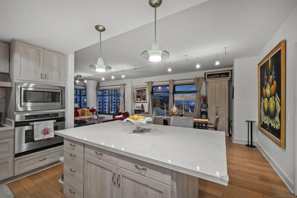 Claim your stake in vibrant urban living with this west-facing residence at Renaissance! Soak in sweeping bay and city views through expansive stacked, sliding windows in the living and dining area, bringing the outdoors in without the upkeep of a balcony. The open-concept kitchen has been thoughtfully upgraded with premium stainless appliances including Viking, GE, and Sub-Zero, complemented by quartz countertops, updated cabinetry, a generous center island, and stylish pendant, recessed, and track lighting. With a dual-suite layout, this home offers exceptional privacy and flexibility for guests, roommates, or a home office setup. The serene primary suite includes plush carpeting, a walk-in closet, and a spa-inspired bath with dual vanities. Additional features include beautiful wood flooring throughout the main living areas, storage unit, and tandem parking spaces. Live in the heart of the Marina District with world-class dining, shopping, and the waterfront just steps away Located on arguably one of the most convenient blocks in all of Downtown, just a few blocks to walk along the harbor, public transportation, excellent restaurants, shopping, Ralphs Signature grocery store next door, and the brand-new Rady’s Shell at Jacobs Park, a unique live music venue and home of the San Diego Symphony! Also enjoy proximity to the future life science and biotechnology research development The Research and Development District (The RaDD) at the Embarcadero and the sustainable tech-focused Campus at Horton in the center of the city. Delight in the casual elegance of Renaissance amidst the convenience of sophisticated urban living. Renaissance common areas have been recently refreshed and refurbished and include staffed lobbies, 24/7 security, pool & spa, barbecues, lounge areas, an outdoor fireplace, a well-equipped fitness center, and meeting rooms. Don’t miss your chance to call this special residence your own!