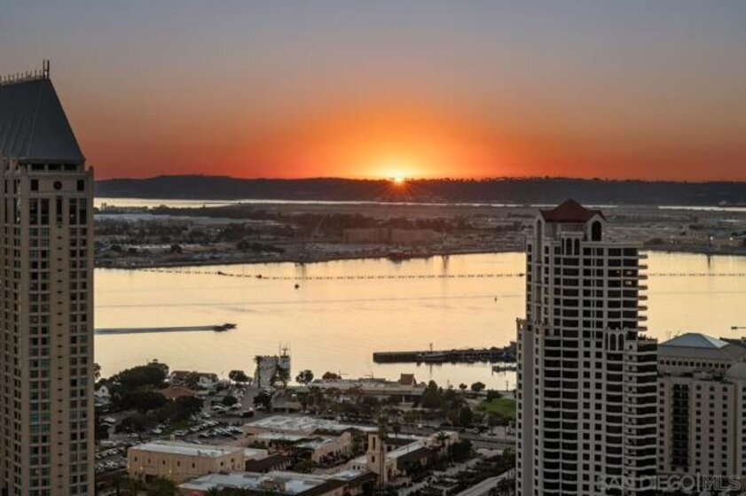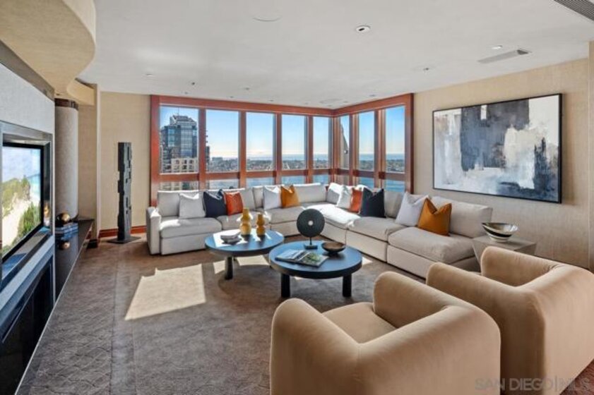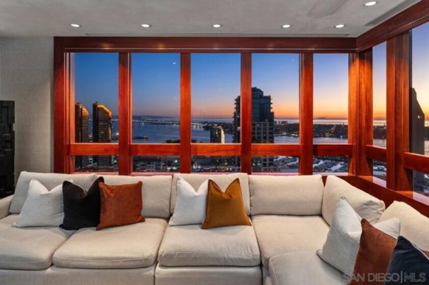 One Of A Kind. Penthouse 2701 stands as a unique testament to architectural brilliance, nestled in the dynamic core of downtown San Diego. Transformed and meticulously maintained, this residence boasts nearly 3,400 square feet of artfully crafted living space. It offers unobstructed vistas of the ocean, city, bay, and mountains. Designed to provide serene seclusion while showcasing art, light, and volume, the home gracefully unfolds through expansive open areas, sculptural forms, and fluid indoor-outdoor transitions that captivate from dawn to dusk. Positioned at the very top, this exceptional penthouse is a rare offering of scale, privacy, and prestige. Meticulously curated, with panoramic views spanning downtown San Diego, the waterfront, coastline, and ocean. A formal gallery-style entry sets the tone, leading to expansive living and dining areas framed by floor-to-ceiling windows, automated custom blinds, and wraparound terraces. The exhibition kitchen is a showpiece, featuring custom book-matched Cuban mahogany cabinetry, single-slab granite counters, premium appliances including Sub-Zero and Gaggenau, an eat-at island, integrated workspace, and balcony access. Entertaining is seamless with a theater-style media wall, central audio-visual system, specialty lighting for artwork, and designer wall treatments throughout. The primary suite is a private retreat with upholstered walls, wool carpeting, stunning views, dual custom dressing rooms, and a spa-inspired bath with steam shower, jetted tub, and bespoke finishes. A second bedroom/office suite offers custom cabinetry, built-in desk, morning bar, and ensuite bath. Additional highlights include two balconies, 12’6” custom ceilings, sound-enhanced construction, motorized shades with UV-protective glass treatments, and two parking spaces. Renowned for its cutting-edge technology and forward-thinking design, this penthouse offers enduring appeal and timeless style. Truly an irreplaceable opportunity, tailored for those who cherish space, perspective, and distinction above all else. The Meridian offers unparalleled amenities: 24-hour concierge and 24-hour valet parking, 2 state-of-the-art fitness centers with sauna and steam room, and a resort-style deck with heated pool and spa, cabanas, lounging area with firepit, outdoor grills, and lush gardens. Designed for both elegance and privacy, this iconic building delivers a lifestyle of ease, beauty, and cultural connection—just steps from San Diego’s finest dining, arts, and waterfront experiences.