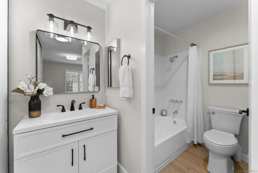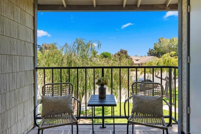 Amazing opportunity to own this bright, beautifully updated 1BR/1BA upstairs corner unit in central Mira Mesa with no one above & peaceful views of trees, hills & neighborhood. Tucked along the outer edge of the complex, this home offers rare privacy, added convenience & easy access to extra street & guest parking. Inside, enjoy a freshly painted interior w/ new LVP flooring throughout, recessed LED lighting, updated fixtures, modern ceiling fan & plantation shutters. The kitchen features woodgrain cabinets, granite counters & newly installed SS appliances including a smart WiFi-enabled range w/ multiple cooking modes, DW & microwave. The living area opens to a large covered southeast facing balcony that feels like an extended outdoor living room ~ your own elevated outdoor retreat. Picture mornings w/ sun filtering through the trees, coffee in hand, evenings unwinding in the breeze, or weekends relaxing in your private retreat. Having your own laundry and extra storage space tucked off the balcony and newer HVAC will keep your life simple & comfortable year-round. Unbeatable access to shopping, dining, groceries & the Mira Mesa Community Park & Rec Center, now undergoing a major revitalization to expand sports fields, aquatics & community spaces. Easy freeway access & proximity to Miramar & nearby tech campuses round out the connected lifestyle. Much more than a home ~ This is where comfort meets convenience, privacy feels like a retreat, and every detail helps create the lifestyle you’ve been looking for.