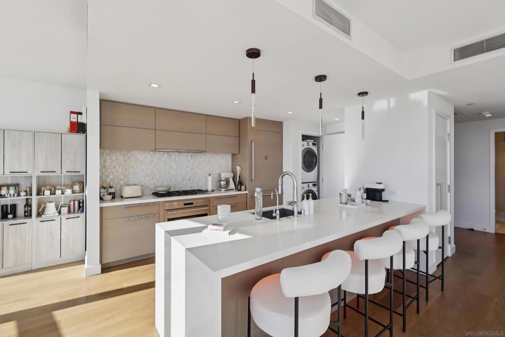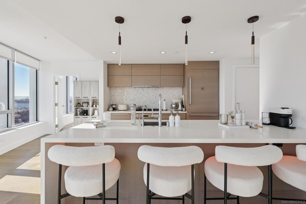 This exceptional southwest-facing 2bed2bath 1556sf residence at iconic Pacific Gate offers panoramic views of the downtown skyline, Pacific Ocean and Coronado Bridge. Floor-to-ceiling glass fills the open floor plan with natural light and opens to a spacious private balcony ideal for sunset views. Designer finishes include wood floors, custom built-ins, wine refrigerator, and a chef’s kitchen with Wolf, Sub-Zero, and Miele appliances. Enjoy world-class amenities including 24-hour concierge, luxury car fleet, EV charging, rooftop pool and cabanas, screening room, and pet retreat—offering the ultimate downtown San Diego luxury lifestyle. From the moment you enter, abundant natural light, designer accents, and breathtaking vistas create an unforgettable first impression. The open-concept layout features a spacious living and dining area that flows seamlessly to a large private balcony—perfect for enjoying spectacular sunsets and the energy of the city below. The thoughtfully designed split floor plan offers optimal privacy, ideal for guests or a sophisticated home office. This turnkey residence is the perfect blend of refined comfort, architectural excellence, and world-class convenience—offering a rare opportunity to live above it all in downtown San Diego’s most prestigious address.