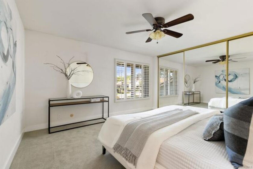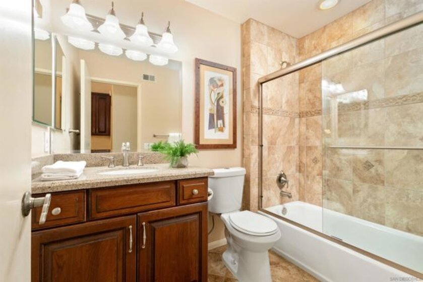 Tierrasante Treasure. Beautiful large 1,989 sq. ft. Townhome has 4 bedrooms upstairs; 4th bedroom has closets but often used as a flex room. Direct 2 car-garage access; in unit laundry; Dual pane windows. This home is situated as an "inner unit" not on freeway or main road. Plantation shutters throughout. Home has air-conditioning. All electrical can lights changed to LED. Moen water shut off installed in garage. Garage recently updated. Newer roof installed in 2025. Updated within the last few years with LVP flooring on entry level and carpet upstairs. Newer Kitchen & appliances. Newer bathrooms. Villa Monterey is well located off freeway 15 with lush green open spaces, 3 pools & 2 Spas, tennis courts, (RV parking with additional fee). Tierrasante often called T-town by the locals offers access to Trails, Rec center, multiple parks, shops and schools